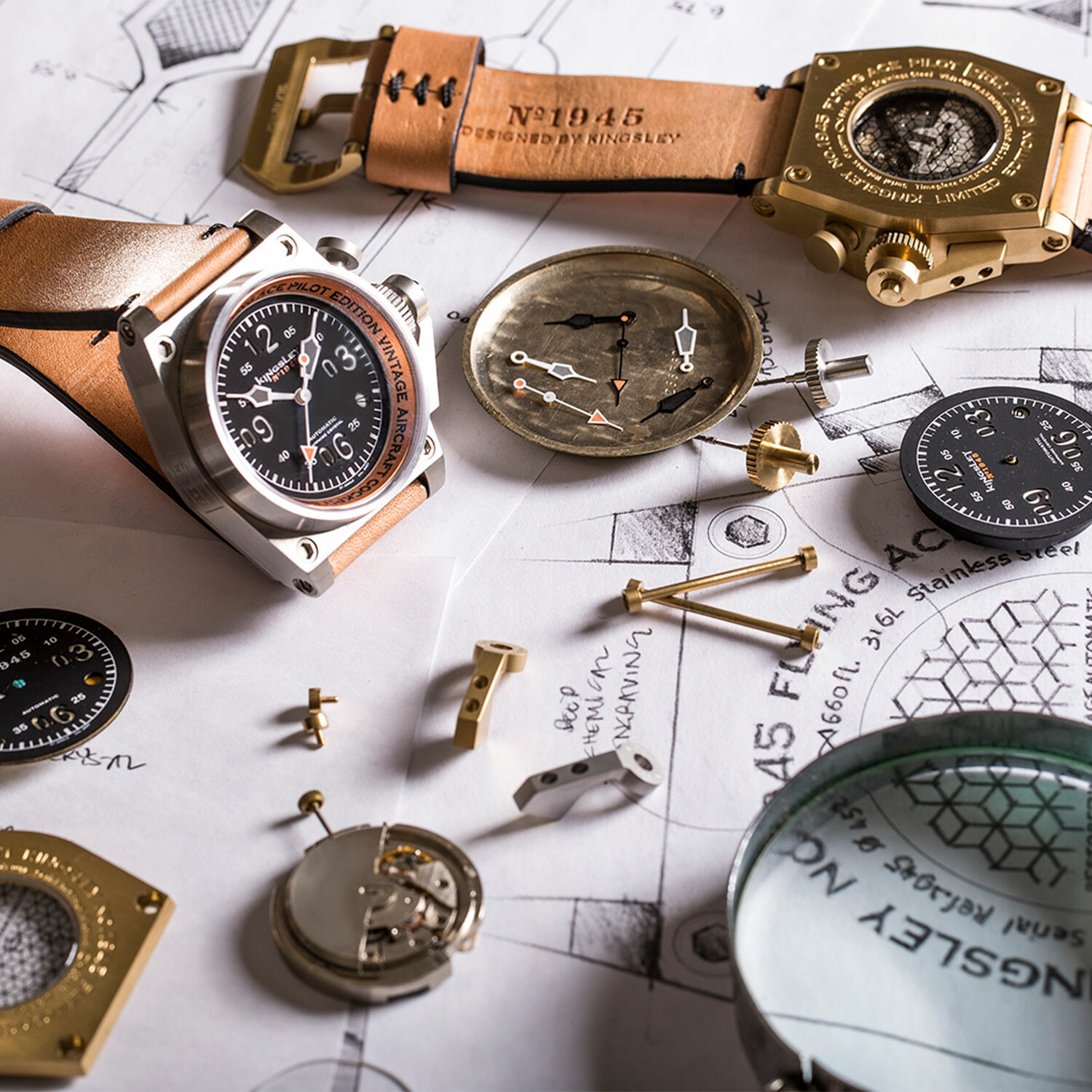 Inspired by the 1940s WW2-era fighter plane gauges and grenades, the Kingsley Type 1 Automatic is an exclusive limited edition vintage-inspired timepiece. Machined out of 316 stainless steel, the Type 1 features the iconic square and round hex bolted case similar to that of a cockpit gauge. It has a distinctive crown guard styled after a 1940's MK2 hand grenade lever. Designed, engineered, and assembled in Providence, RI, the Type 1 is powered by a 24 Jewel Seiko Automatic movement customized with unique vintaged-inspired Cotes De Geneve engraved parts, and individually numbered.