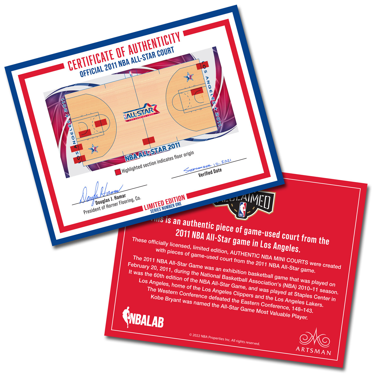 Each limited-edition mini court featuring your favorite NBA team's home court design was manufactured with game-used court wood from the 2011 NBA All-Star Game and includes a Certificate of Authenticity (COA) that also indicates the origin of where your piece of floor you receive was taken from that very game as indicated on the COA. You will recieve the home court design as seen in the pictures and title of this item.