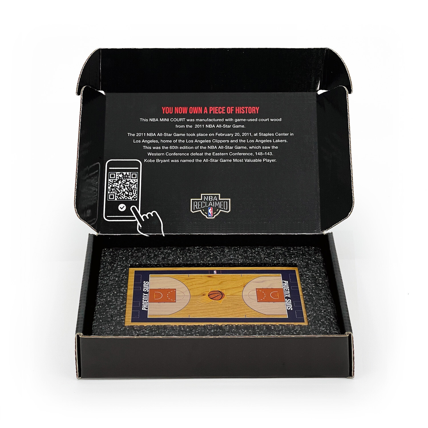Each limited-edition mini court featuring your favorite NBA team's home court design was manufactured with game-used court wood from the 2011 NBA All-Star Game and includes a Certificate of Authenticity (COA) that also indicates the origin of where your piece of floor you receive was taken from that very game as indicated on the COA. You will recieve the home court design as seen in the pictures and title of this item.