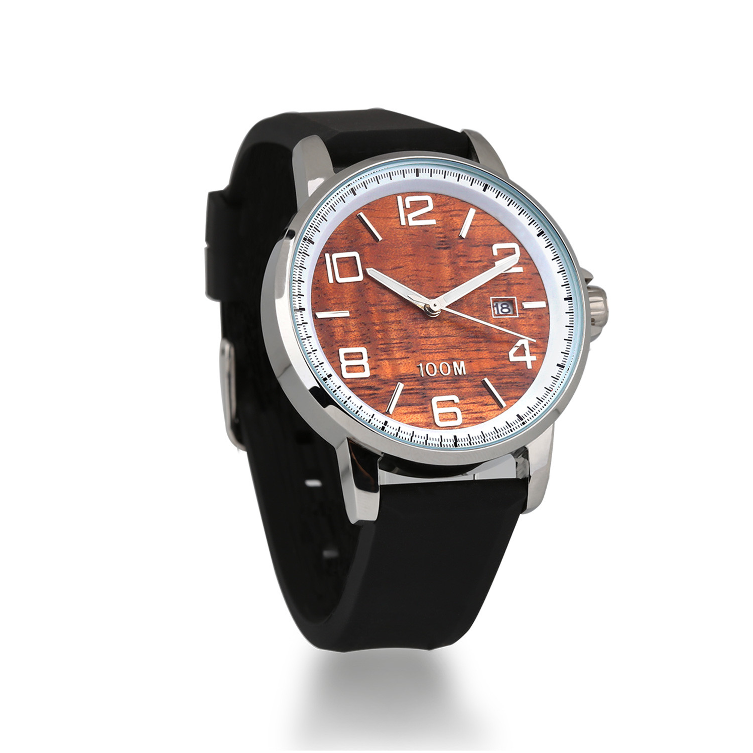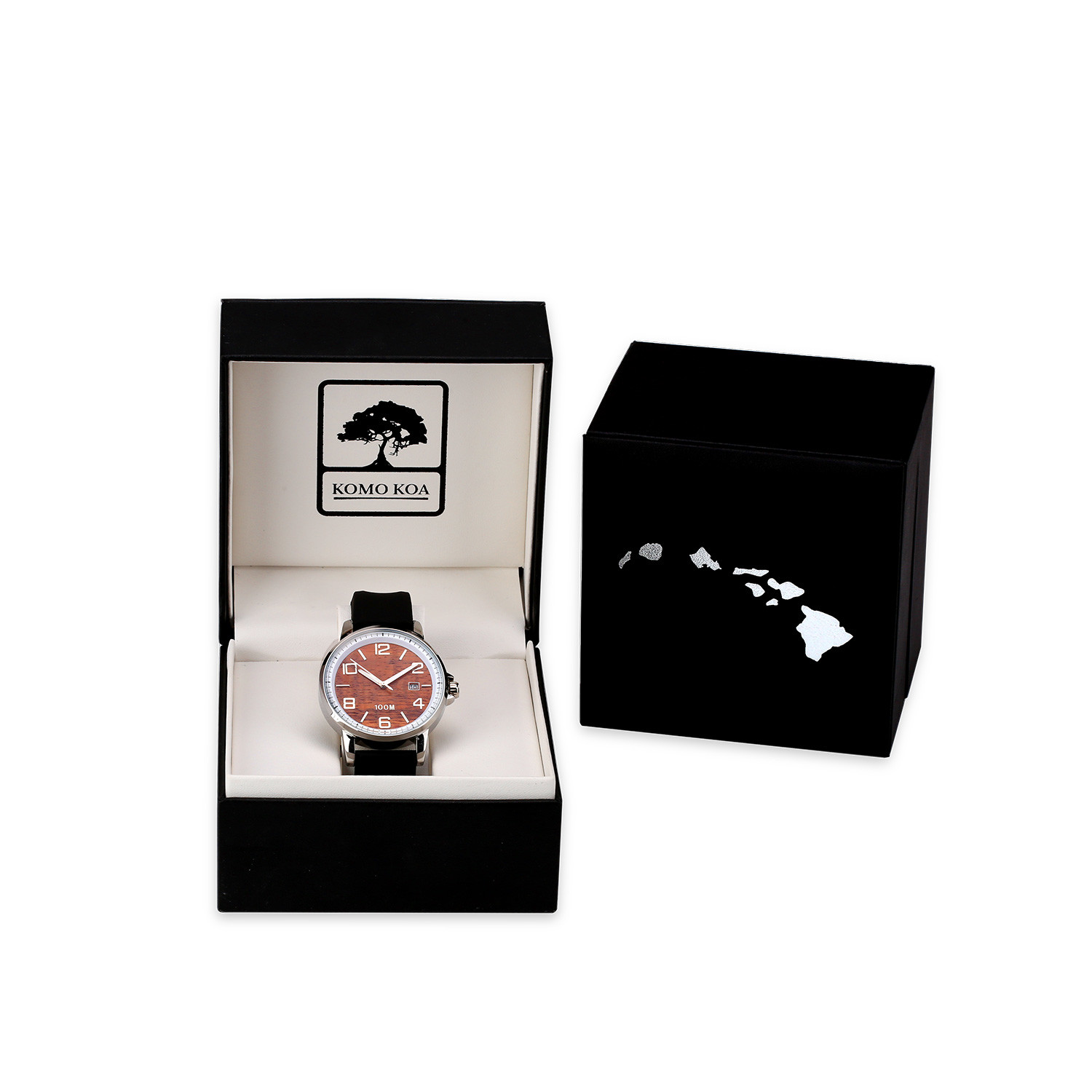 Made for watermen, this men's waterproof Hawaiian Koa Watch features an authentic Hawaiian Koa wood face beneath a white bezel with a silicone band. The Hawaiian Islands are engraved on the clasp, and it features quality construction with metal numbers, glowing hands and date.