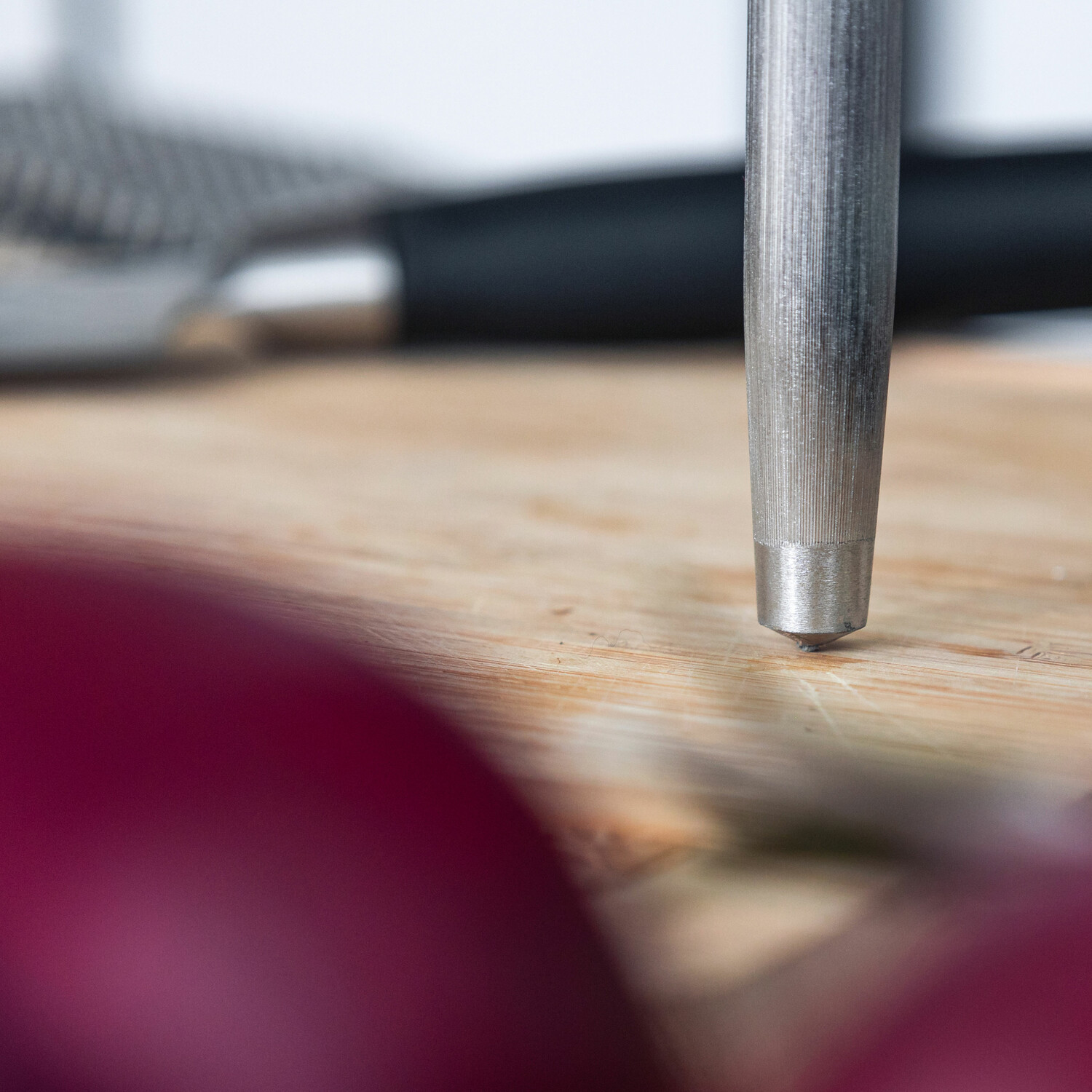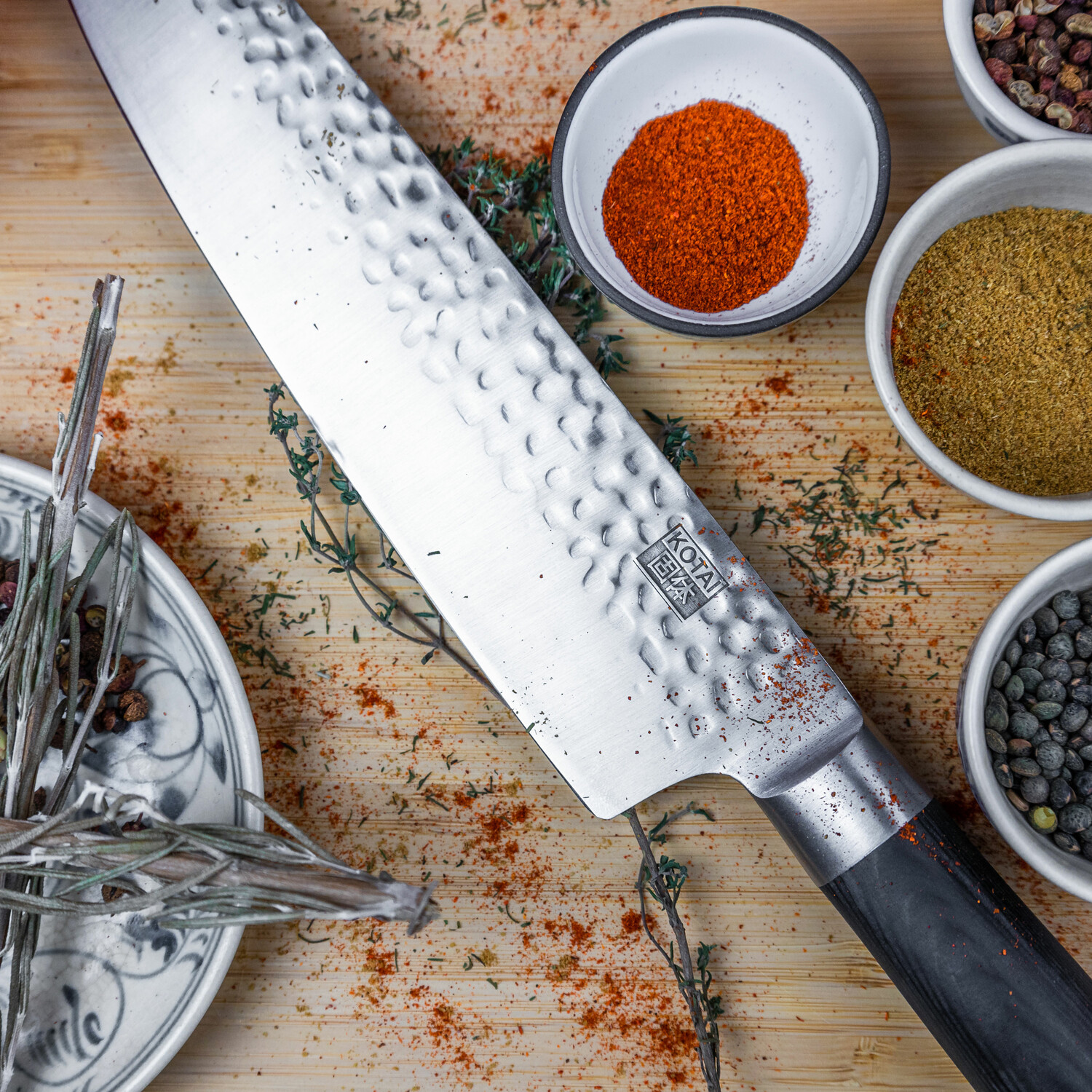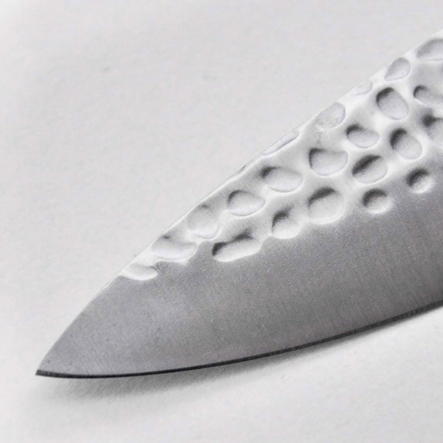 Besides its aesthetic appeal, the “Tsuchime” (槌目) (hammered) pattern creates tiny pockets of air between the blade and the food being cut. This ancestral Japanese method reduces drag, thus preventing food from sticking to the blade.