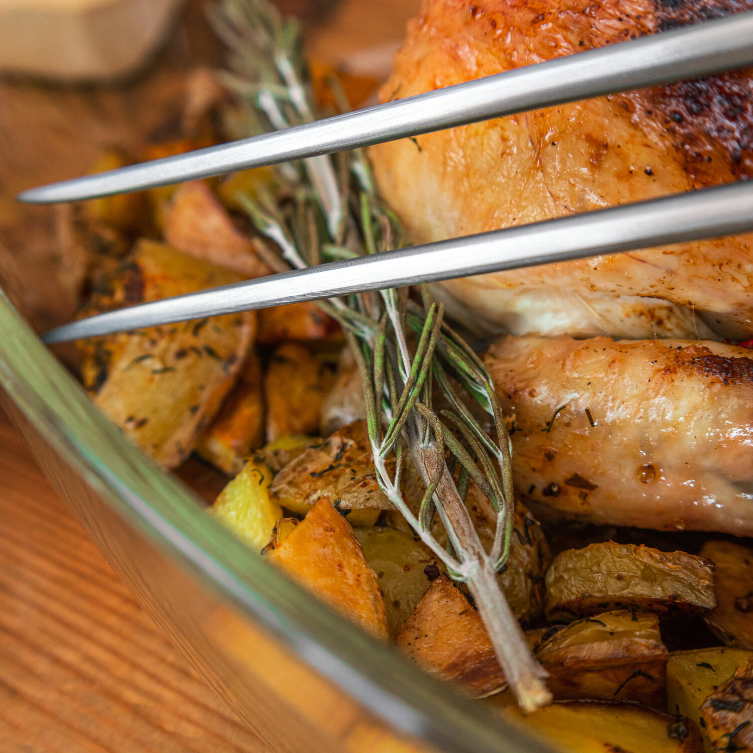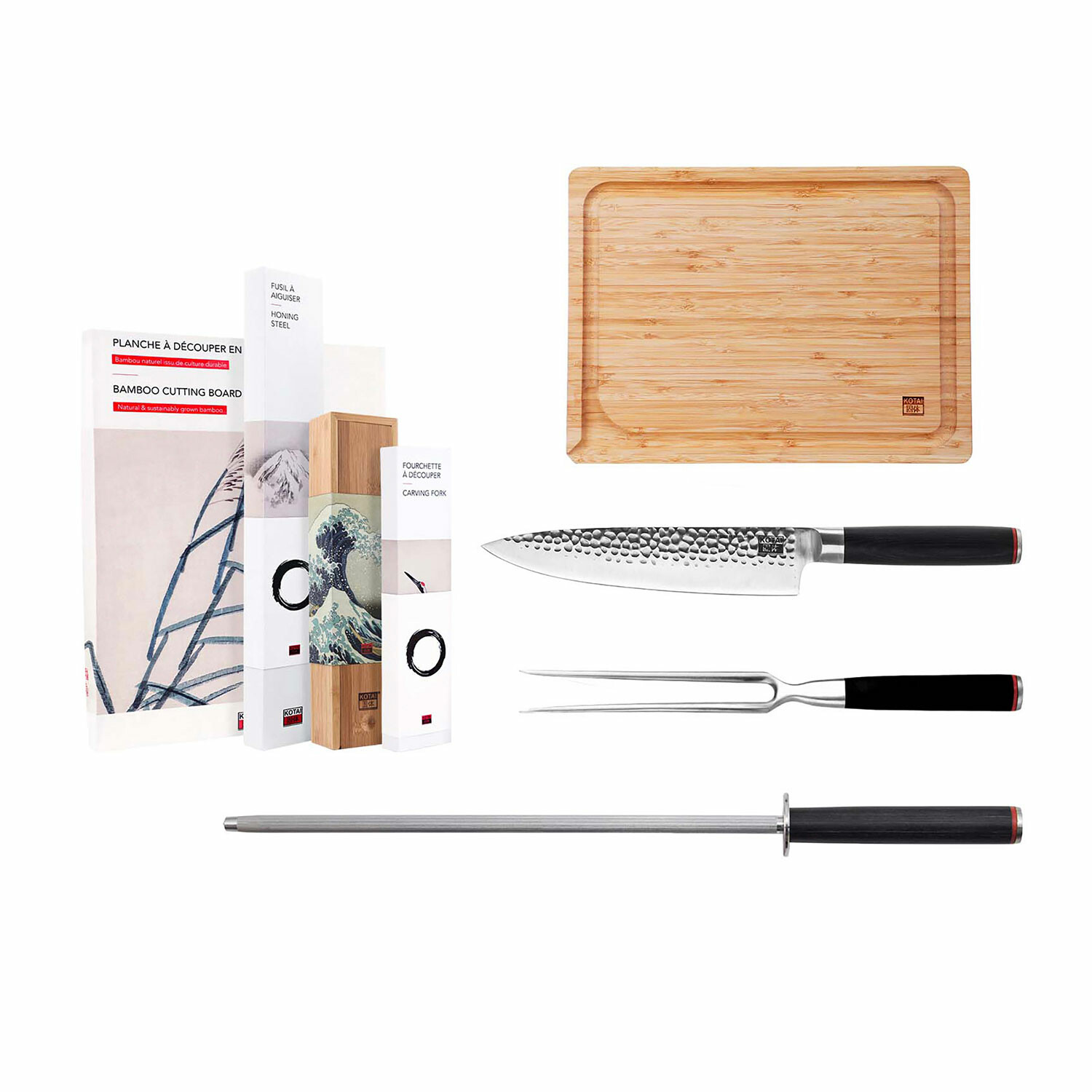 The BBQ Set Deluxe has blades that are sharpened to a double bevel grind giving the edge an optimal angle of 15 ̊ per side (vs. 20-25 ̊ for most Western knives), Kotai knives perfectly balance extreme sharpness and blade solidity.