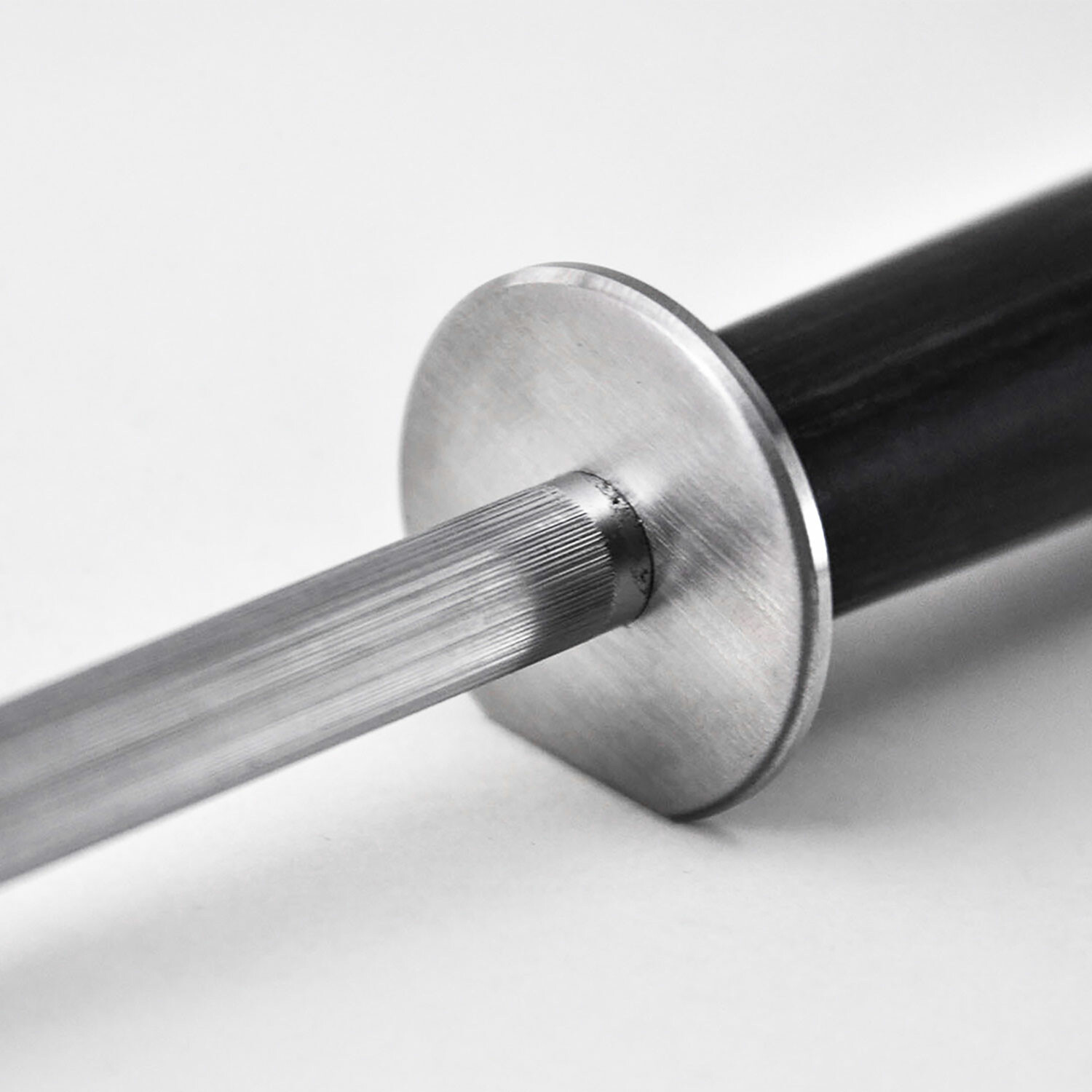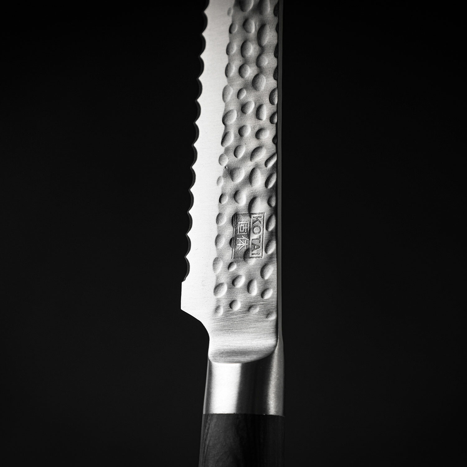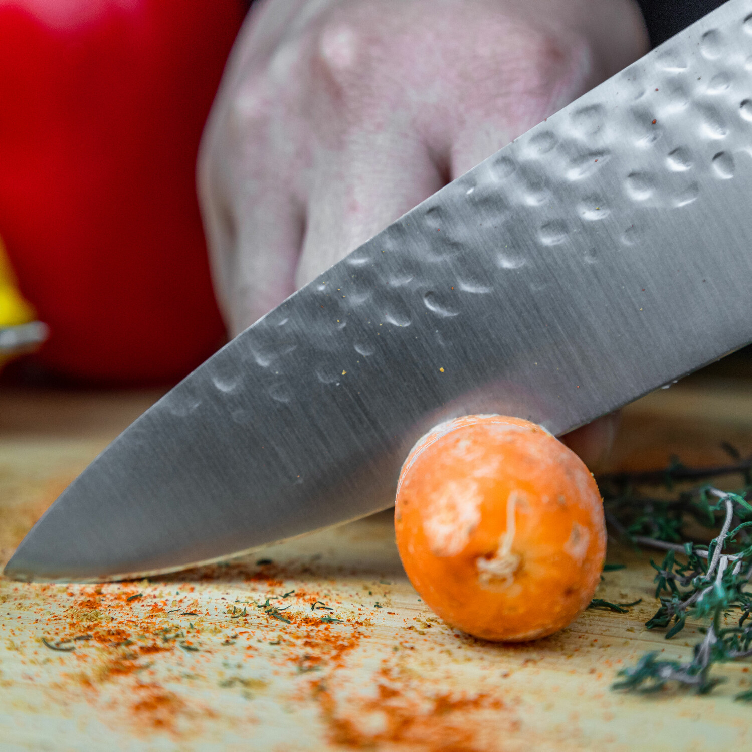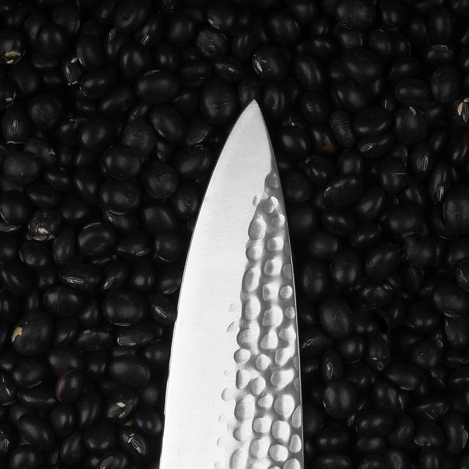 Besides its aesthetic appeal, the “Tsuchime” (槌目) (hammered) pattern creates tiny pockets of air between the blade and the food being cut. This ancestral Japanese method reduces drag, thus preventing food from sticking to the blade.
