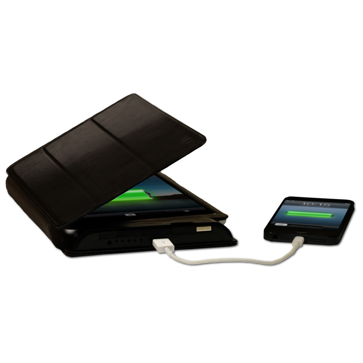 The KudoSol is a mobile power generator case for your phone and iPad. This elegant folio style case for the iPad Air comes complete with an integrated lightning pin that can extend your iPad's battery life, back up and sync data on-the-go. The ultra-thin battery can also be used to power other electronics through its secondary USB power-out port. With active technology built into the cover, this case will power your devices wherever, whenever, which makes it perfect for business, hiking, and traveling.