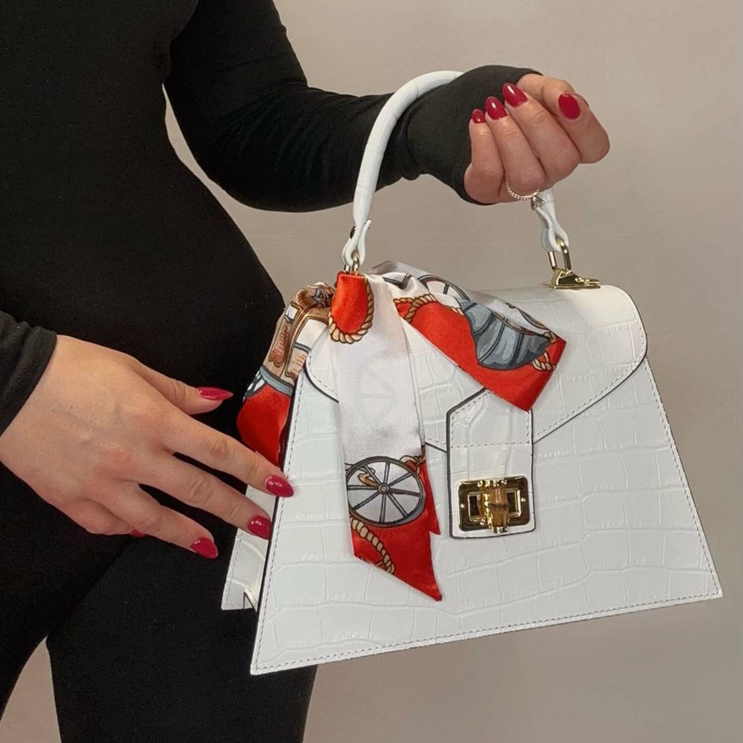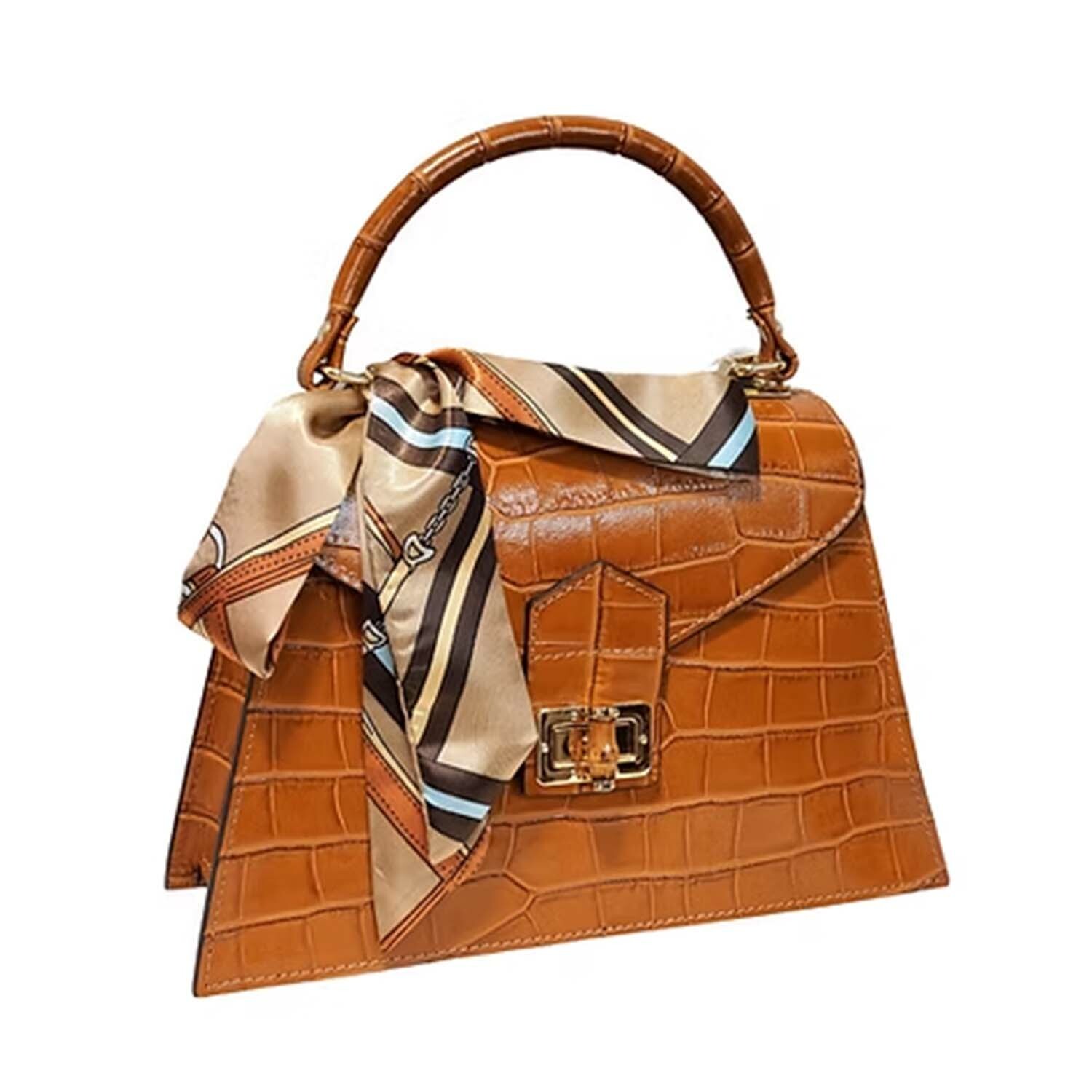 The Teresa Medium Handbag and Crossbody is crafted from genuine handmade vegetable tanned Italian leather with a croco finish, featuring a distinctive triangle silhouette accented by a bamboo swivel closure. A croco leather handle offers a polished top carry option, while a detachable leather and chain strap converts the bag into a crossbody for versatile wear.
