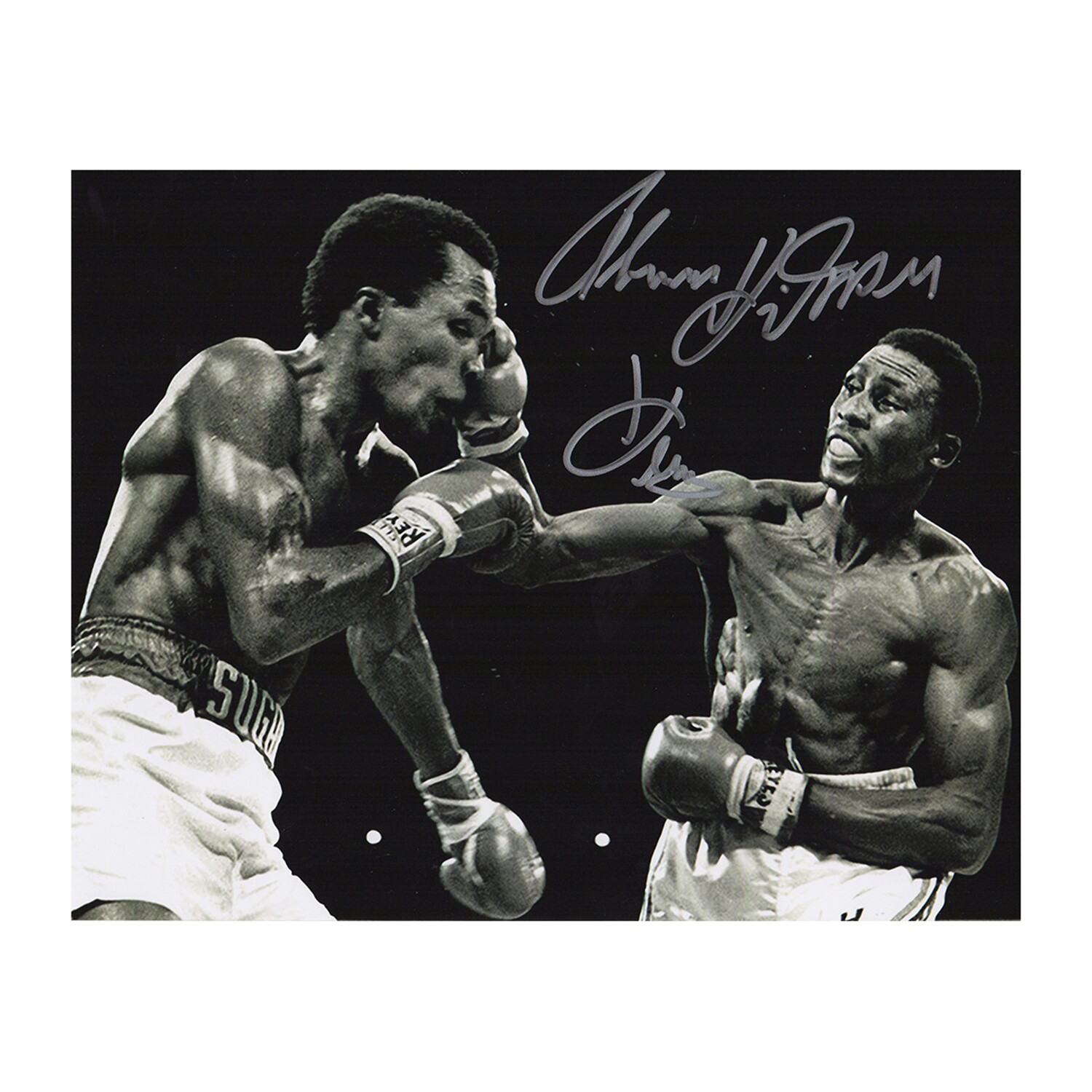 Thomas Hearns // B&W "Boxing, Punching Sugar Ray Leonard" // Signed 8x10 Photo // "Hitman" Inscription