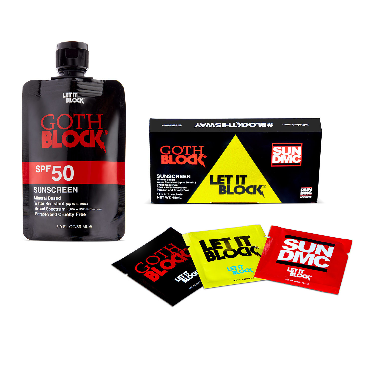 — One Box Of "Boombox Mix": 4 Mini Packets of "Let It Block", 4 Mini Packets of "Sun DMC", and 4 Mini Packets of "Goth Block" (4ml Each)