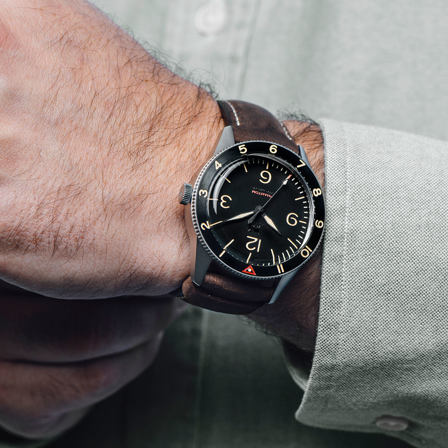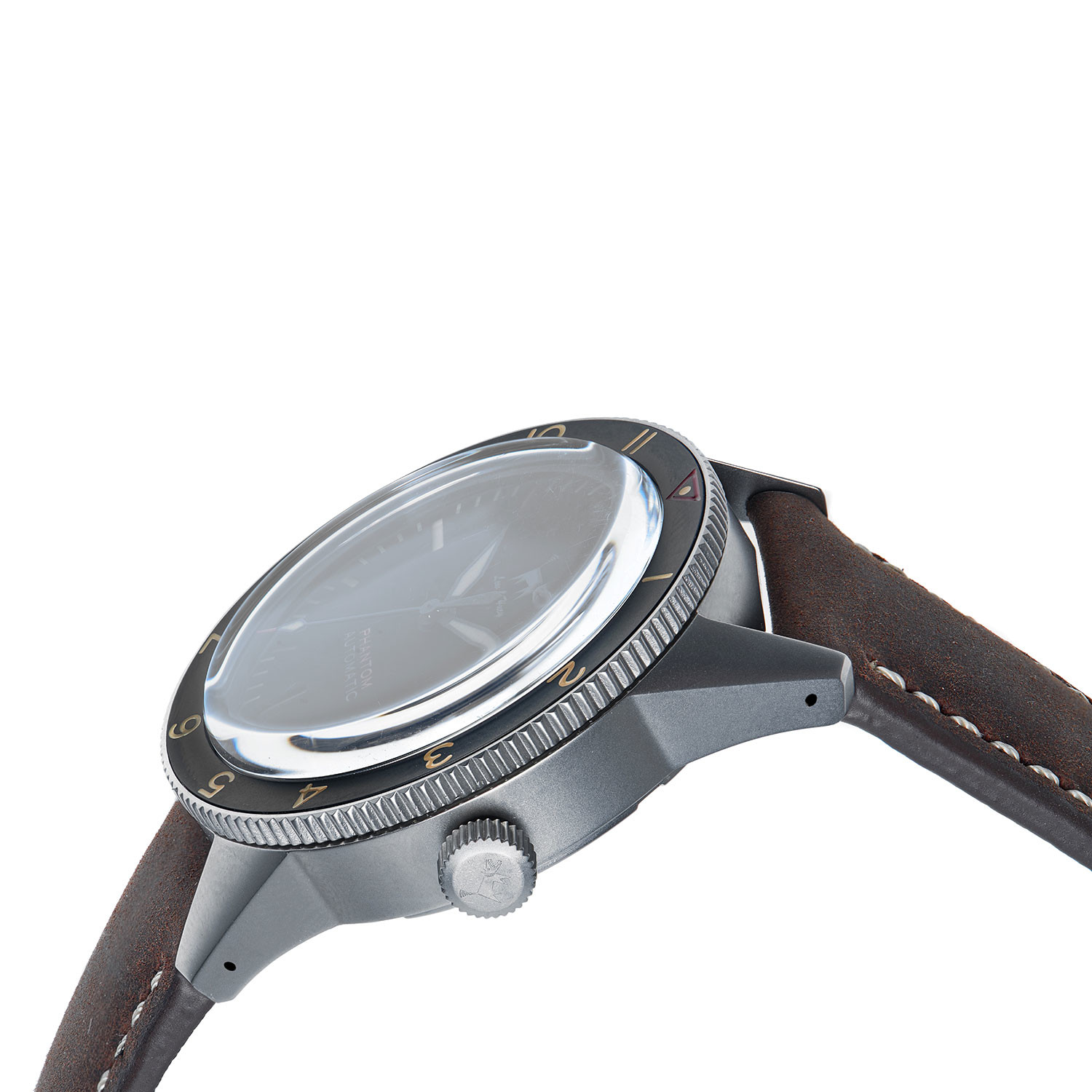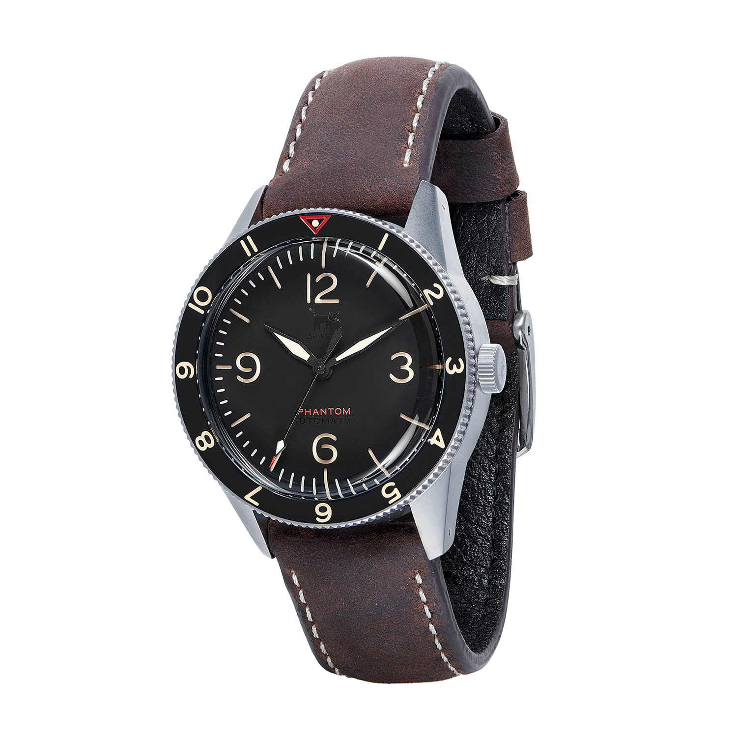 With a luminous face, the automatic Phantom watch from Lew & Huey is a pilot's watch with an extra edge. With a simple dial and a comfortable strap, it's your ideal travel companion.