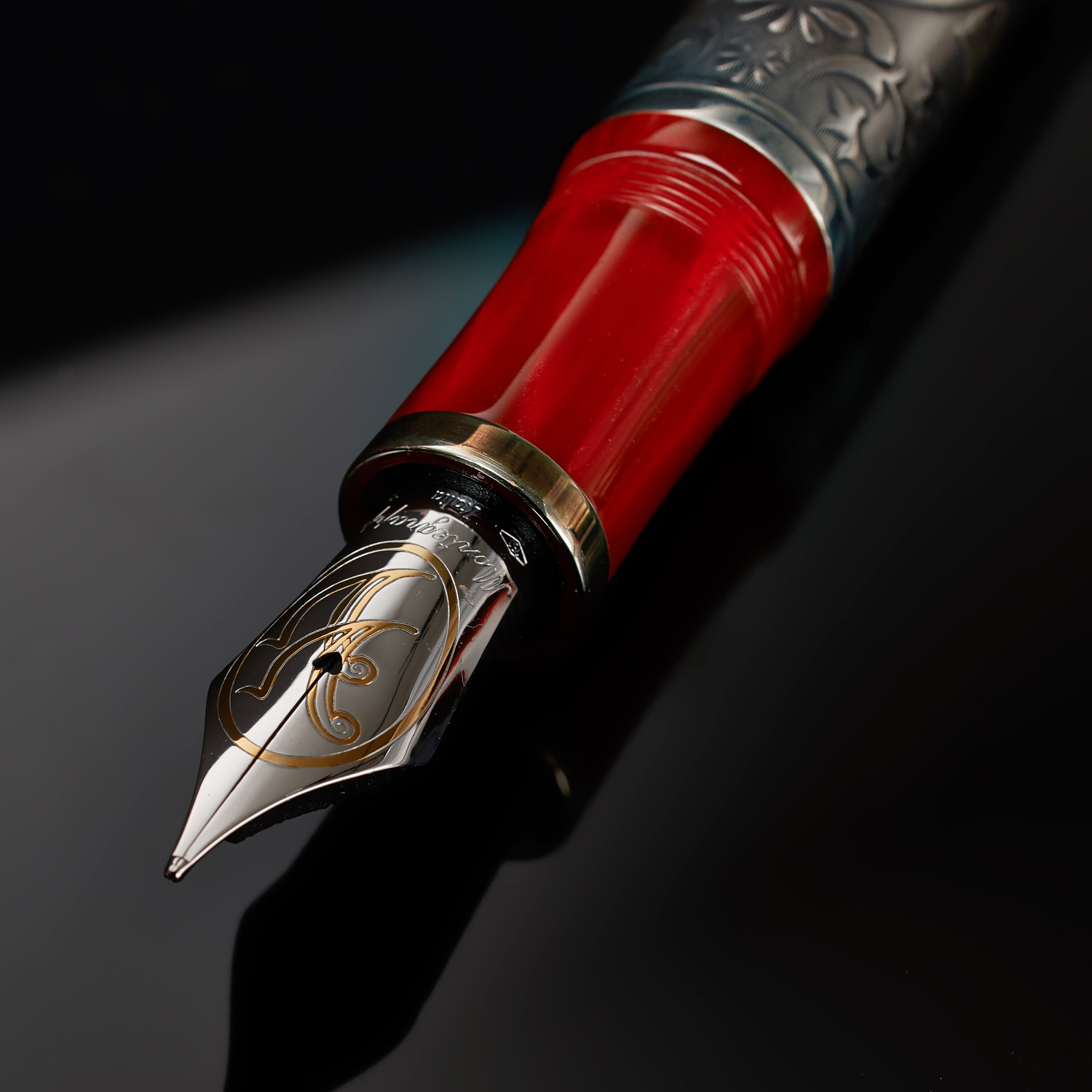 The Montegrappa Invito a La Traviata Fountain Pen is simply unparalleled. From start to finish, this fountain tipped pen is made in the finest materials and rare metals for an exceptional, limited-edition piece. Its sterling silver construction and celluloid body are topped off by an 18K yellow gold nib.