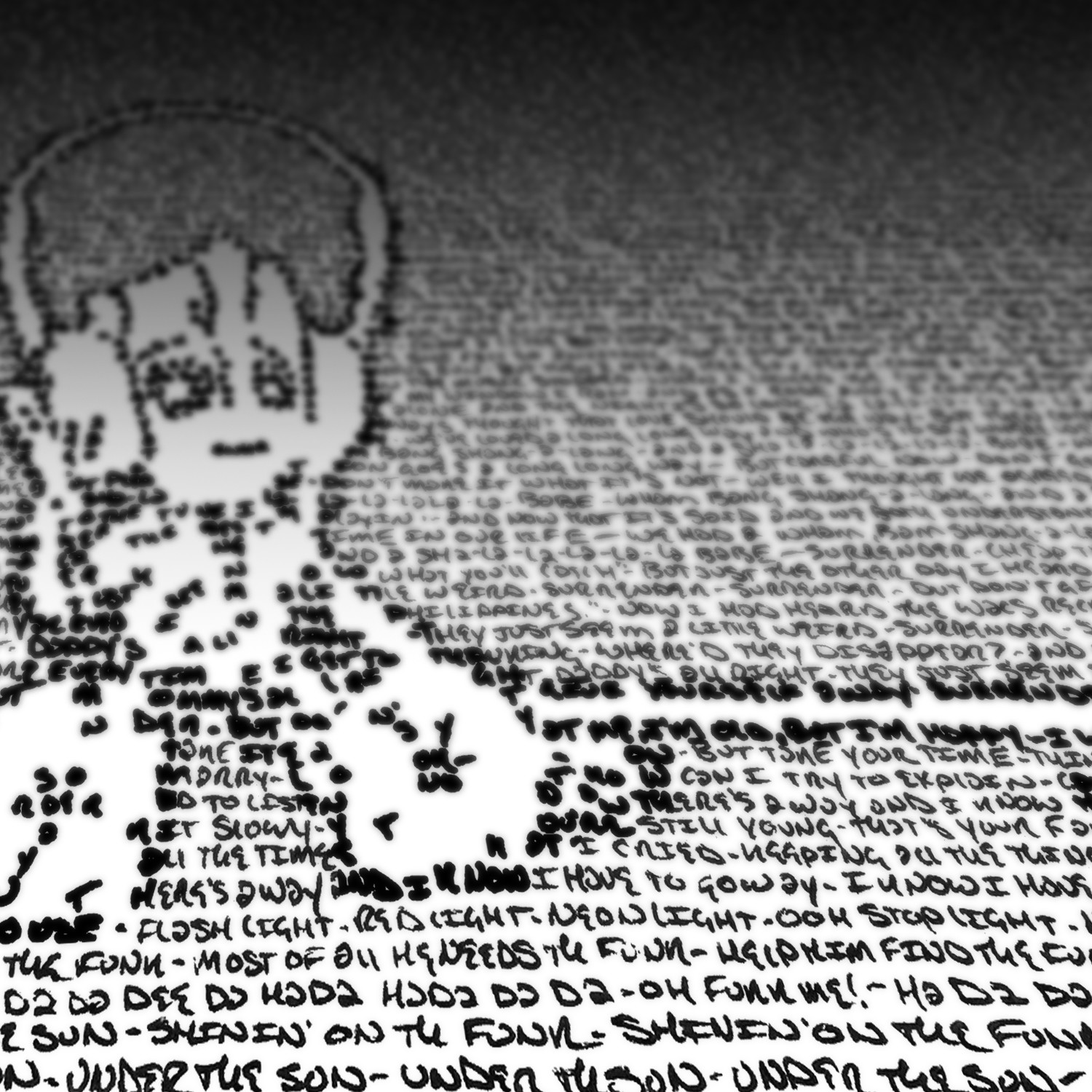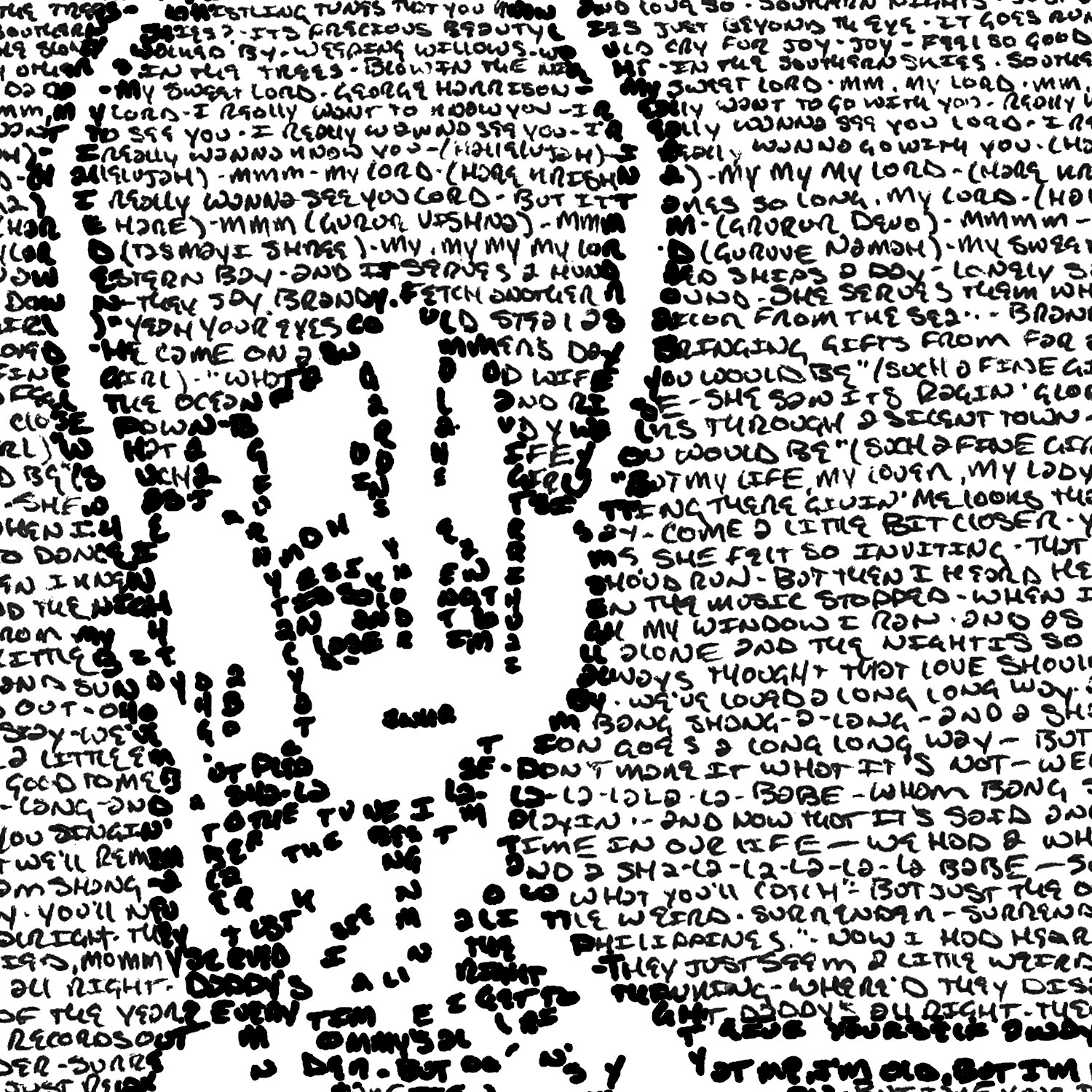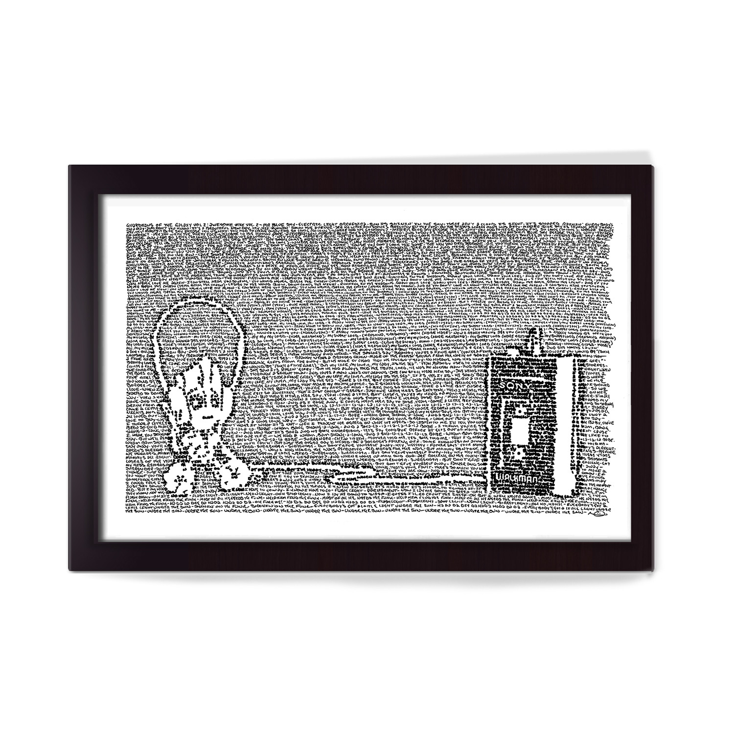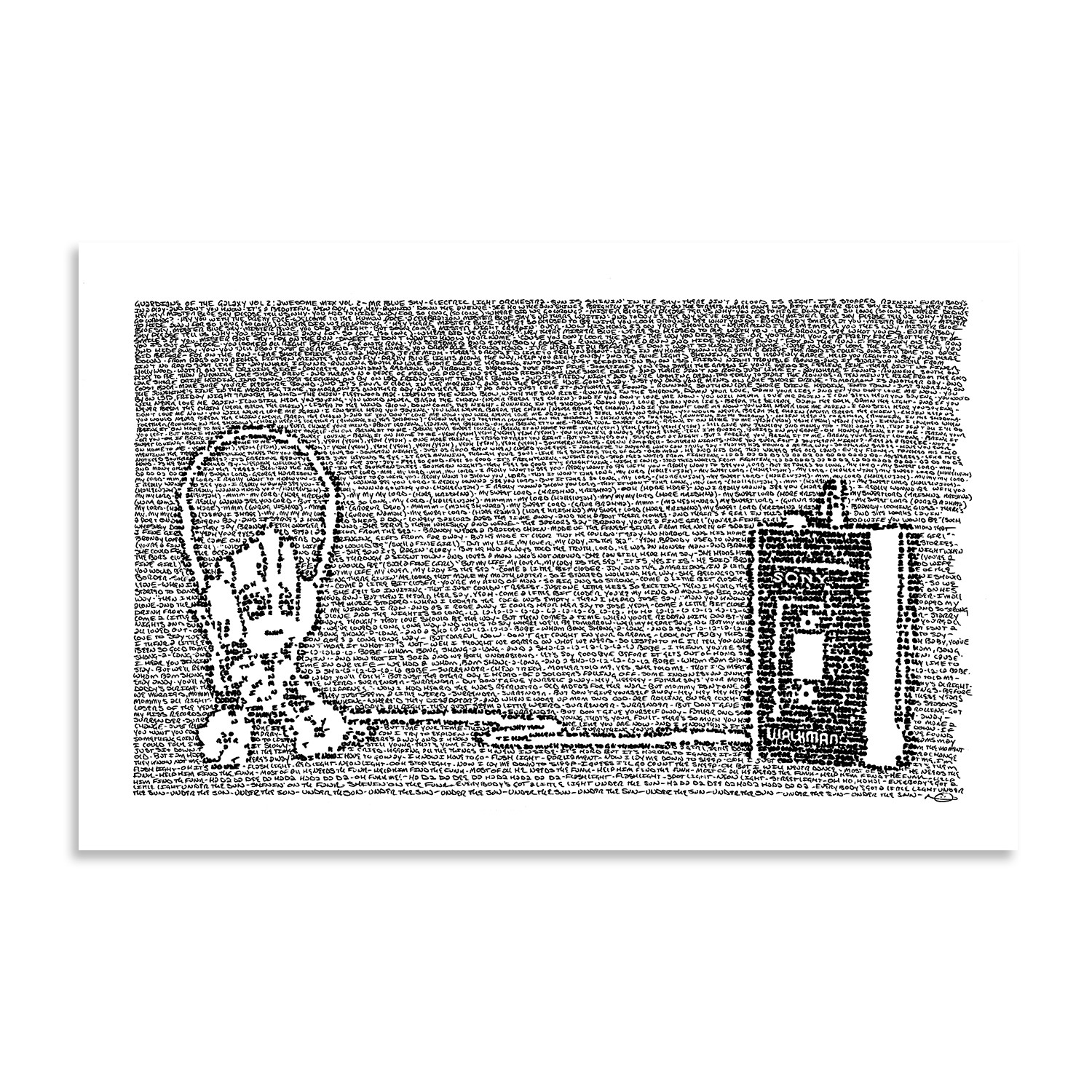 This handwritten poster portrait of Guardians Of The Galaxy has been comprised entirely out of the catalogue of lyrics from the soundtrack to Guardians Of The Galaxy: Vol 2. Done originally with black ink on layout bond, this reproduction is printed on 100 lb uncoated gloss paper.