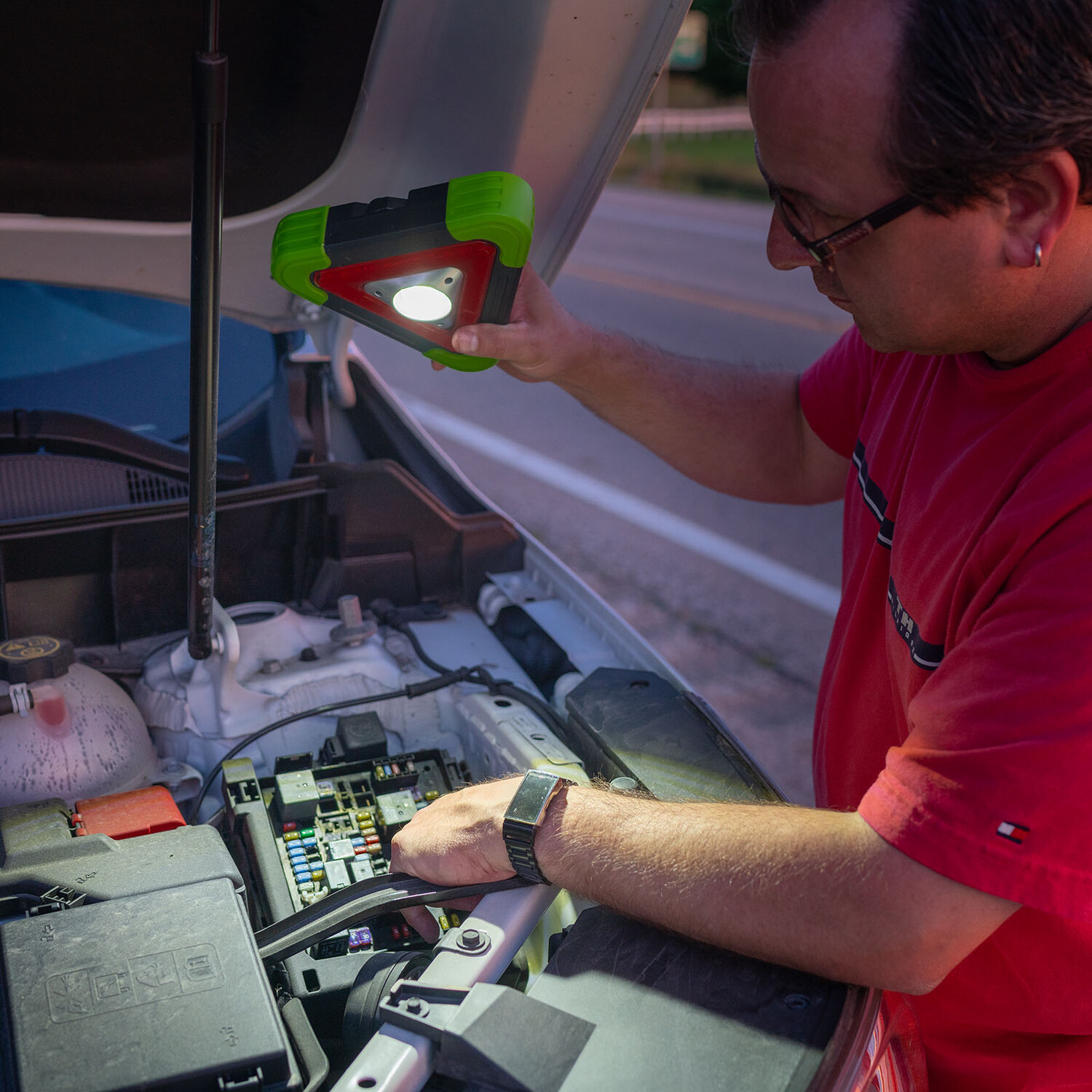 — 5 Light Modes: High Flood (3 Hours), Low Flood (6 Hours), Solid Red Triangle, Flashing Red Triangle, & S.O.S. Red Triangle