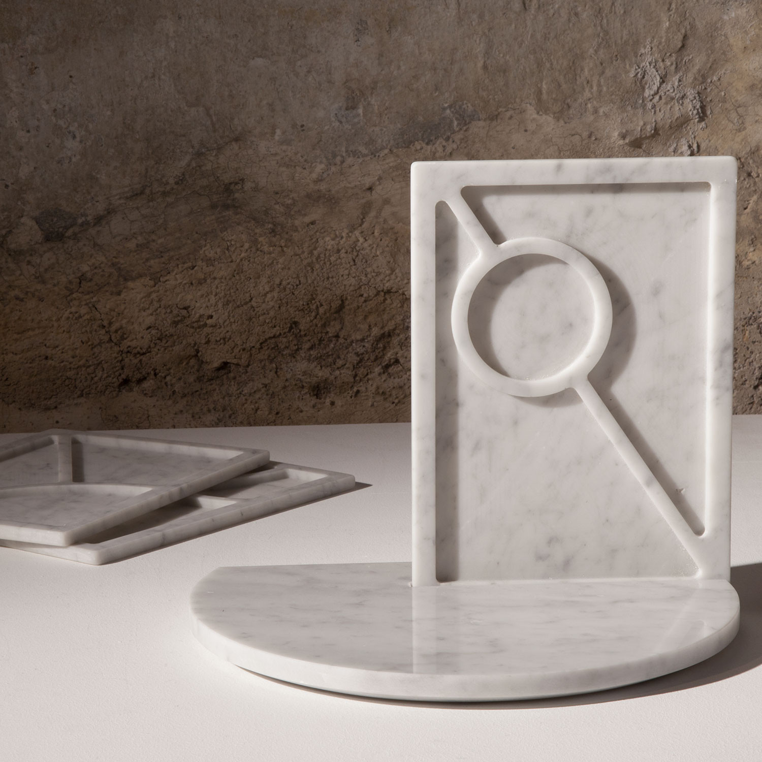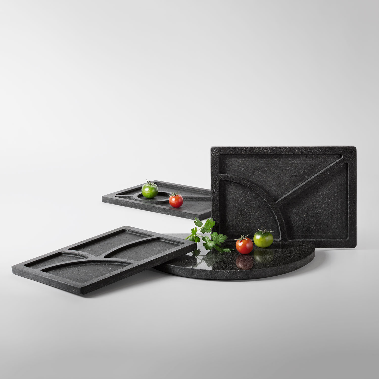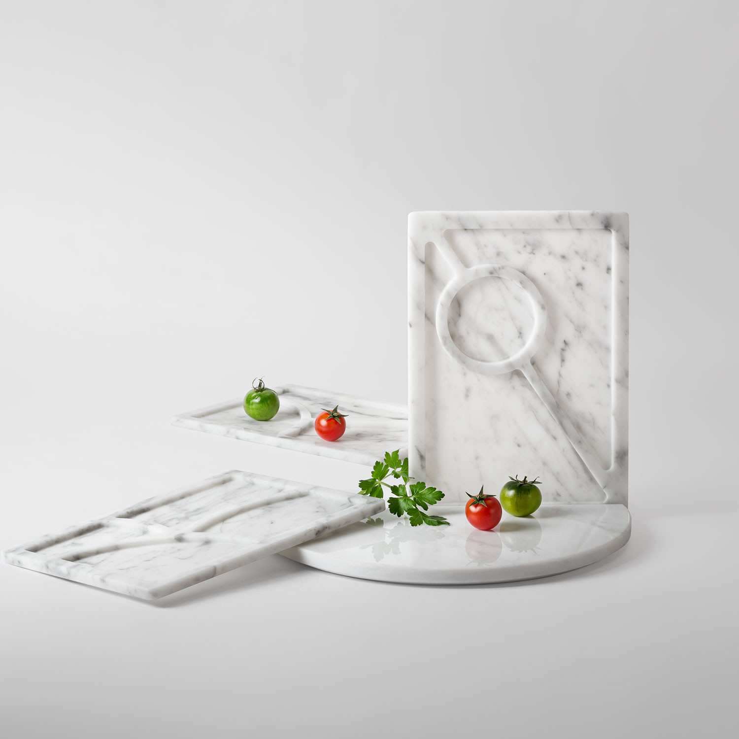 Made from white Carrara marble or Etna basalt, this Fidia set includes 3 trays varying in patterns and one cutting board. When not in use, trays can be stored inside the board while showing their patterns. It's a small sculpture that's truly worth exhibiting.