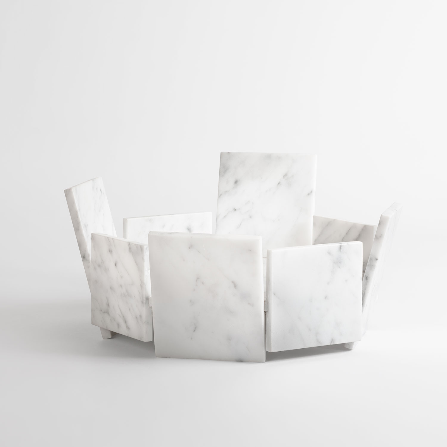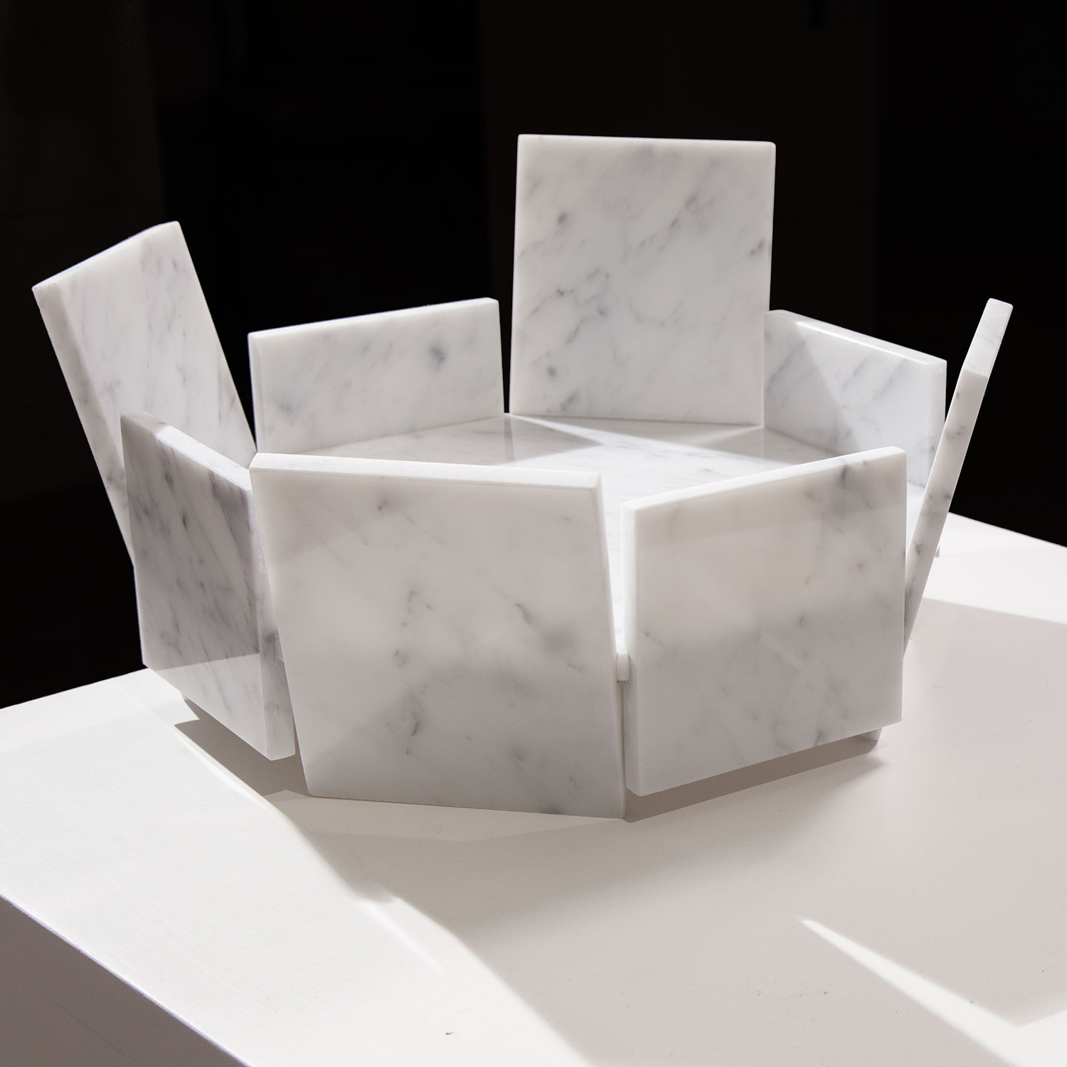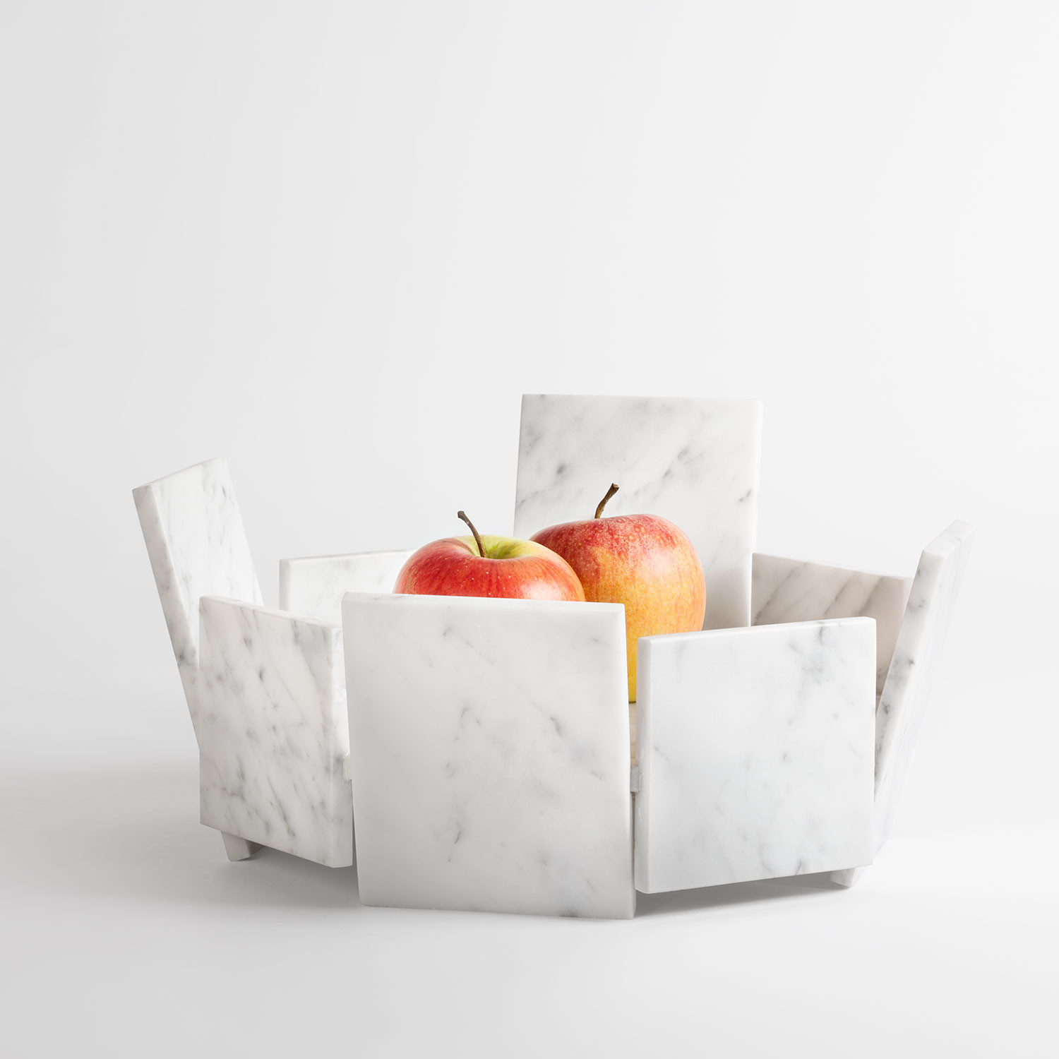 The beautiful Petalo fruit bowl is made from white Carrara marble. It features an octagonal base and rectangular side elements varying in height and tilt angle. It's lightweight, dynamic and sculptural, all at once.
