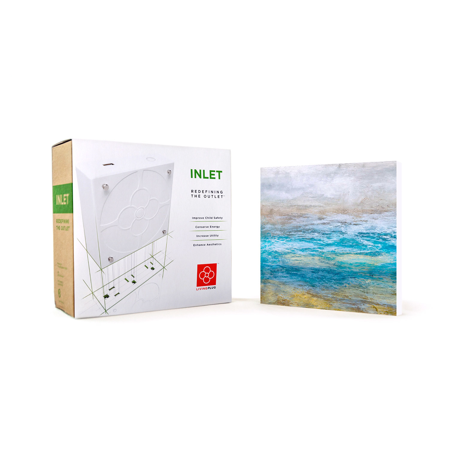 LivingPlug's INLET and Faceplate Bundle will have you rethinking your wall outlets. The INLET, which plugs into your pre-existing duplex outlet, increases child safety, conserves energy and enhances the outlet's overall utility with 3 Tamper Resistant receptacles, a high capacity USB port and a master kill switch; and the artistic faceplate gives your outlet a whole new level of style and aestheticism.