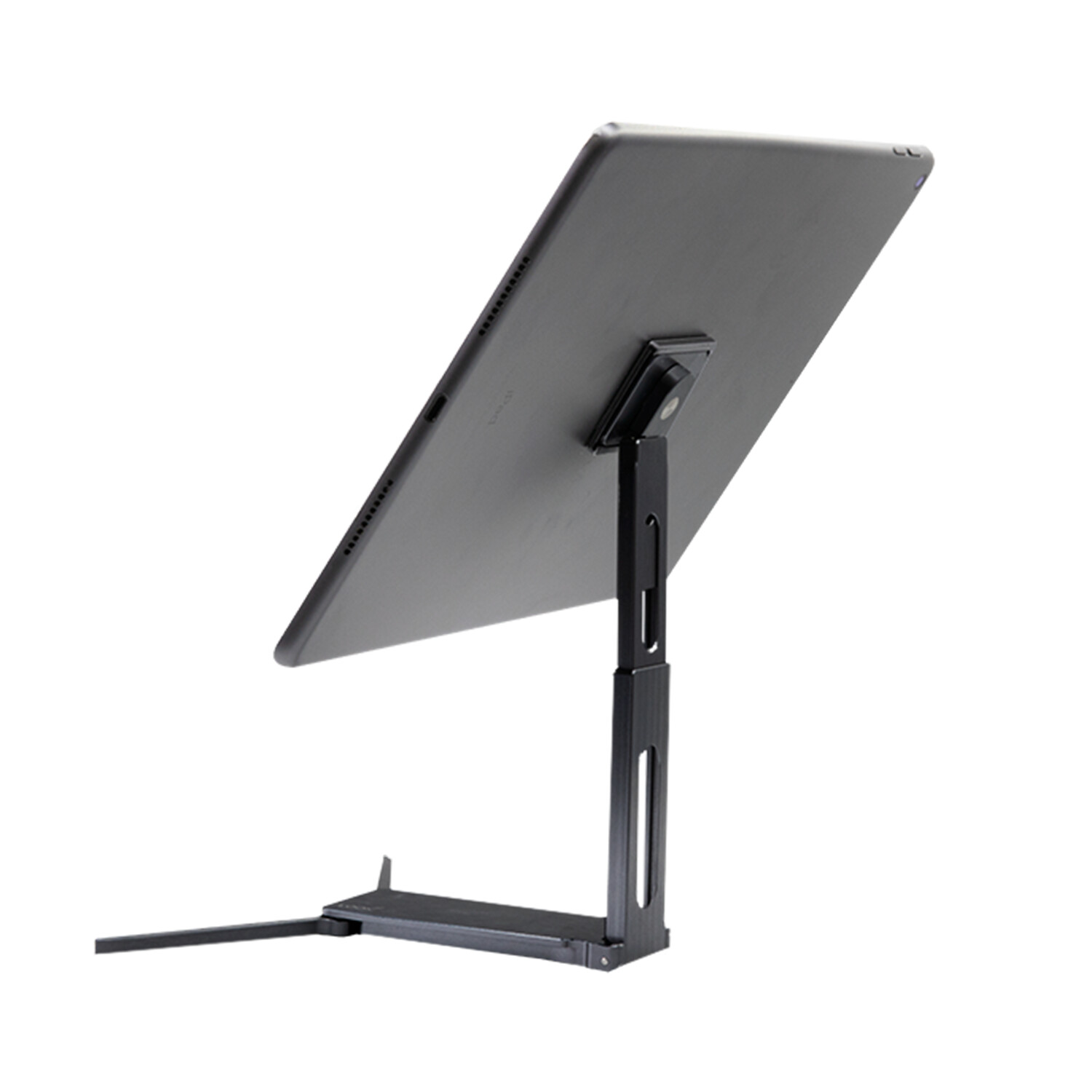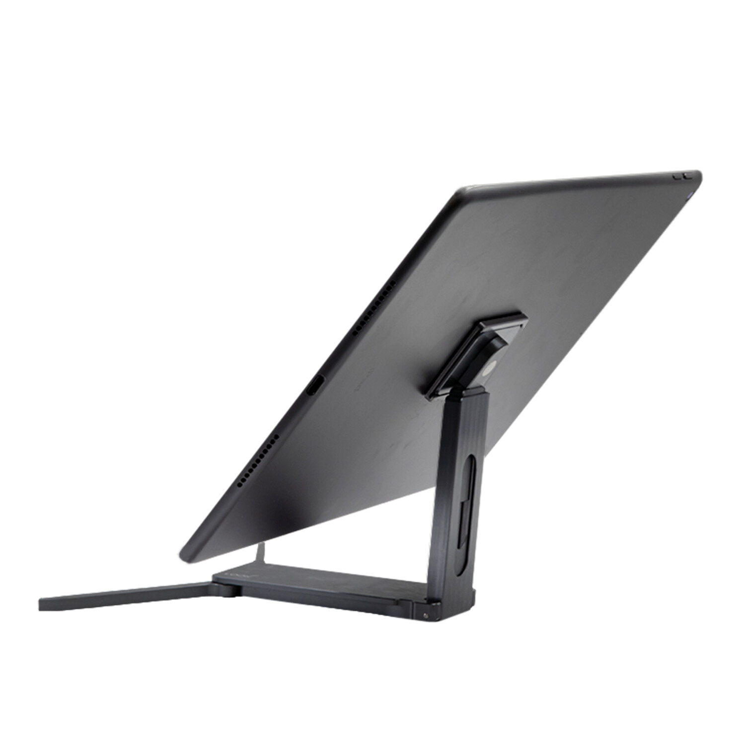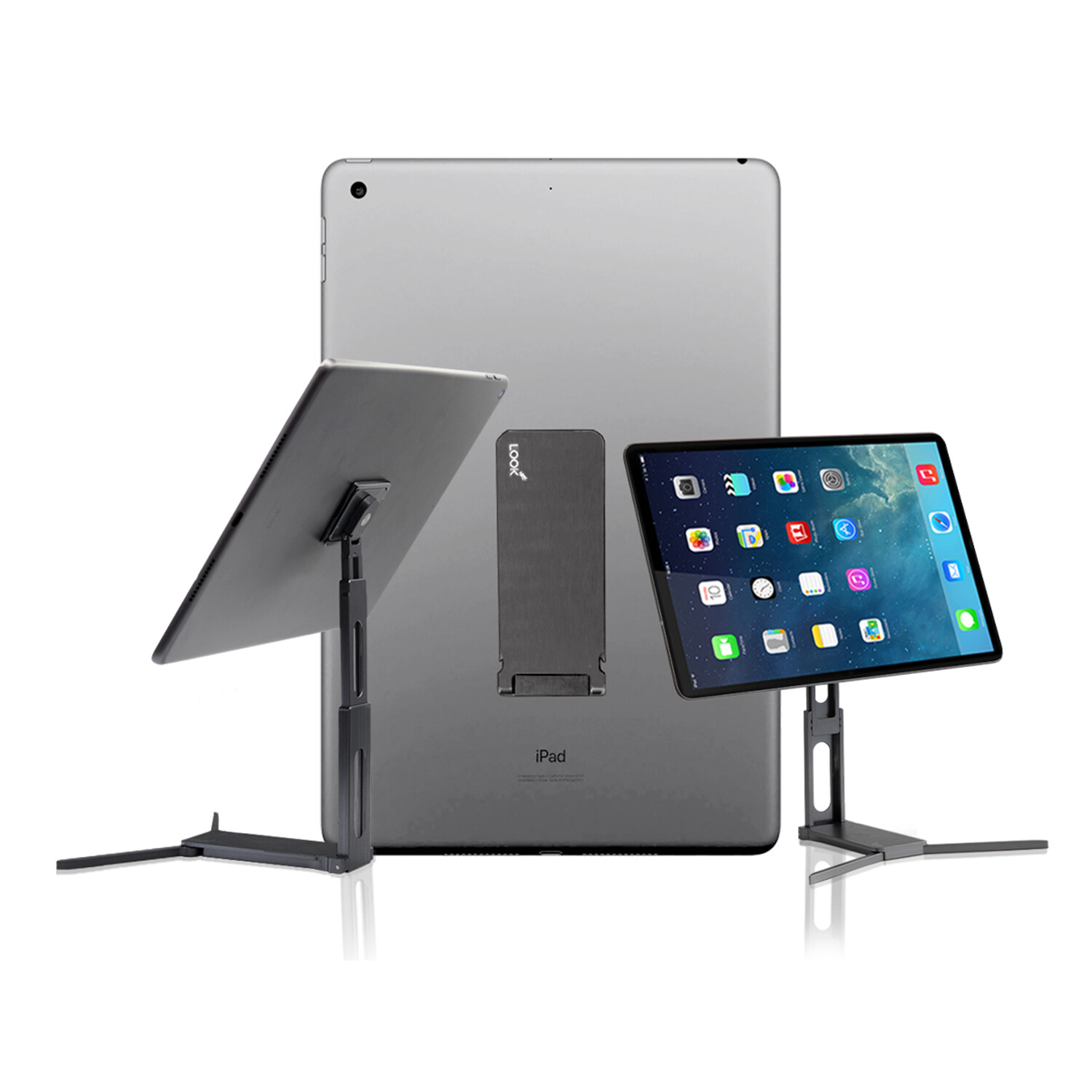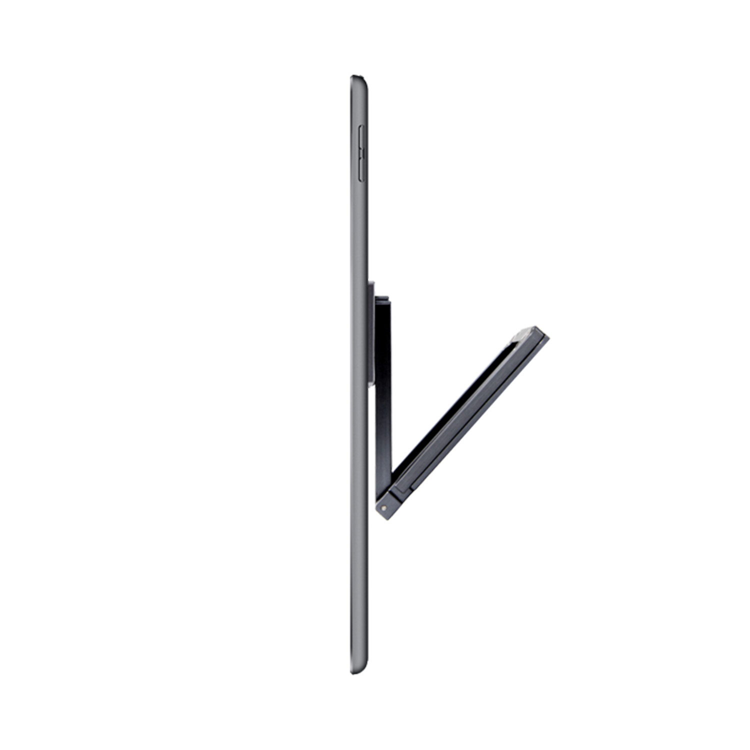 The Lookstand Max is a lightweight, ultra discreet aluminum tablet stand that attaches directly to your tablet for ultimate portability. With 3 preset heights to choose from, Lookstand can securely lift your device over 7" high for a more comfortable viewing angle when taking a video call, streaming your favorite content, or working on the go. Mount your device horizontally or vertically and adjust the angle up to 120º to position your screen exactly how you want it. When not in use, the Lookstand easily folds down so you barely notice it's there.