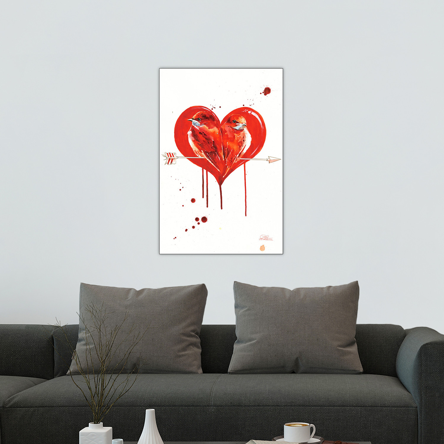 Two Love Birds are perched inside a dripping red heart in this touching tribute to two little creatures living within one heart. Reminiscent of E. E. Cummings or a traditional tattoo, this print is perfect for a romantic little corner — perhaps above a love seat?