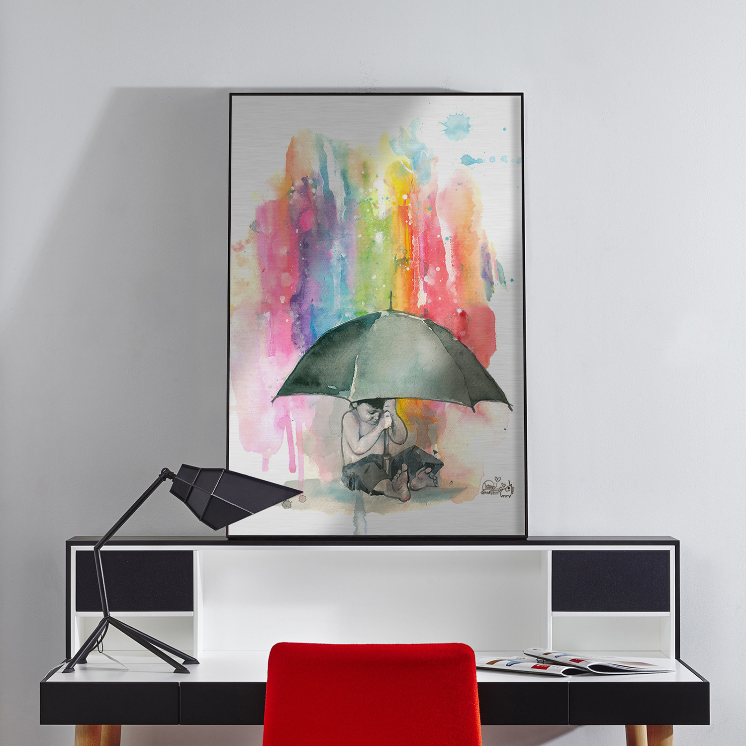 "Umbrella Boy" is a painting of a boy with an umbrella. sitting underneath colorful rainfall. Born in Voronezh, Russia, in 1990, Lora Zombie was set on becoming an artist a very early age. The self-taught painter is now a top seller on the urban art scene and is gaining the attention of the art world at large. Her work is a vibrant mix of precise figures with splashes of paint and color, and looks great in spaces in need of a little energy.