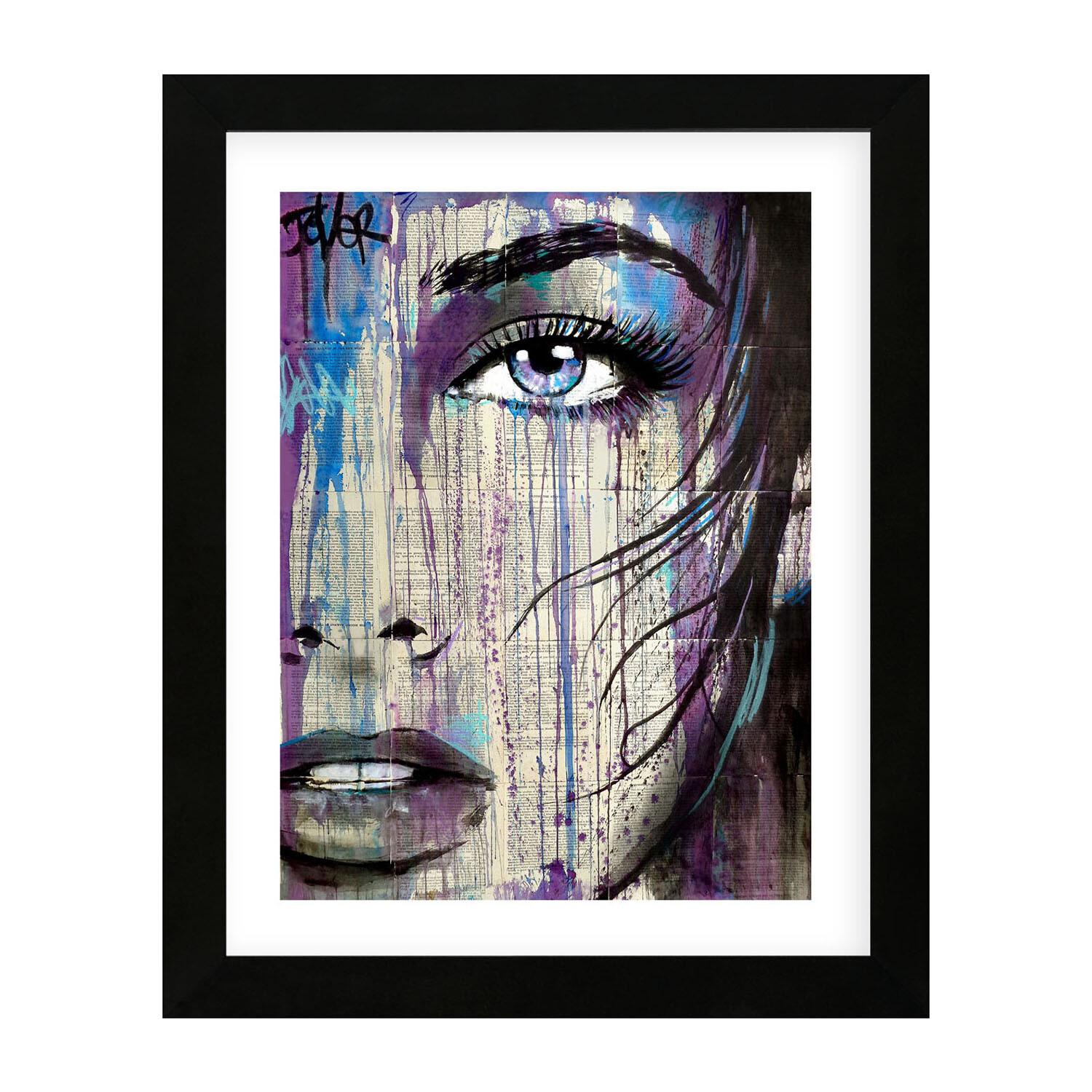 Loui Jover is an Australian painter and artist known for his artwork in ink wash paintings on vintage book pages. Each piece displays a romantic love scene, complicated emotions of female faces, or stormy weathered silhouettes. This collection of high-quality art prints is a unique conversation piece to any space.