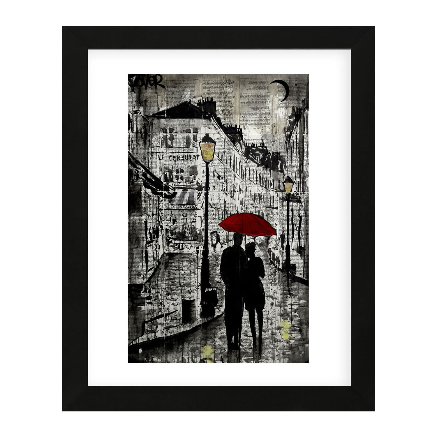 Loui Jover is an Australian painter and artist known for his artwork in ink wash paintings on vintage book pages. Each piece displays a romantic love scene, complicated emotions of female faces, or stormy weathered silhouettes. This collection of high-quality art prints is a unique conversation piece to any space.