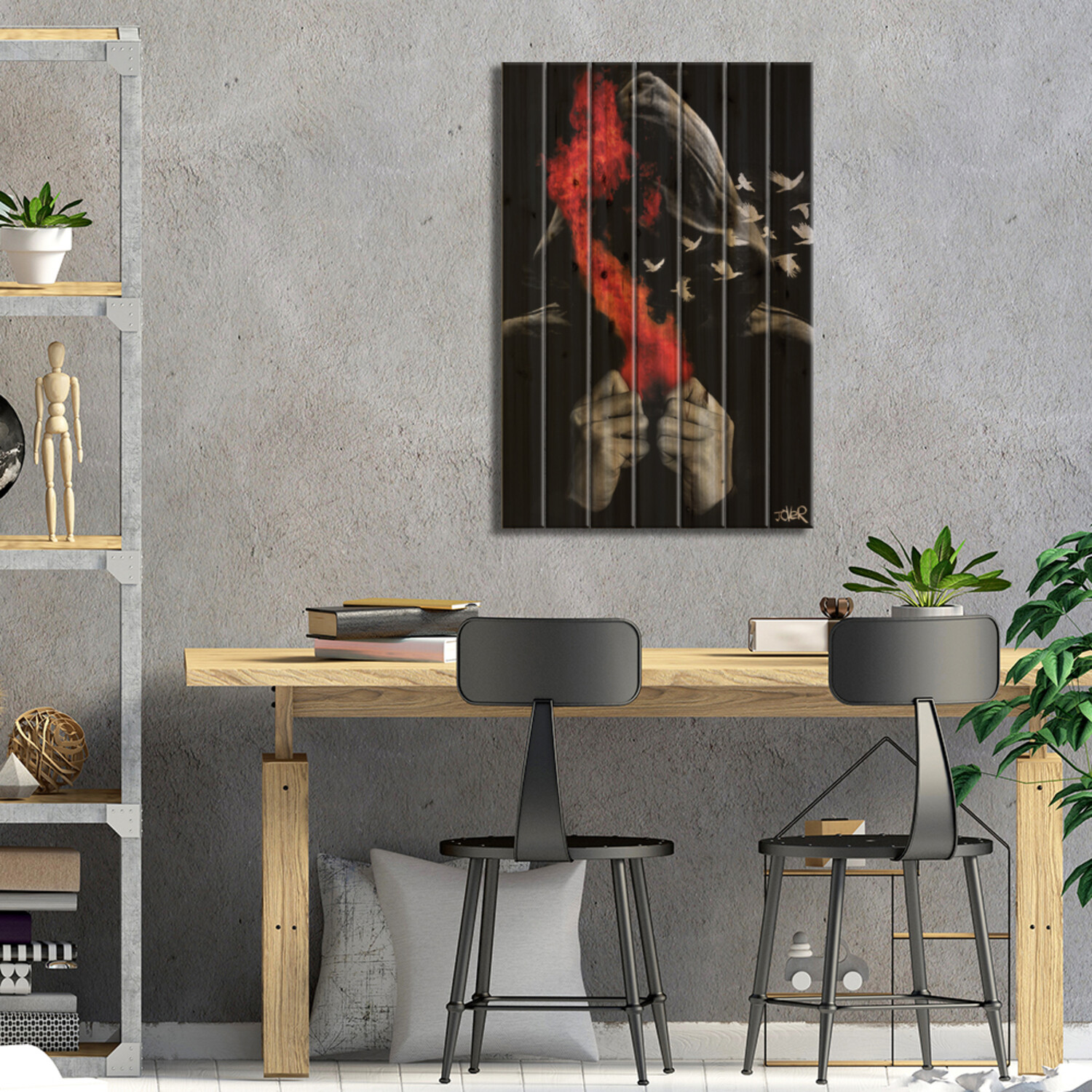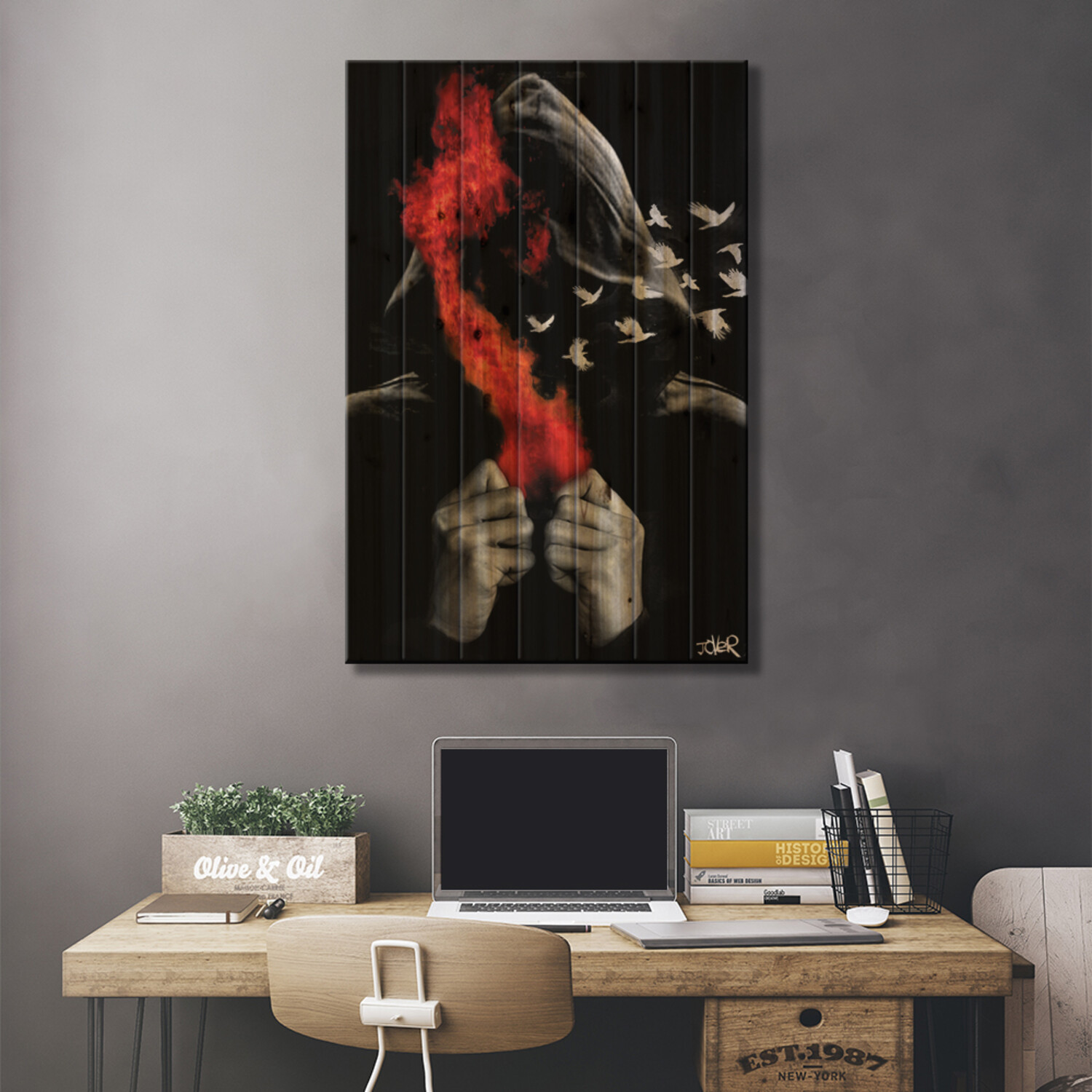 Loui Jover, based in Melbourne, Australia, creates pen and ink art on vintage book pages, as well as minimalist portraits and pop culture imagery. With several pieces revealing stories of romance and passion, his work adds sensual art vibes to your space. Muted color tones and an overarching masculine vibe make this selection of pallet art perfect for any corner of the house that enjoys a subdued style.