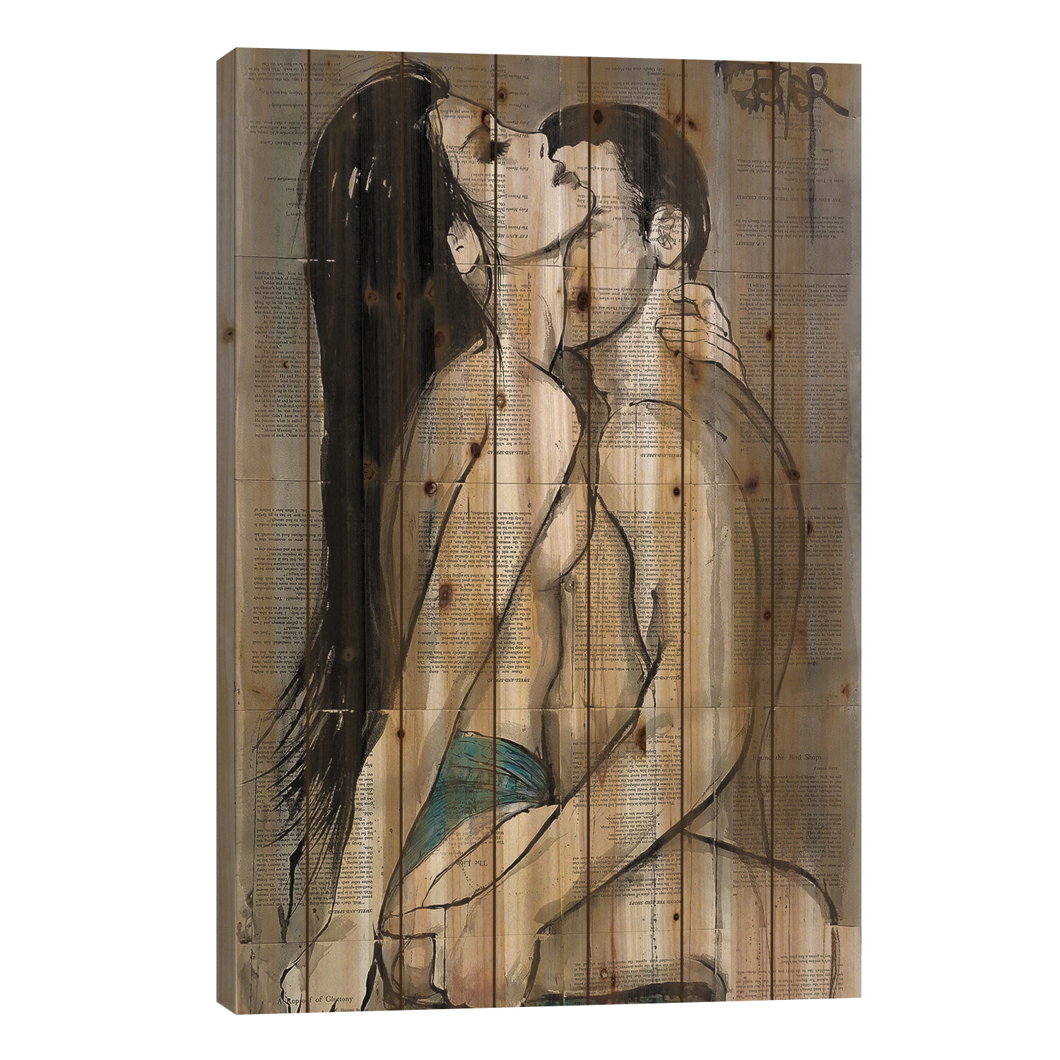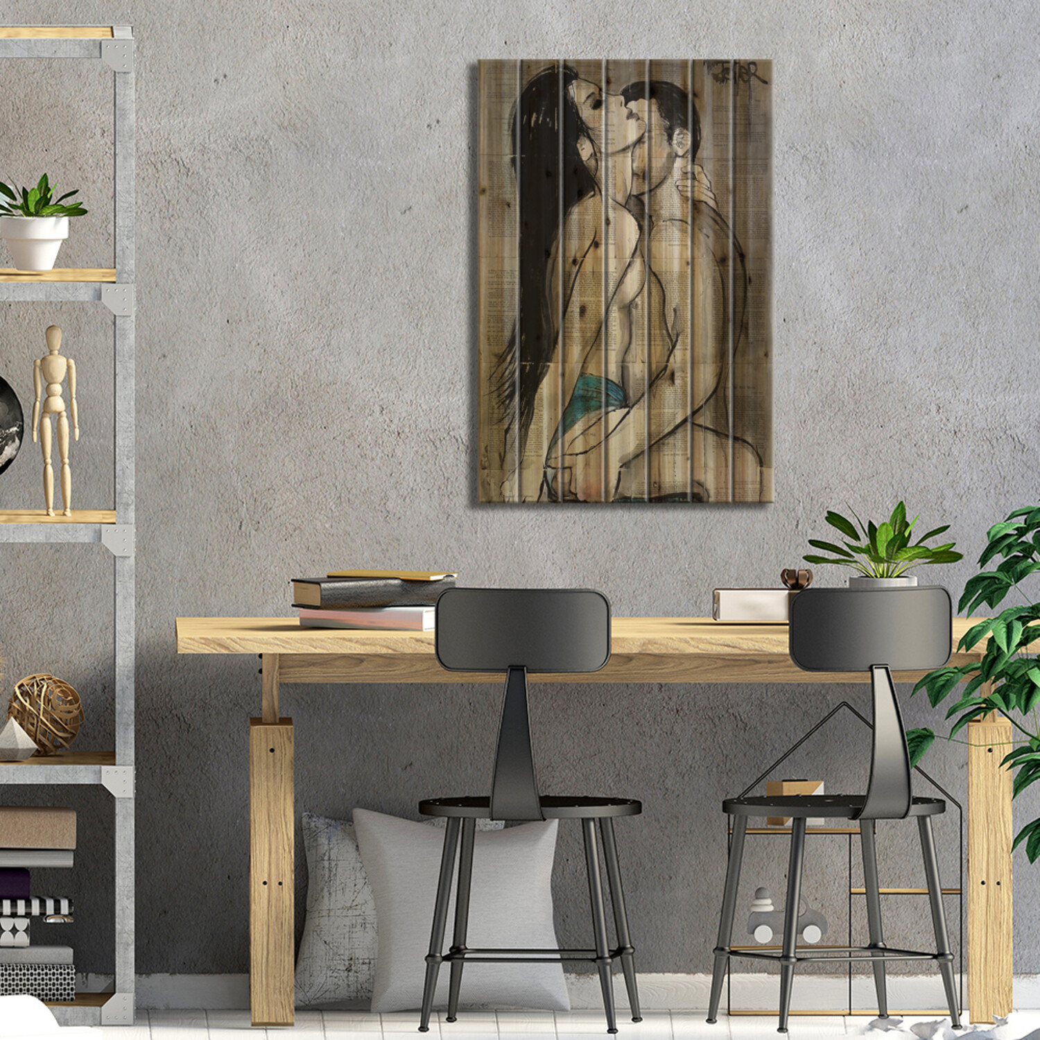 Loui Jover, based in Melbourne, Australia, creates pen and ink art on vintage book pages, as well as minimalist portraits and pop culture imagery. With several pieces revealing stories of romance and passion, his work adds sensual art vibes to your space. Muted color tones and an overarching masculine vibe make this selection of pallet art perfect for any corner of the house that enjoys a subdued style.