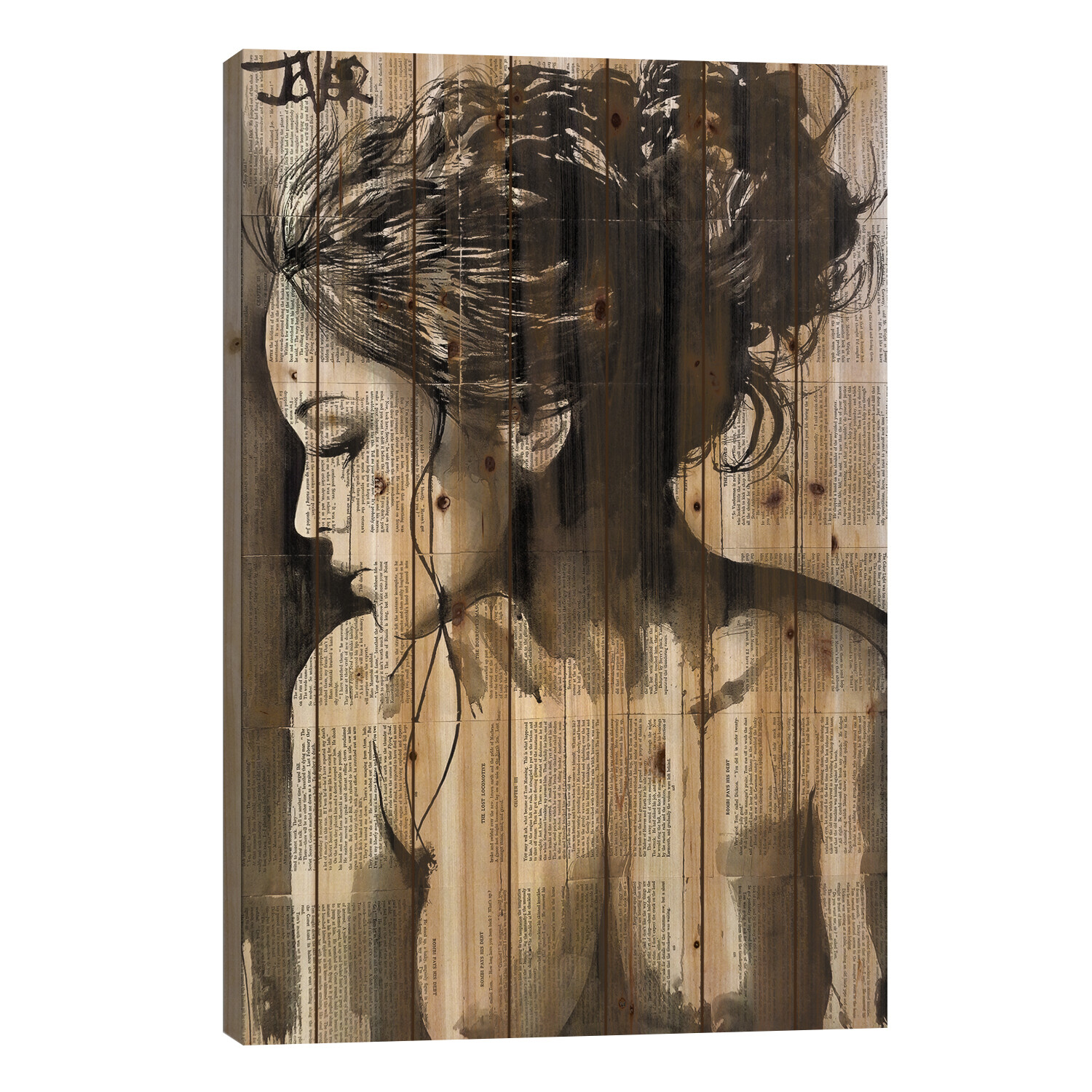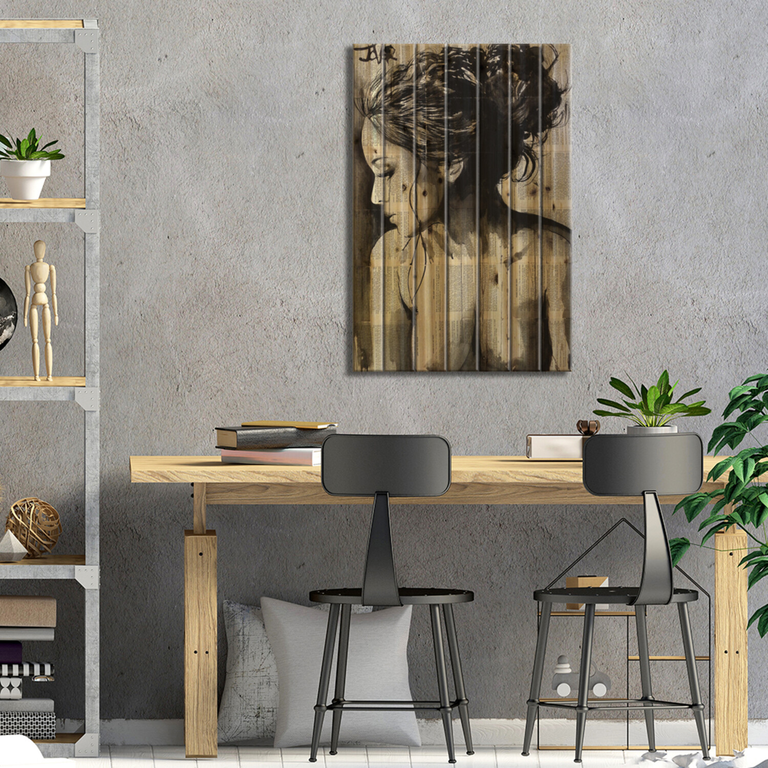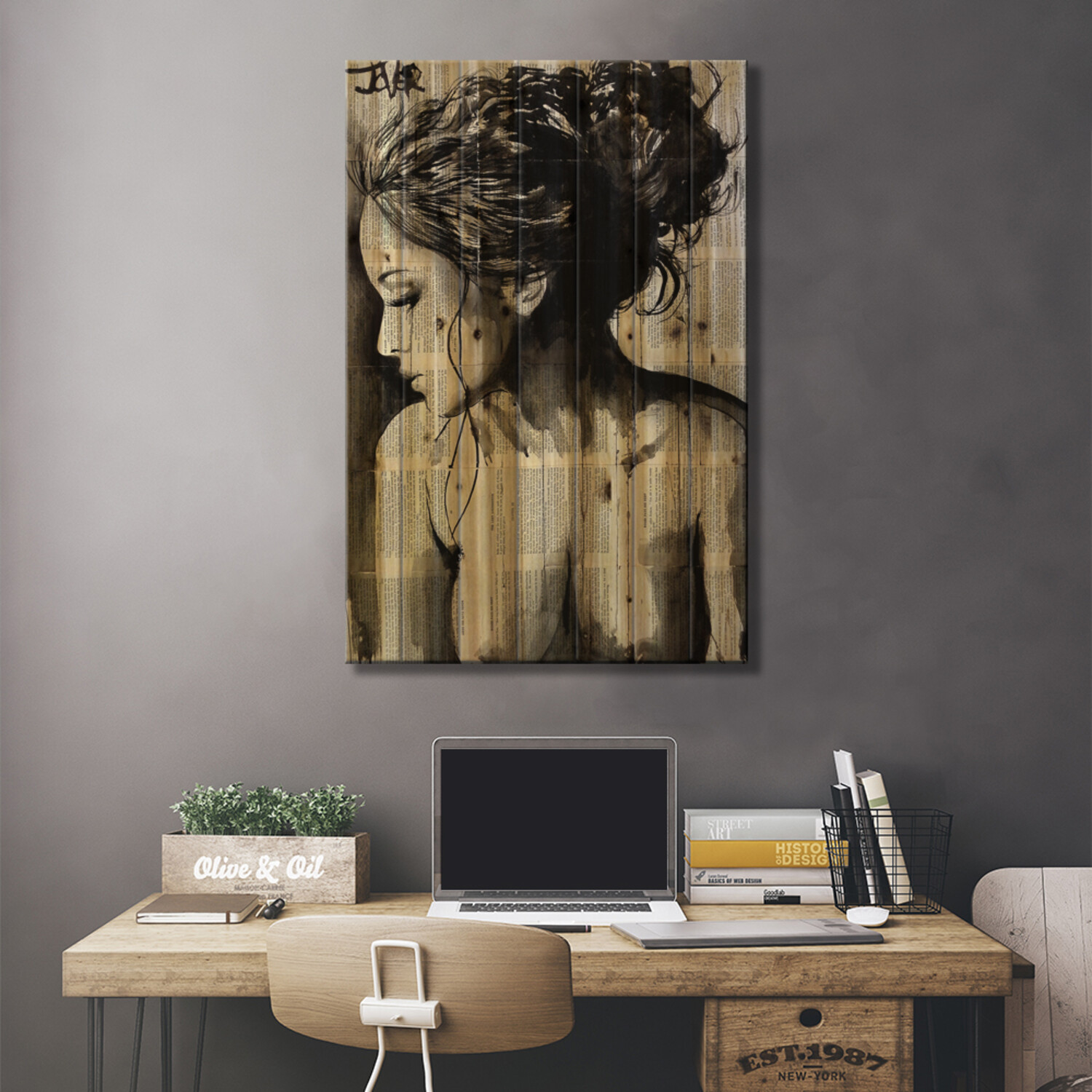 Loui Jover, based in Melbourne, Australia, creates pen and ink art on vintage book pages, as well as minimalist portraits and pop culture imagery. With several pieces revealing stories of romance and passion, his work adds sensual art vibes to your space. Muted color tones and an overarching masculine vibe make this selection of pallet art perfect for any corner of the house that enjoys a subdued style.