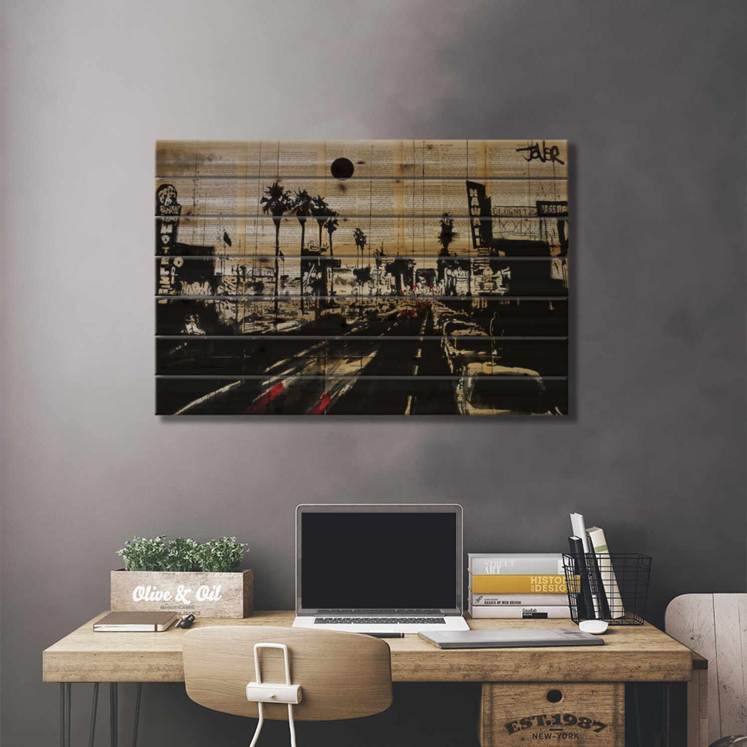 Loui Jover, based in Melbourne, Australia, creates pen and ink art on vintage book pages, as well as minimalist portraits and pop culture imagery. With several pieces revealing stories of romance and passion, his work adds sensual art vibes to your space. Muted color tones and an overarching masculine vibe make this selection of pallet art perfect for any corner of the house that enjoys a subdued style.