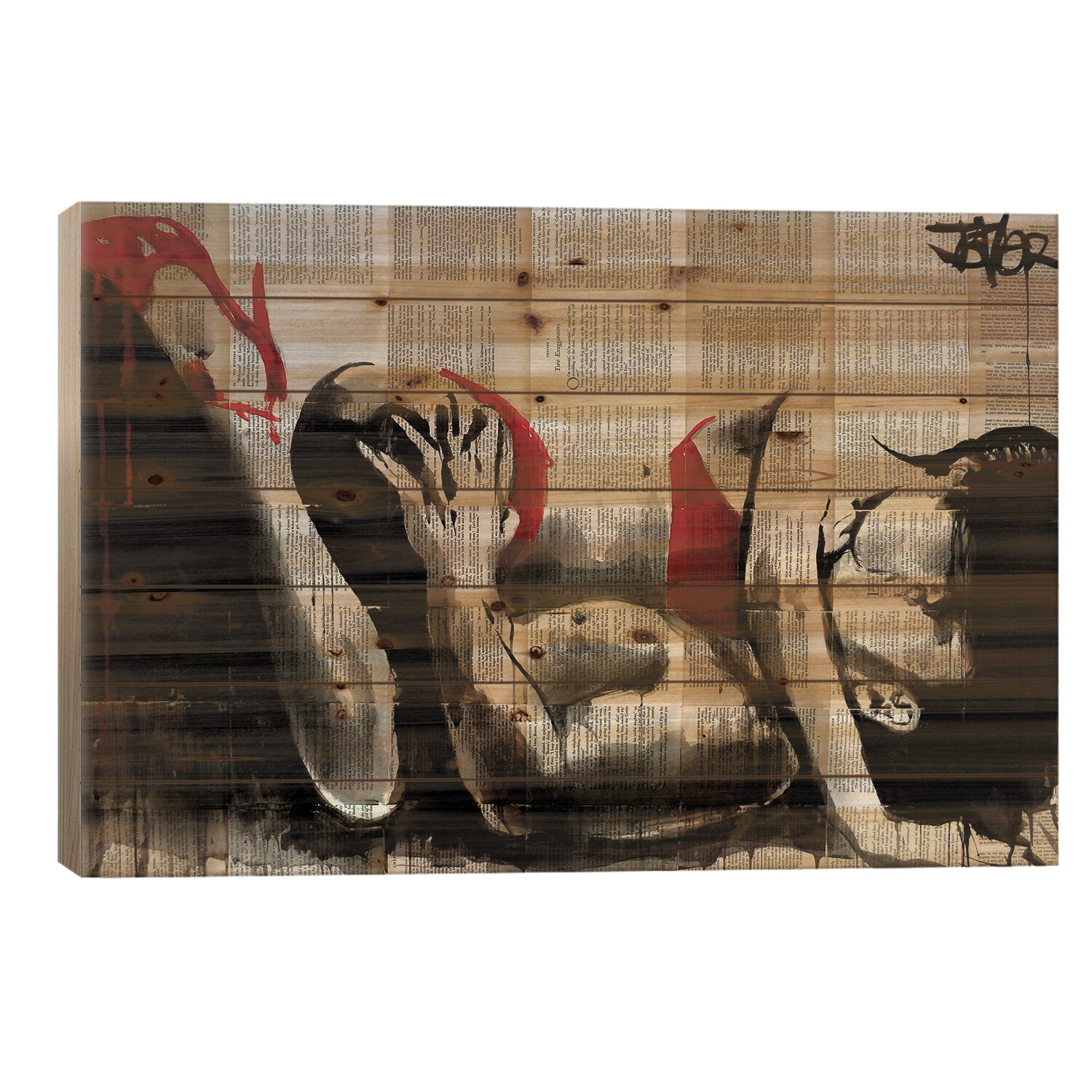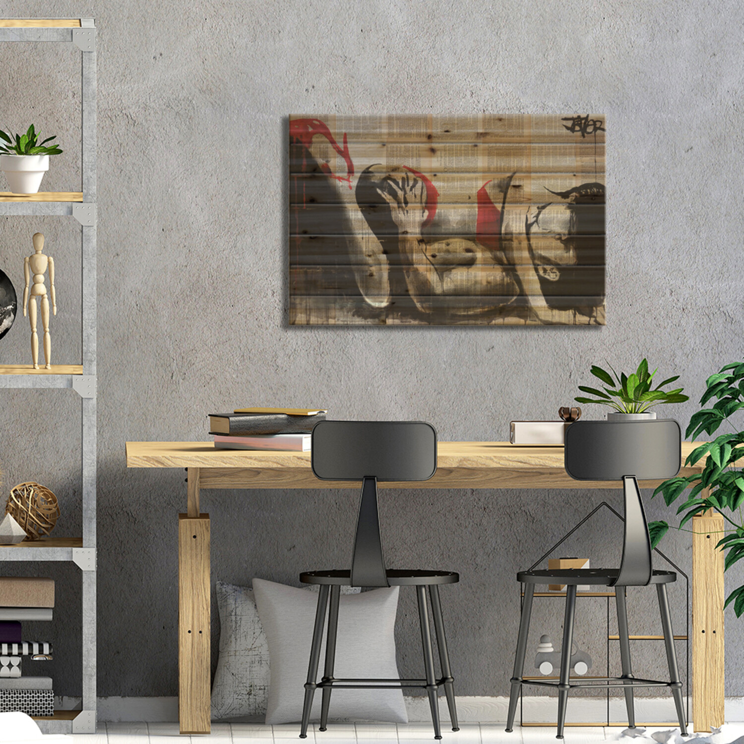 Loui Jover, based in Melbourne, Australia, creates pen and ink art on vintage book pages, as well as minimalist portraits and pop culture imagery. With several pieces revealing stories of romance and passion, his work adds sensual art vibes to your space. Muted color tones and an overarching masculine vibe make this selection of pallet art perfect for any corner of the house that enjoys a subdued style.