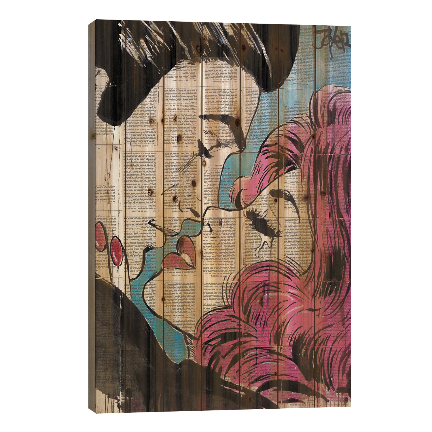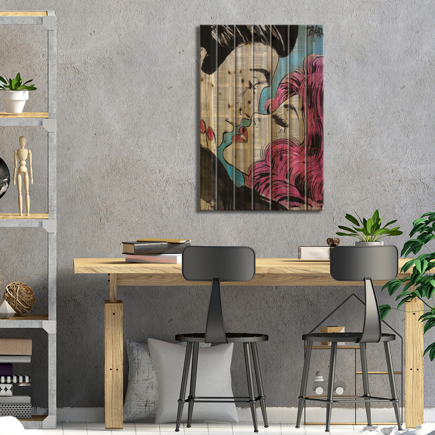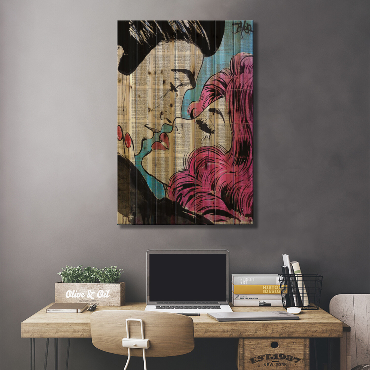 Loui Jover, based in Melbourne, Australia, creates pen and ink art on vintage book pages, as well as minimalist portraits and pop culture imagery. With several pieces revealing stories of romance and passion, his work adds sensual art vibes to your space. Muted color tones and an overarching masculine vibe make this selection of pallet art perfect for any corner of the house that enjoys a subdued style.