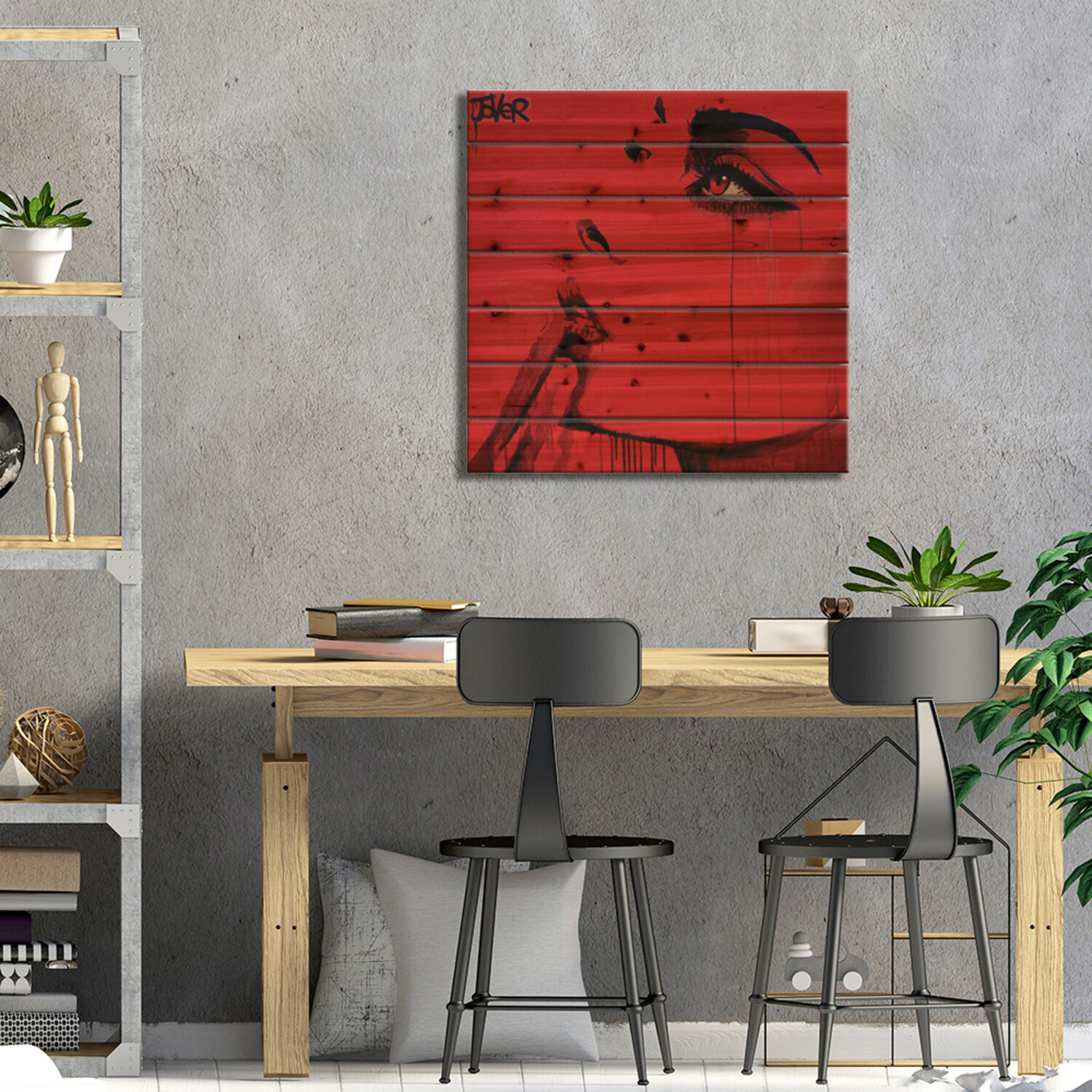 Loui Jover, based in Melbourne, Australia, creates pen and ink art on vintage book pages, as well as minimalist portraits and pop culture imagery. With several pieces revealing stories of romance and passion, his work adds sensual art vibes to your space. Muted color tones and an overarching masculine vibe make this selection of pallet art perfect for any corner of the house that enjoys a subdued style.