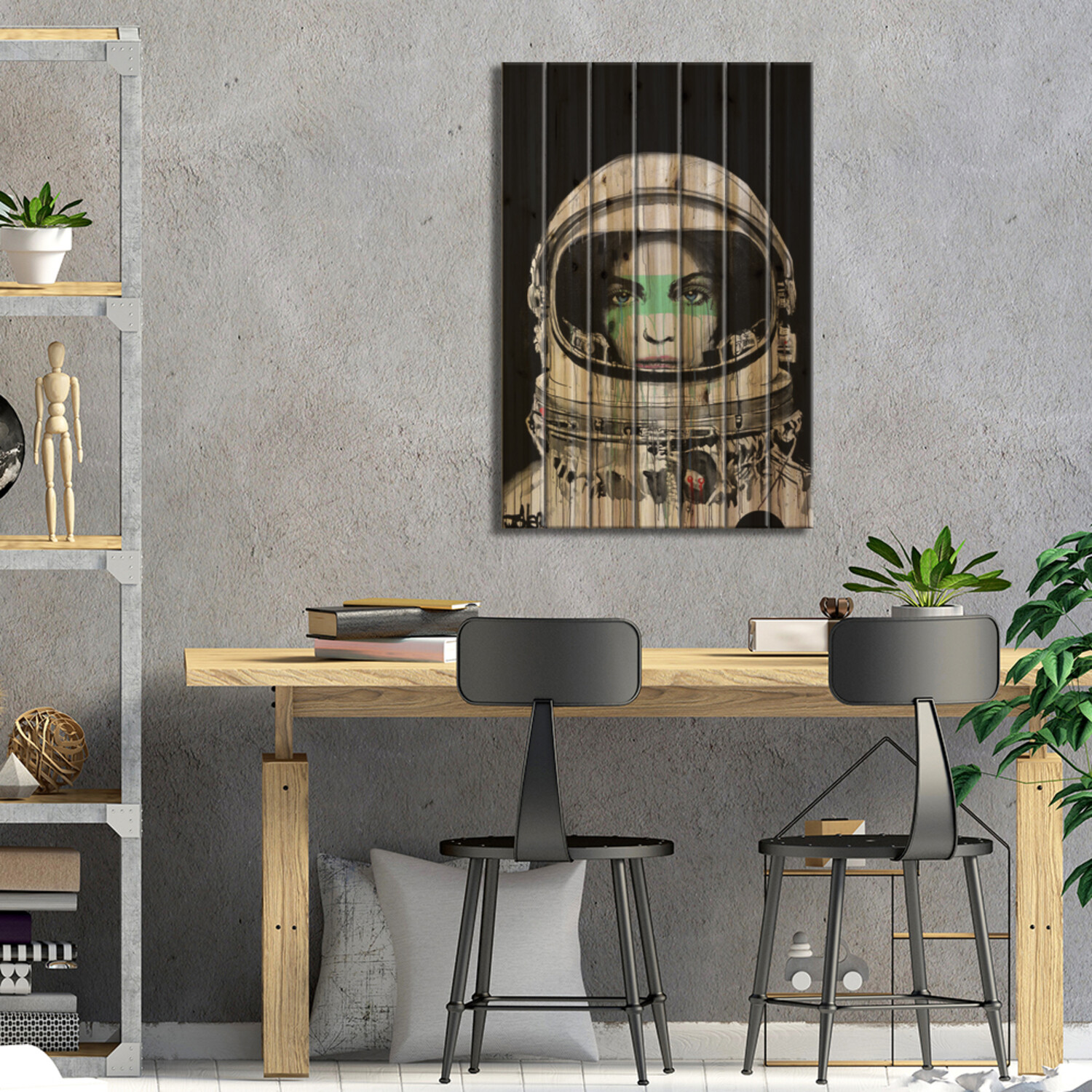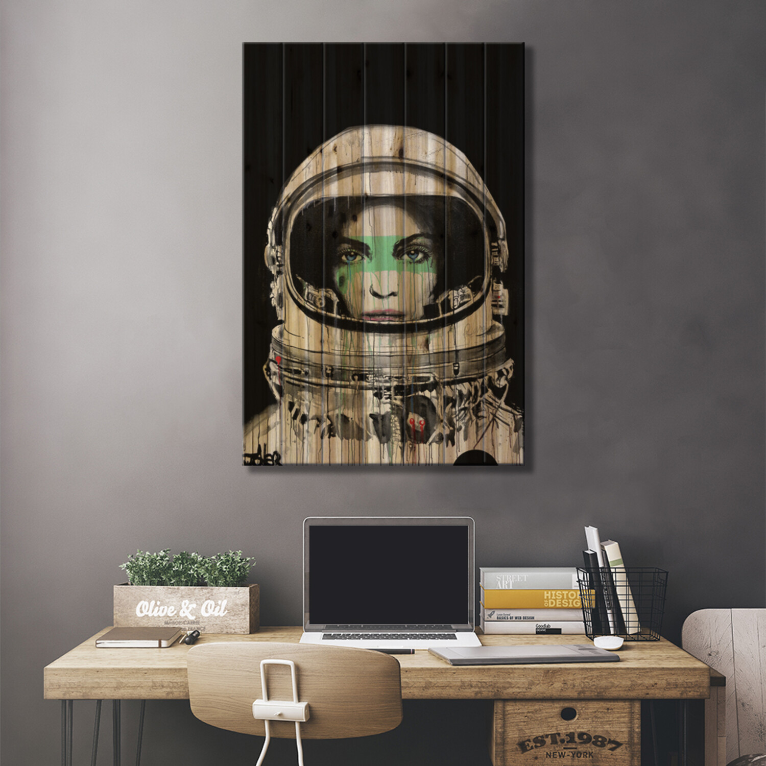 Loui Jover, based in Melbourne, Australia, creates pen and ink art on vintage book pages, as well as minimalist portraits and pop culture imagery. With several pieces revealing stories of romance and passion, his work adds sensual art vibes to your space. Muted color tones and an overarching masculine vibe make this selection of pallet art perfect for any corner of the house that enjoys a subdued style.