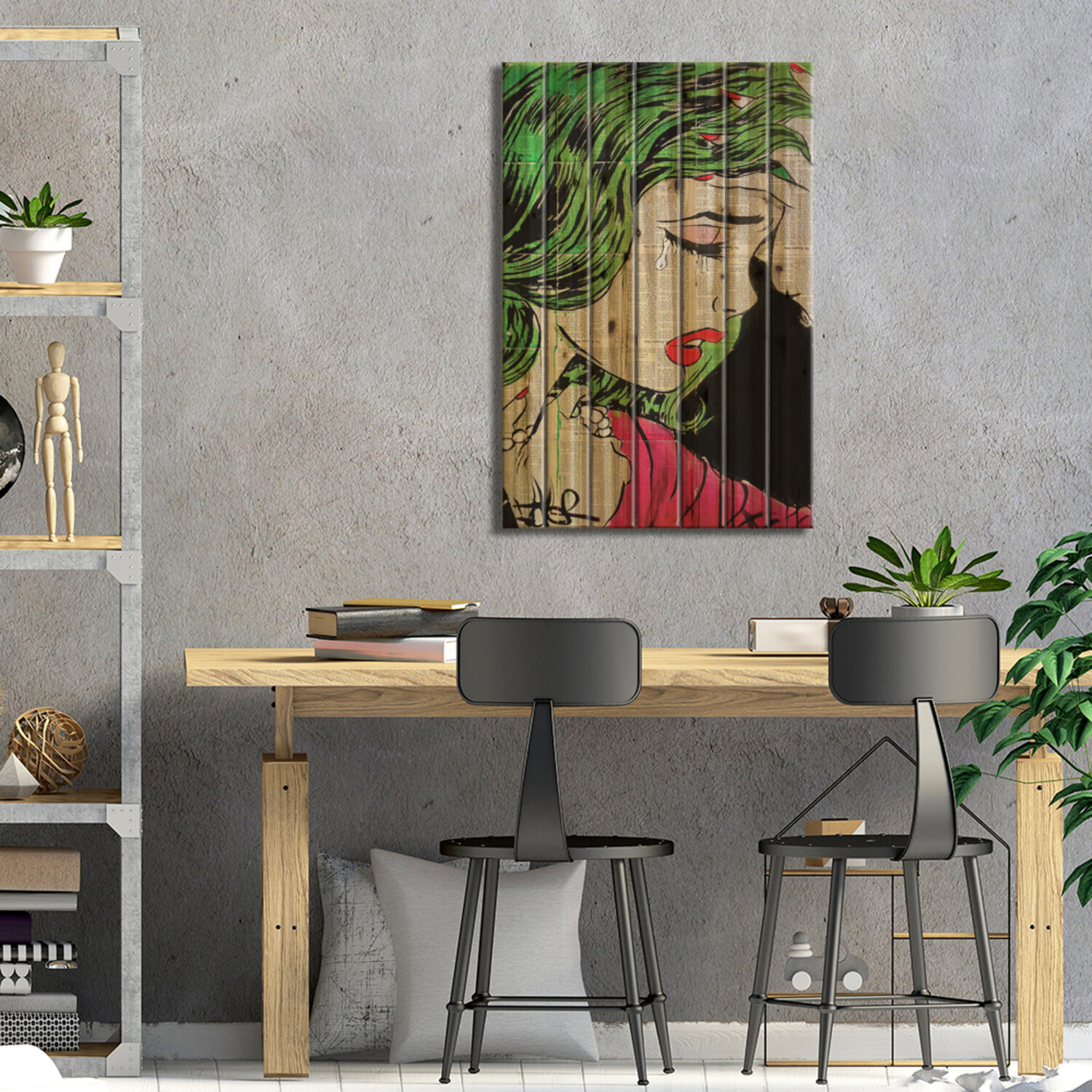 Loui Jover, based in Melbourne, Australia, creates pen and ink art on vintage book pages, as well as minimalist portraits and pop culture imagery. With several pieces revealing stories of romance and passion, his work adds sensual art vibes to your space. Muted color tones and an overarching masculine vibe make this selection of pallet art perfect for any corner of the house that enjoys a subdued style.