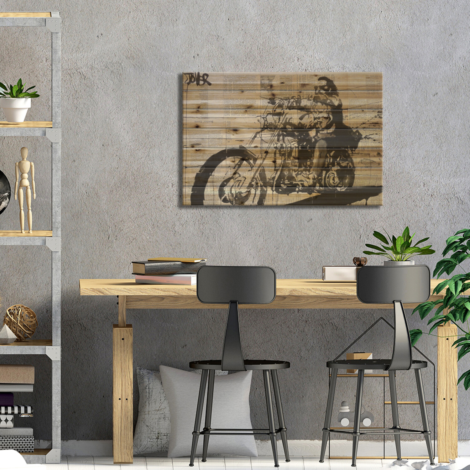 Loui Jover, based in Melbourne, Australia, creates pen and ink art on vintage book pages, as well as minimalist portraits and pop culture imagery. With several pieces revealing stories of romance and passion, his work adds sensual art vibes to your space. Muted color tones and an overarching masculine vibe make this selection of pallet art perfect for any corner of the house that enjoys a subdued style.