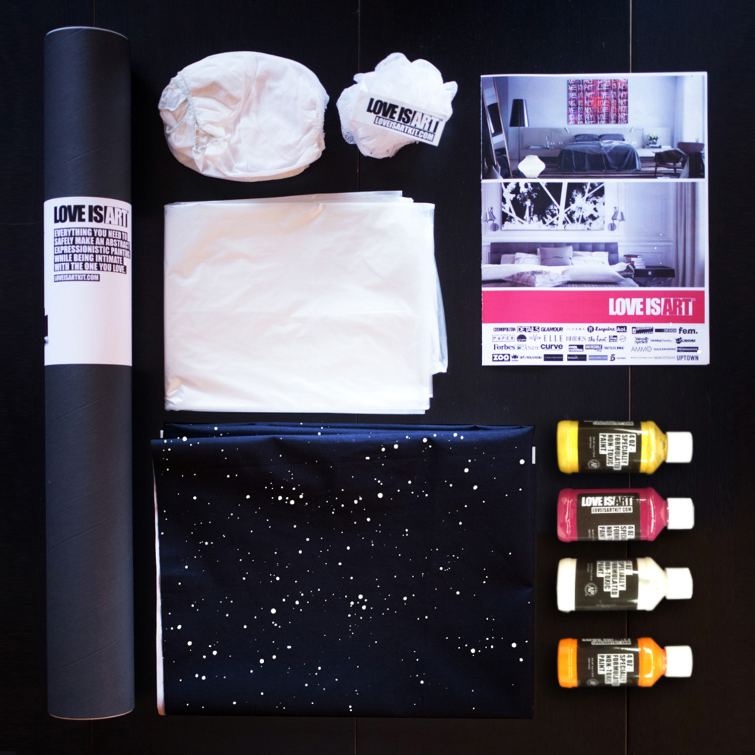 The Cosmos Edition of the Love is Art Kit includes all of the materials you need to safely create a abstract painting while being intimate with the one you love. This special edition lets you and your lover recreate the cosmos through intimacy and art, creating a nebula-like final painting. Surprise your partner with a gift that's out-of-this-world sexy.