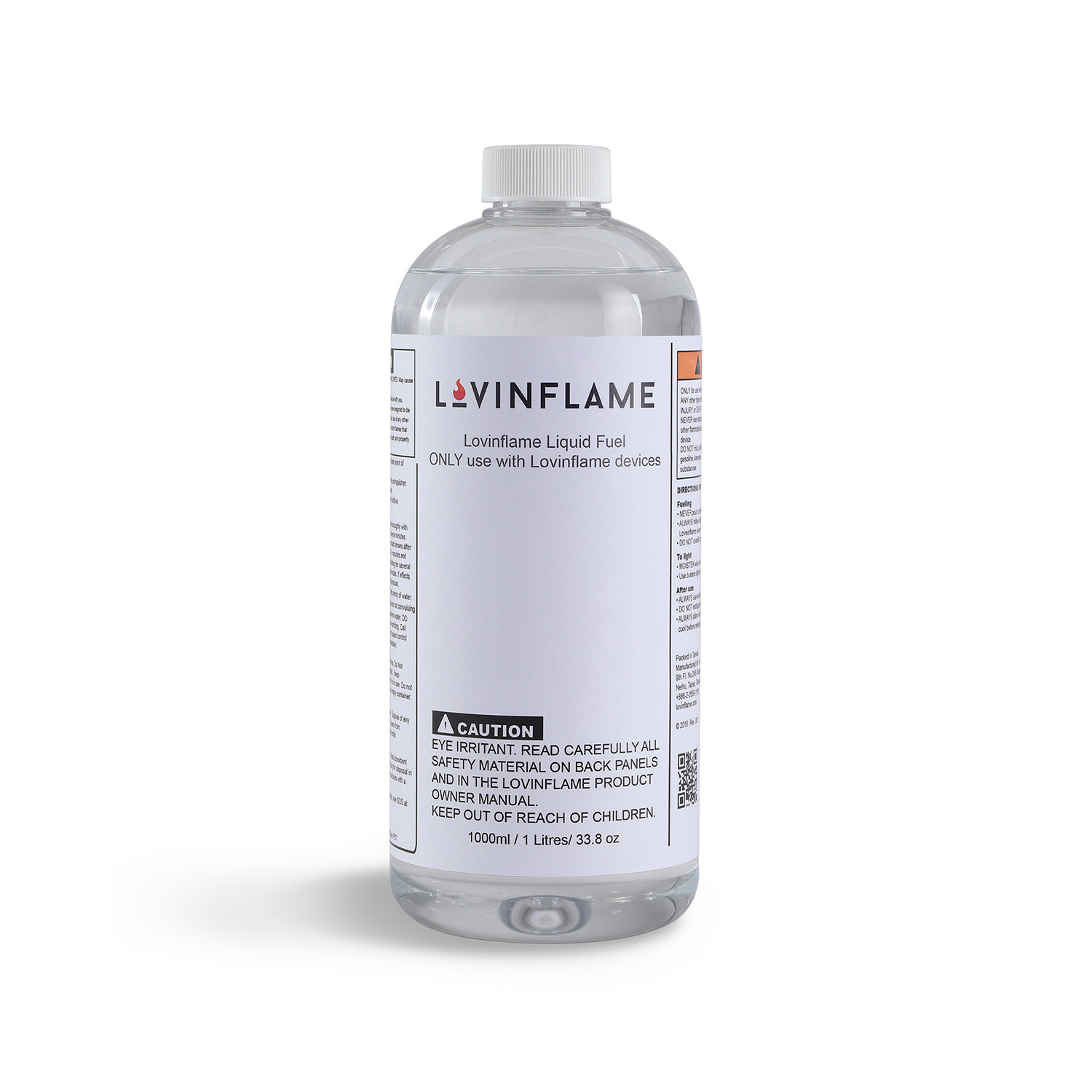 Lovinflame Fuel has a flashpoint of 220 ÂşF, classifying it as a non-flammable fuel. This means the fuel can be safely stored and transported under normal temperatures, only igniting when paired with the patented stainless steel wick. As a water-soluble and non-toxic fuel source, Lovinflame Fuel can be disposed of along with other household goods, and can be safely burned with minimal emissions. This bundle includes two bottles of Lovinflame Fuel, which will provide up to four hours of burn-time for your Lovinflame fireplace.