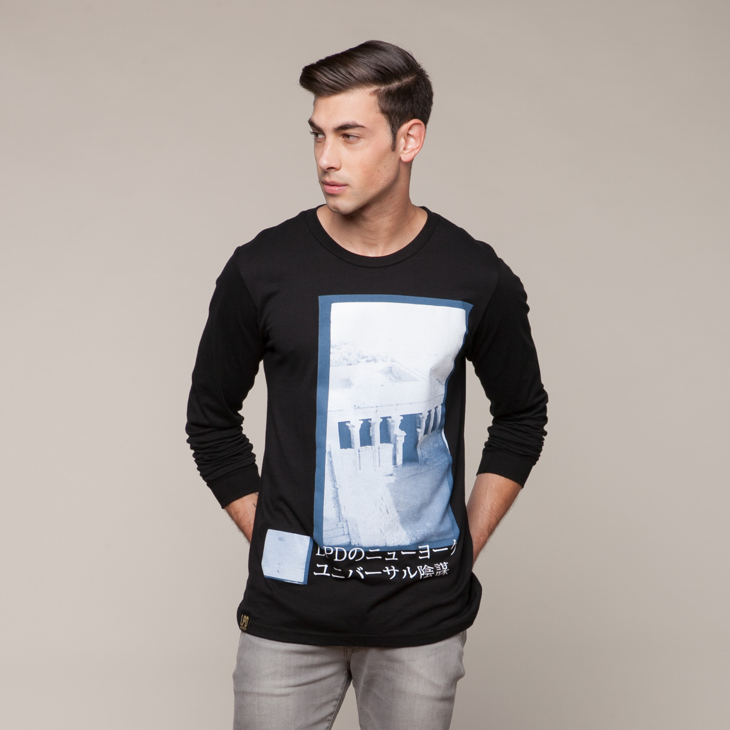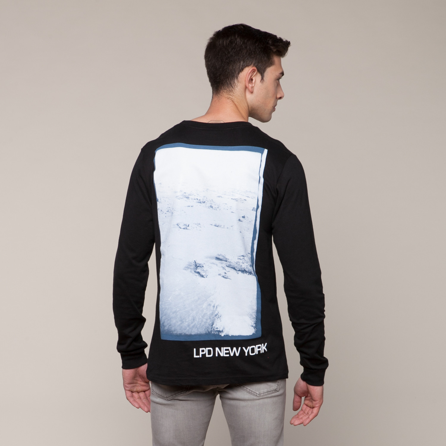 Slim and fitted, this long-sleeved black makes good use of its washed out landscape imagery.