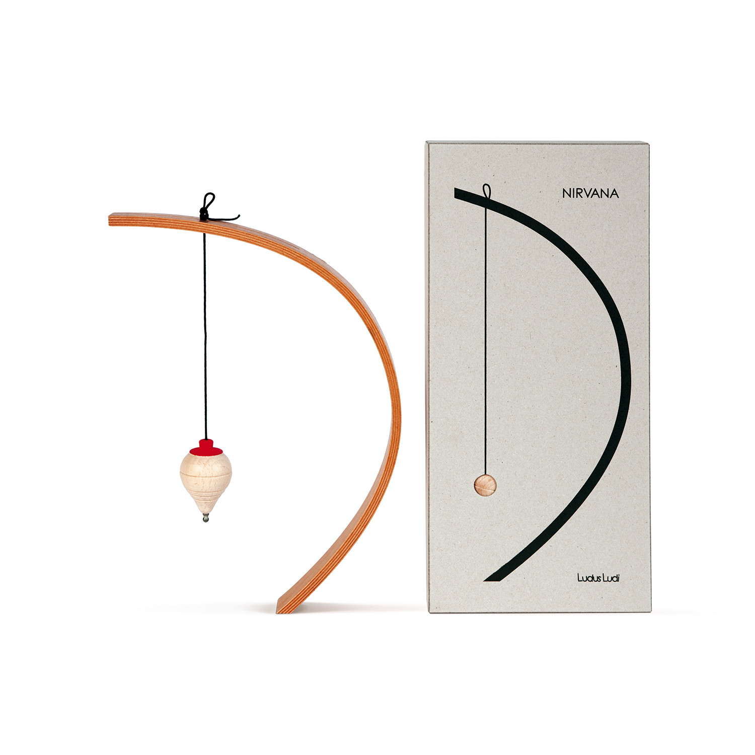 Playing with weight and balance, Nirvana is a game of stillness and contemplation. Watch how the wooden top appears still and fixed in place as gravity pulls on it. Observe surprising compositions by playing with the disparate relationships between weight/volume and weight/position as you add different objects to the beam. Experience the nirvana of perfect balance every time you play.