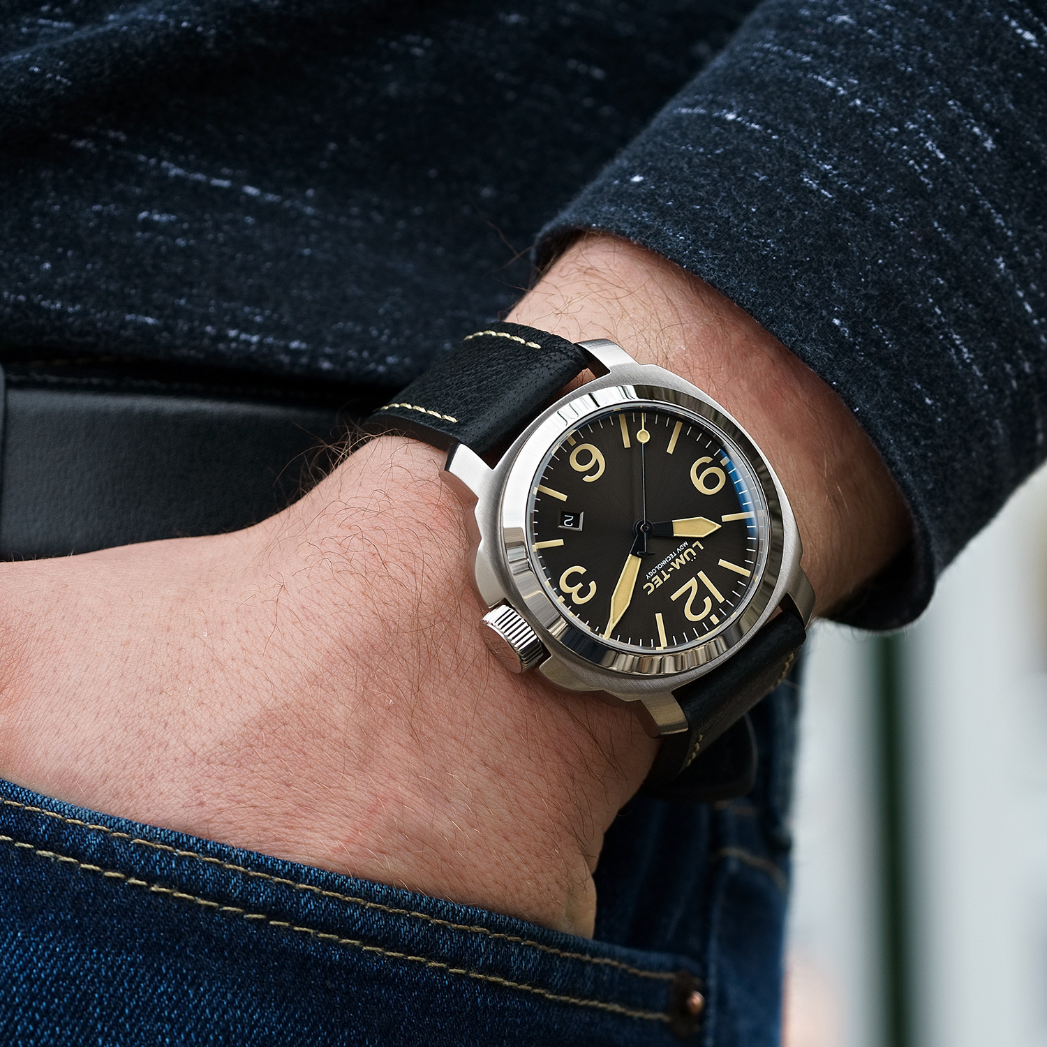 Every LÜM-TEC watch features exclusive MDV Technology, a special 8-layer application of ultra bright glowing Super-Luminova photoluminescent material. MDV hands and dials are extremely visible in all light conditions, making this watch perfect for red-eye travelers, evening joggers, and casual divers alike.
