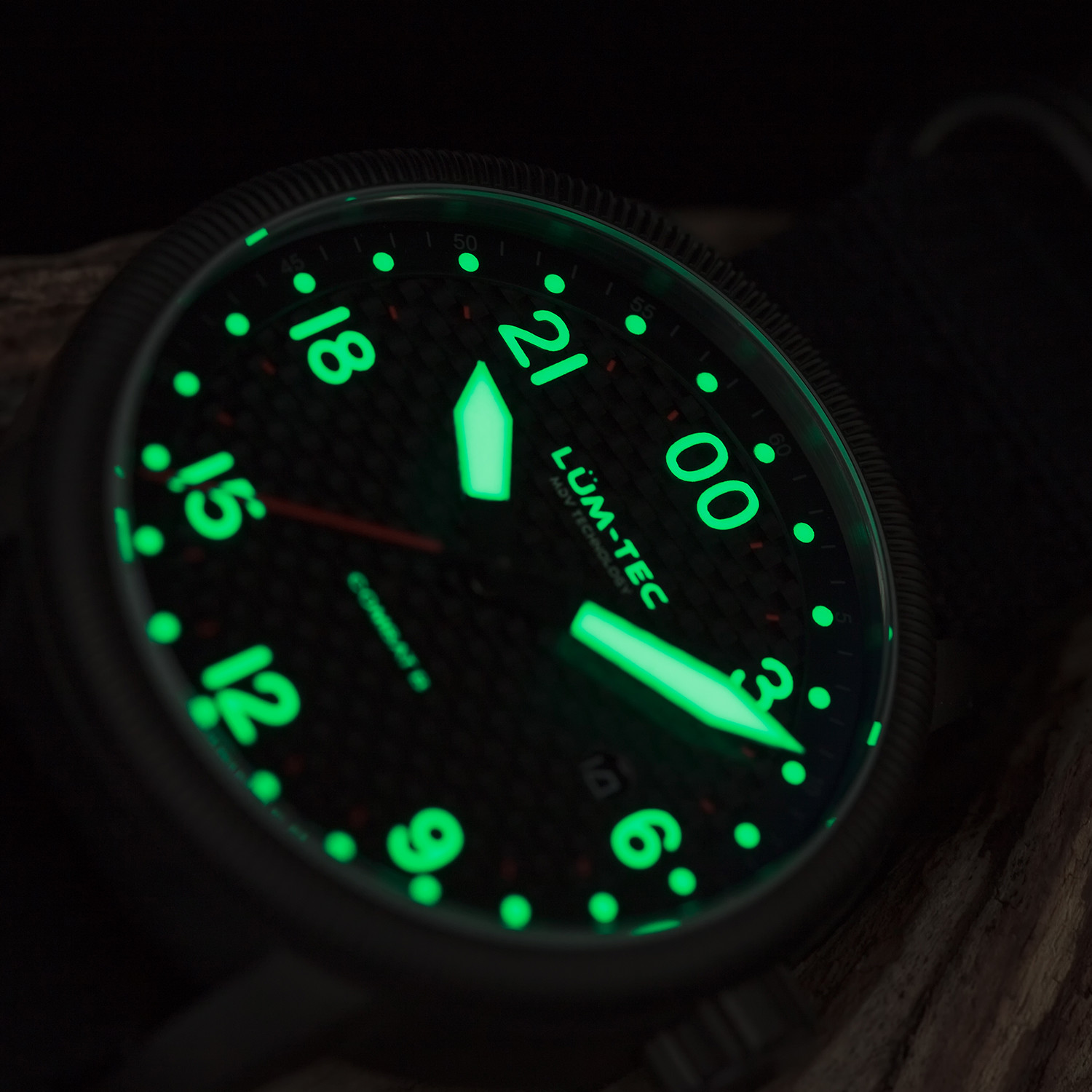 Every LÜM-TEC watch features exclusive MDV Technology, a special 8-layer application of ultra bright glowing Super-Luminova photoluminescent material. MDV hands and dials are extremely visible in all light conditions, making this watch perfect for red-eye travelers, evening joggers, and casual divers alike.