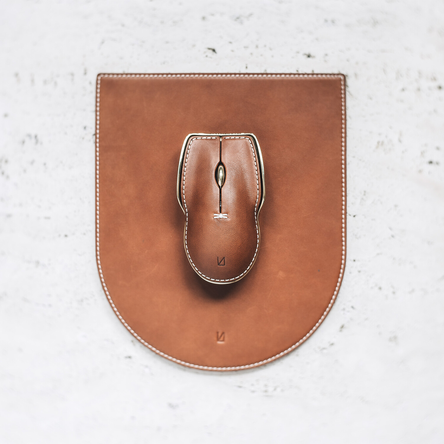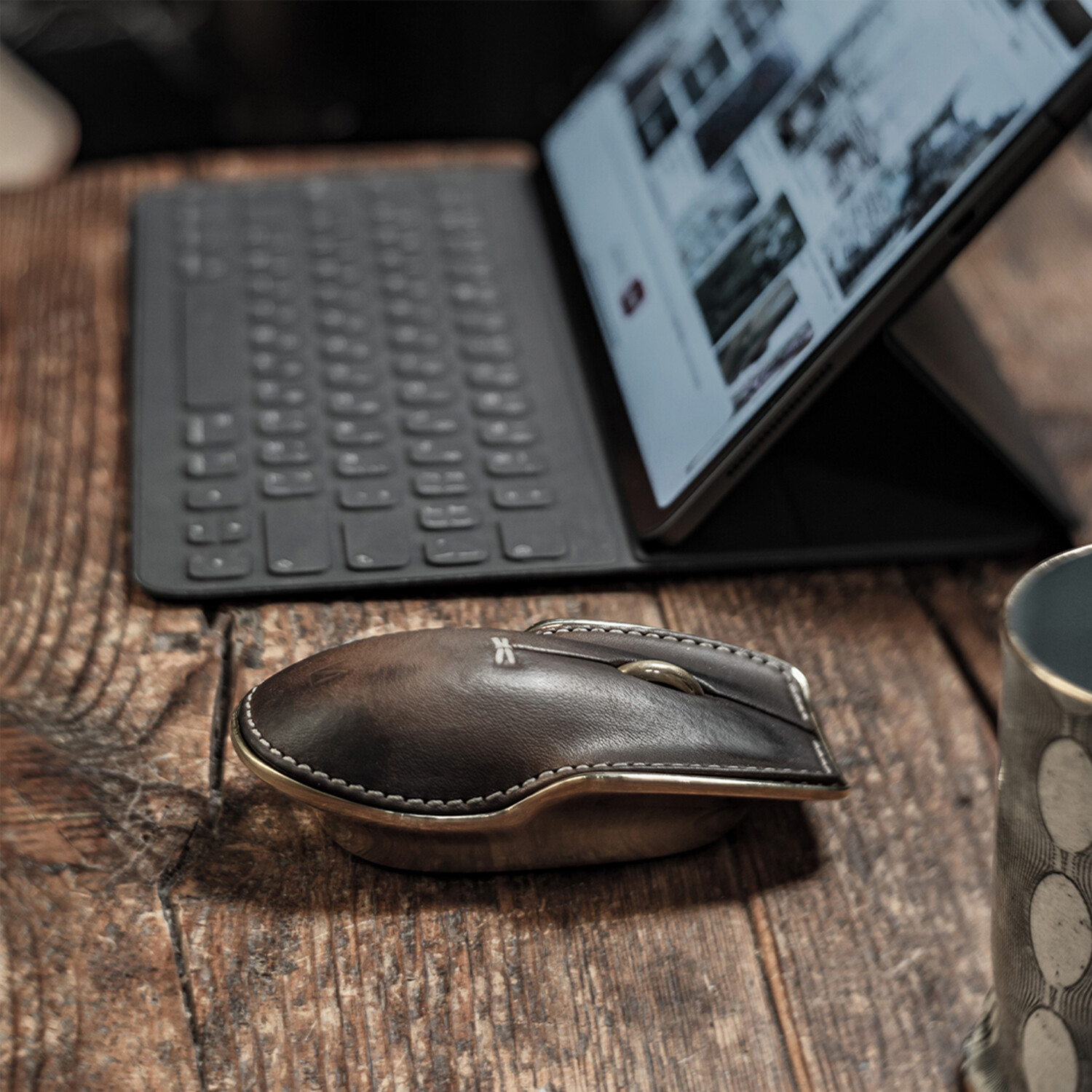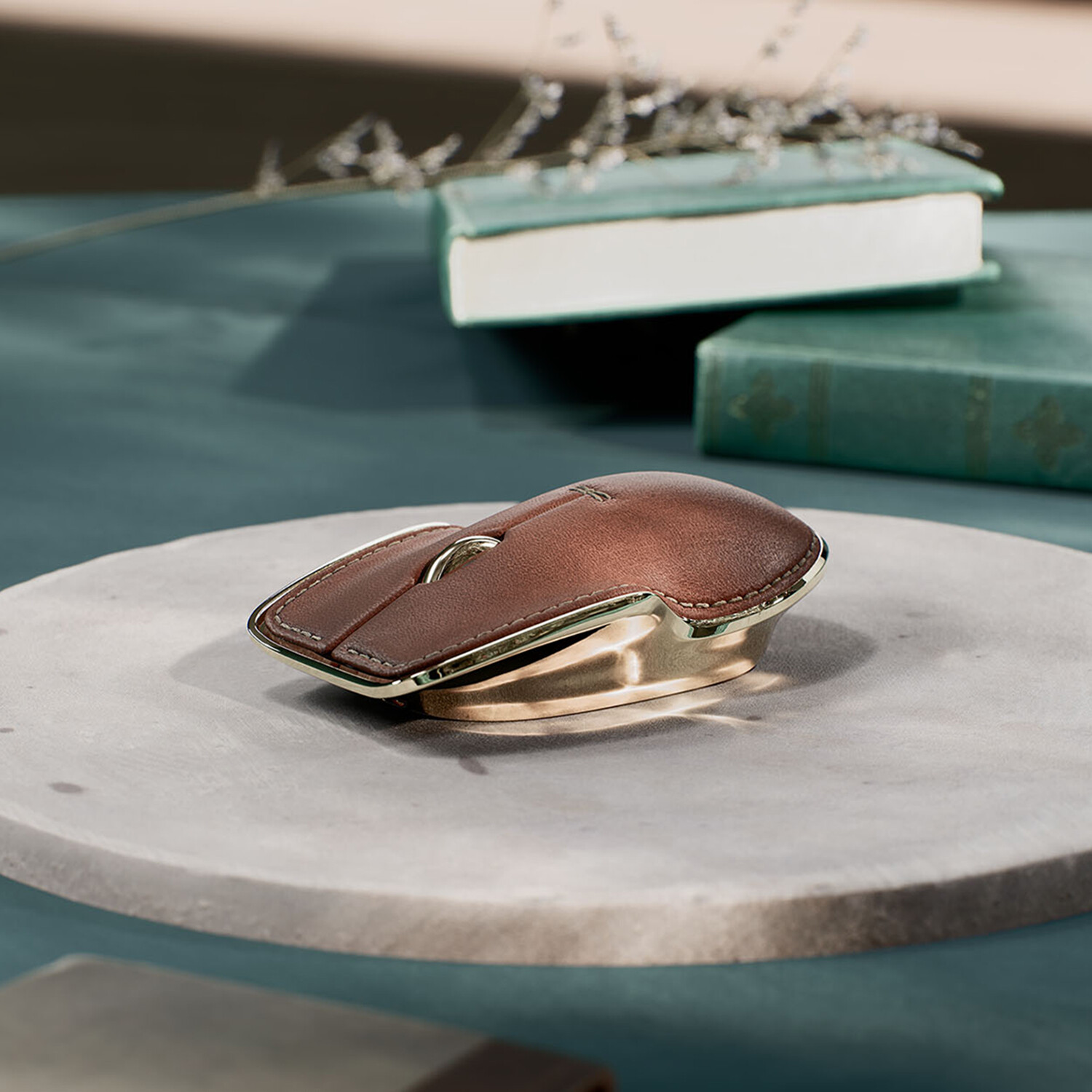 The Pointer Instrument features a full-grain calf leather top that's been finished with an equestrian-inspired stitching, and an uncoated brass shell, offering a luxury experience on one of the most common and often overlooked devices we use every day. This ambidextrous computer mouse is not only beautiful, but it's also a practical tool that supports the hand in its most relaxed position. It's designed to follow the natural arch of the hand, providing the perfect surface angle so your palm is comfortably resting on the surface. The Pointer Instrument is a fusion of art, practicality, and precision engineering.