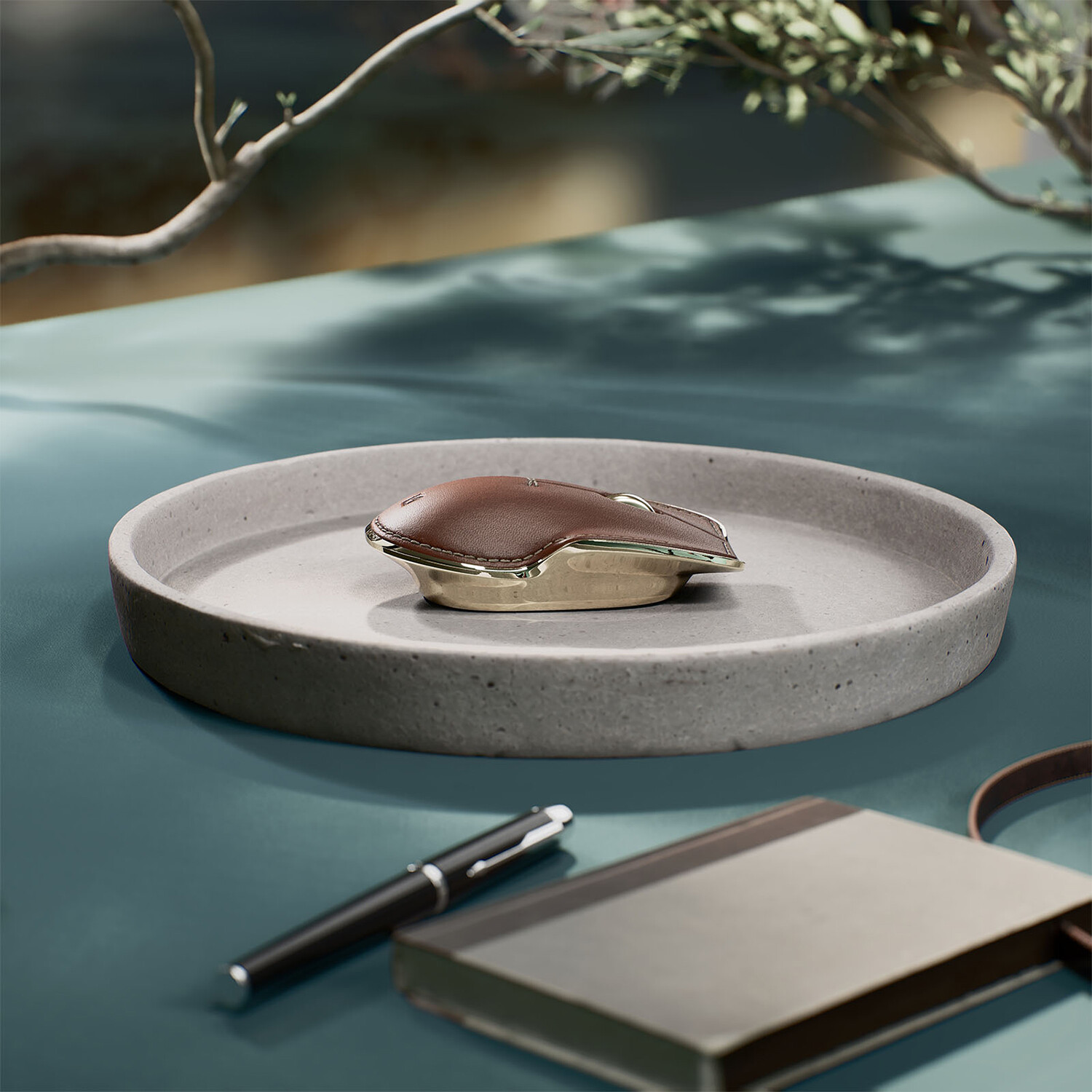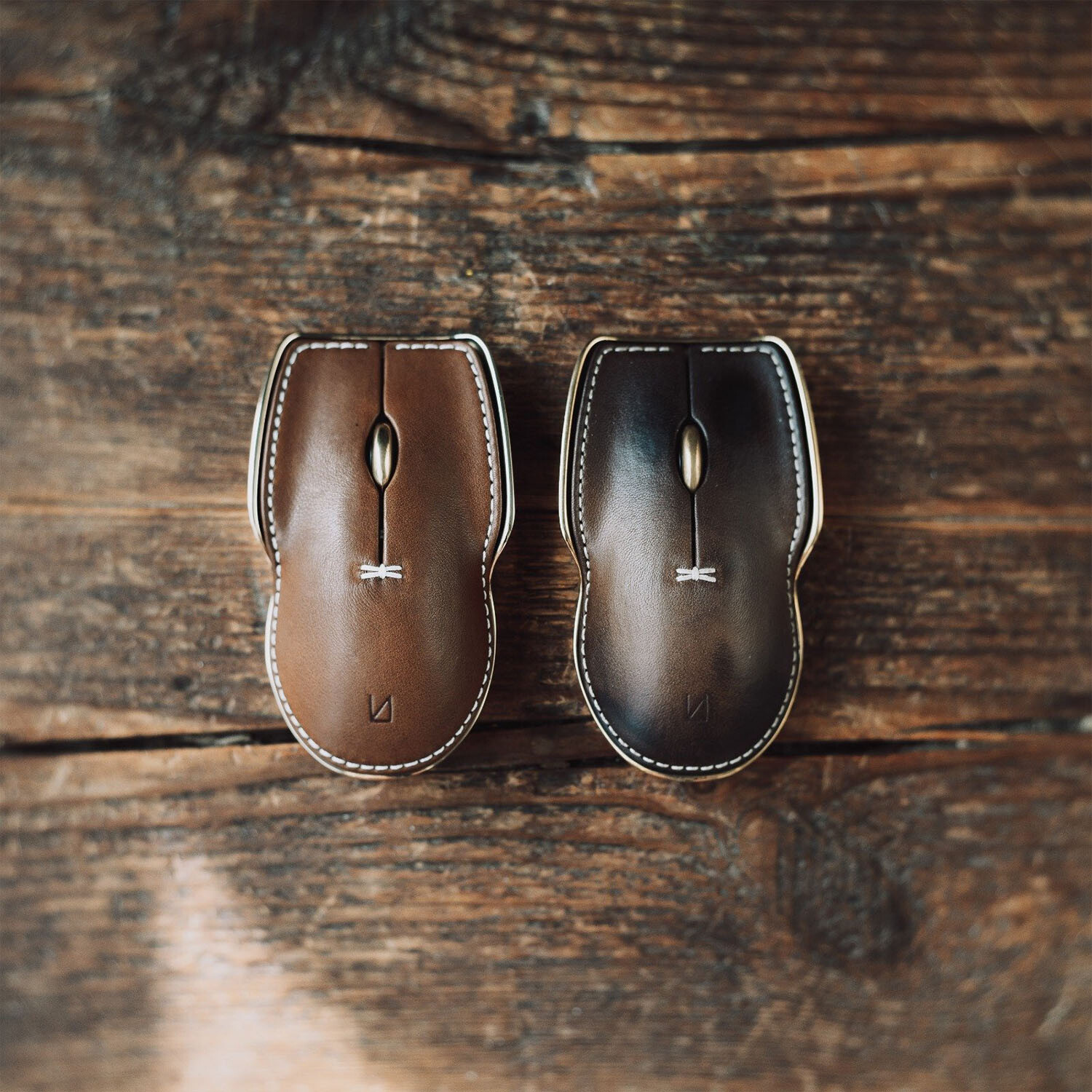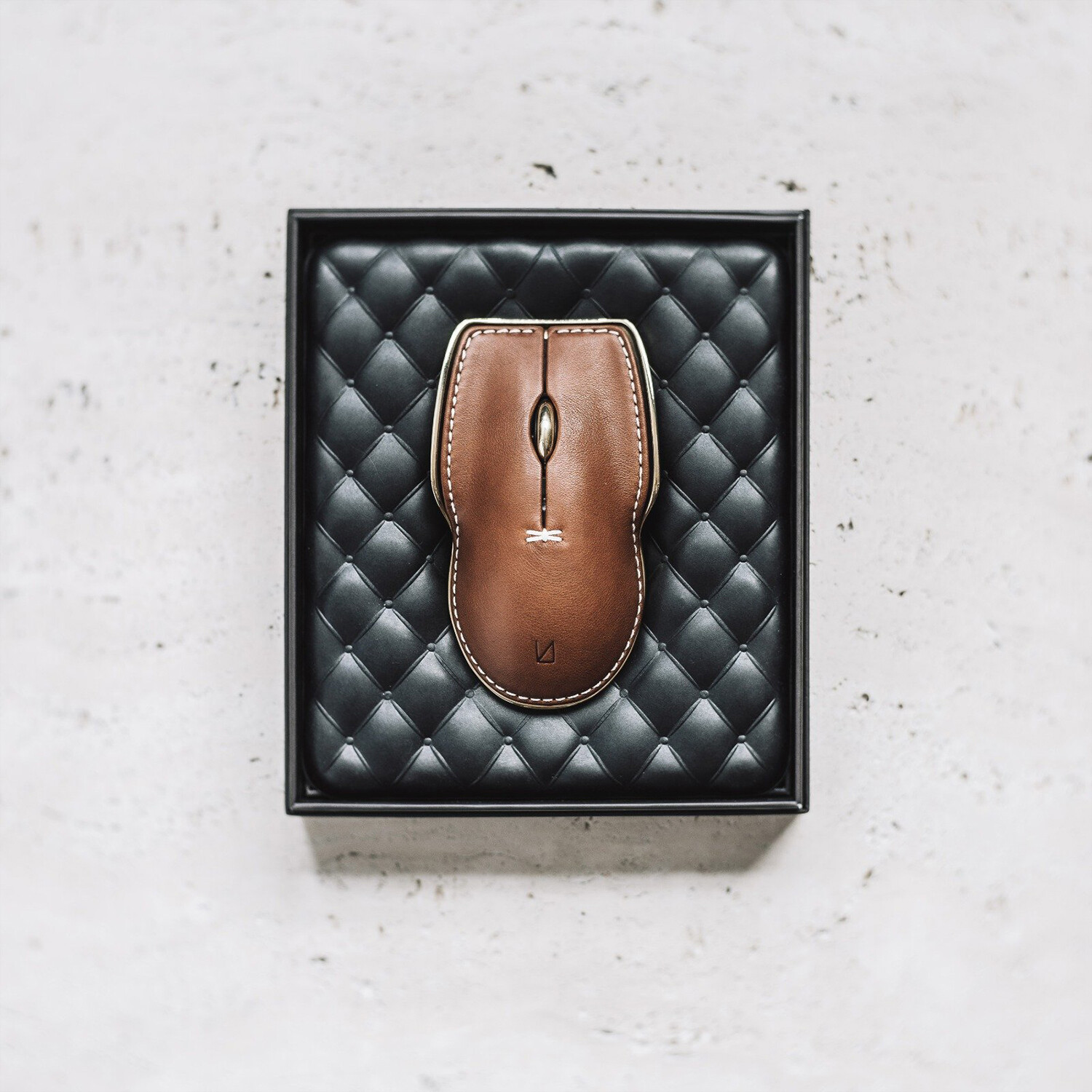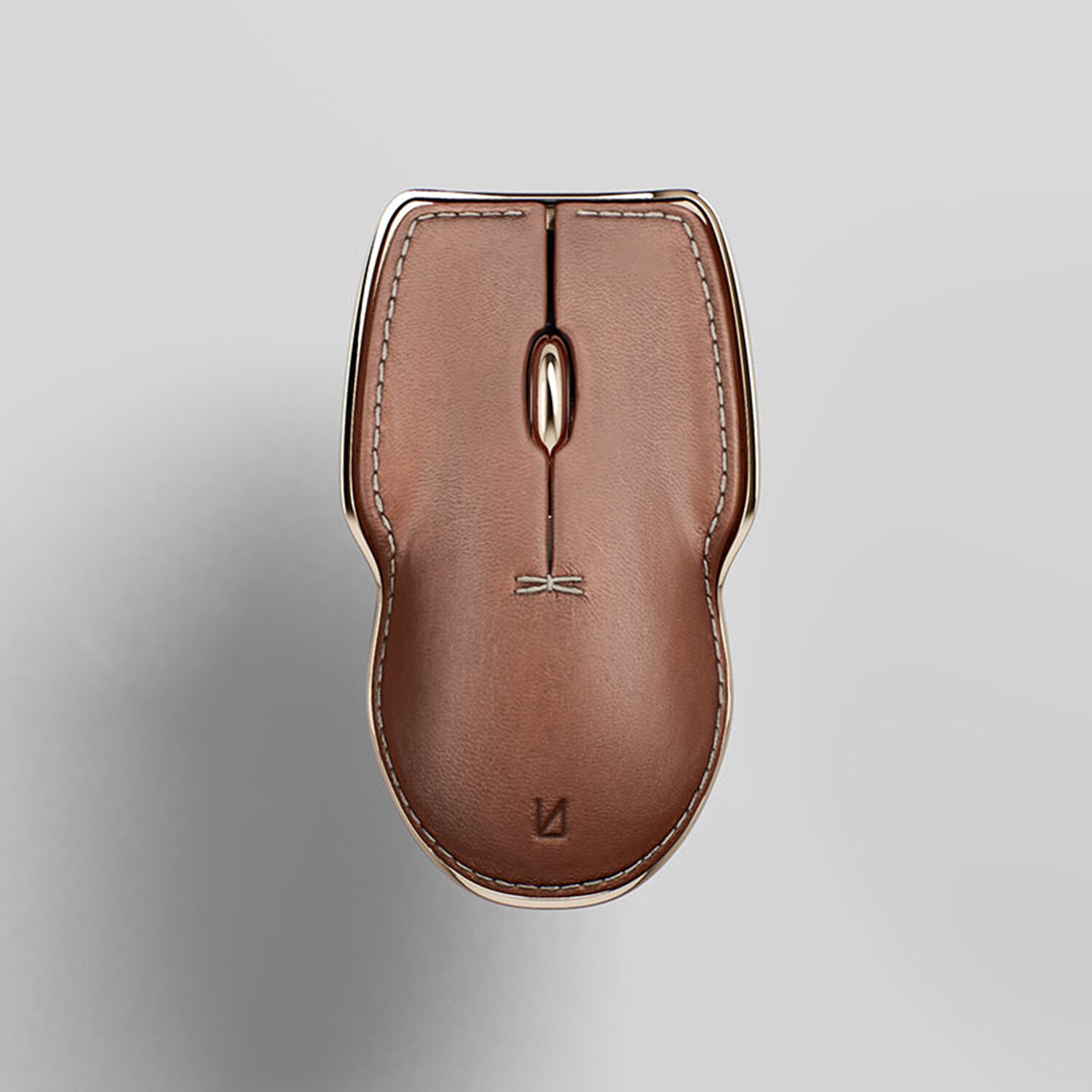 The Pointer Instrument features a full-grain calf leather top that's been finished with an equestrian-inspired stitching, and an uncoated brass shell, offering a luxury experience on one of the most common and often overlooked devices we use every day. This ambidextrous computer mouse is not only beautiful, but it's also a practical tool that supports the hand in its most relaxed position. It's designed to follow the natural arch of the hand, providing the perfect surface angle so your palm is comfortably resting on the surface. The Pointer Instrument is a fusion of art, practicality, and precision engineering.