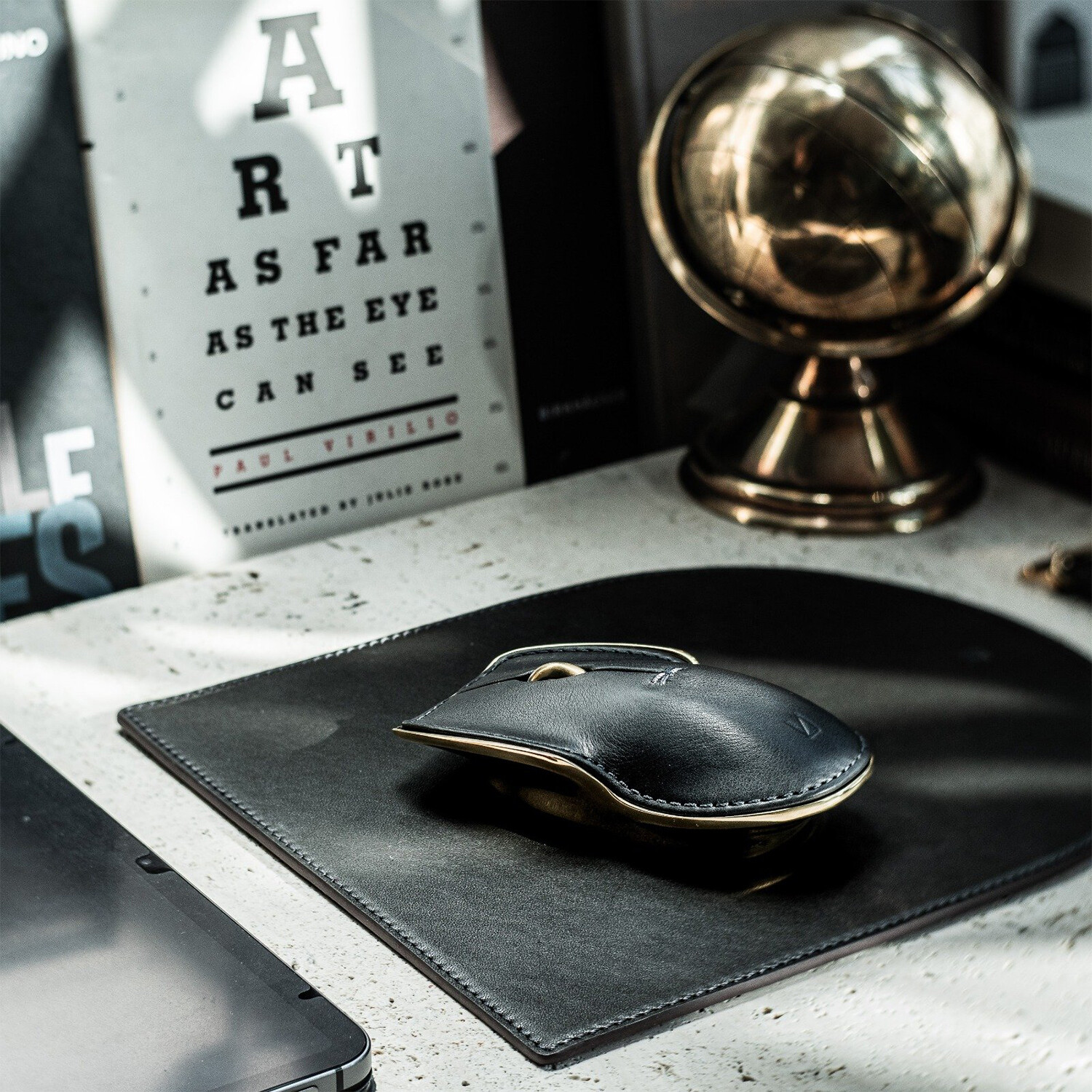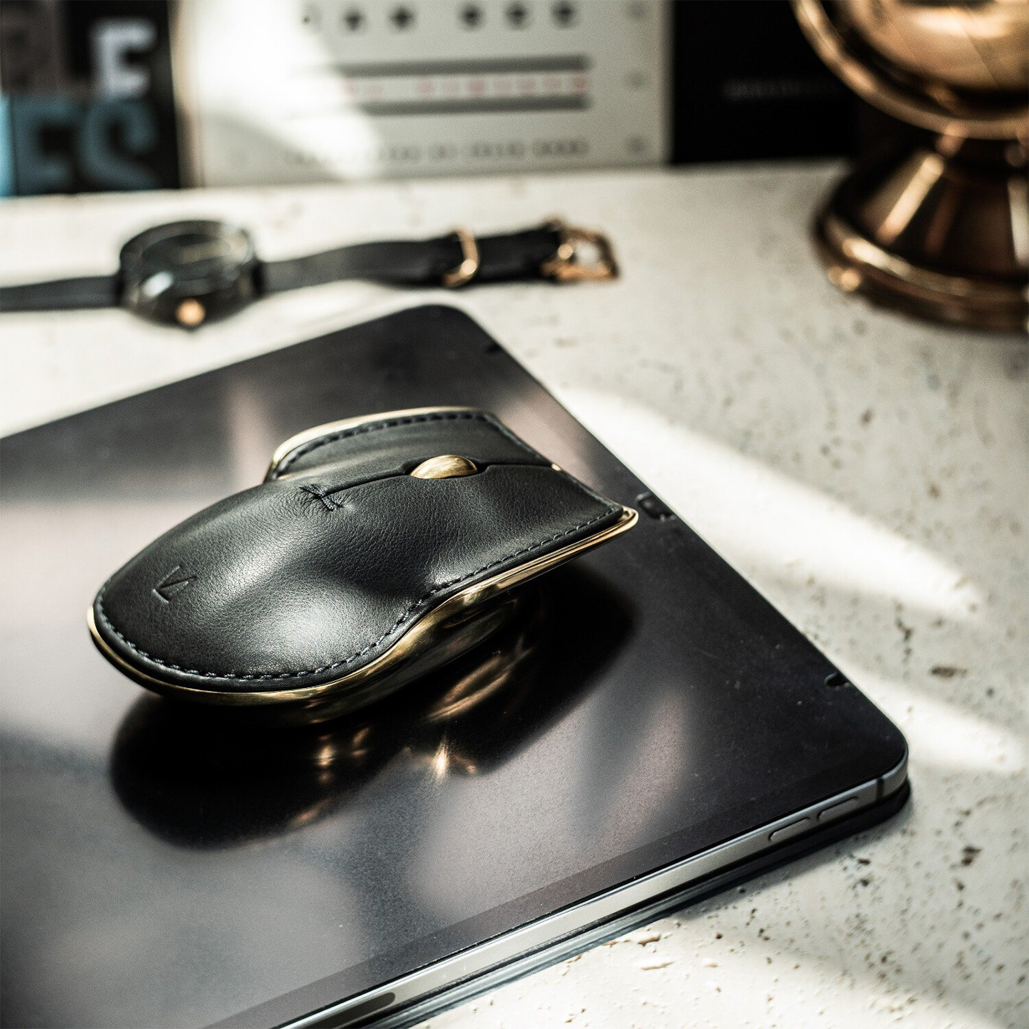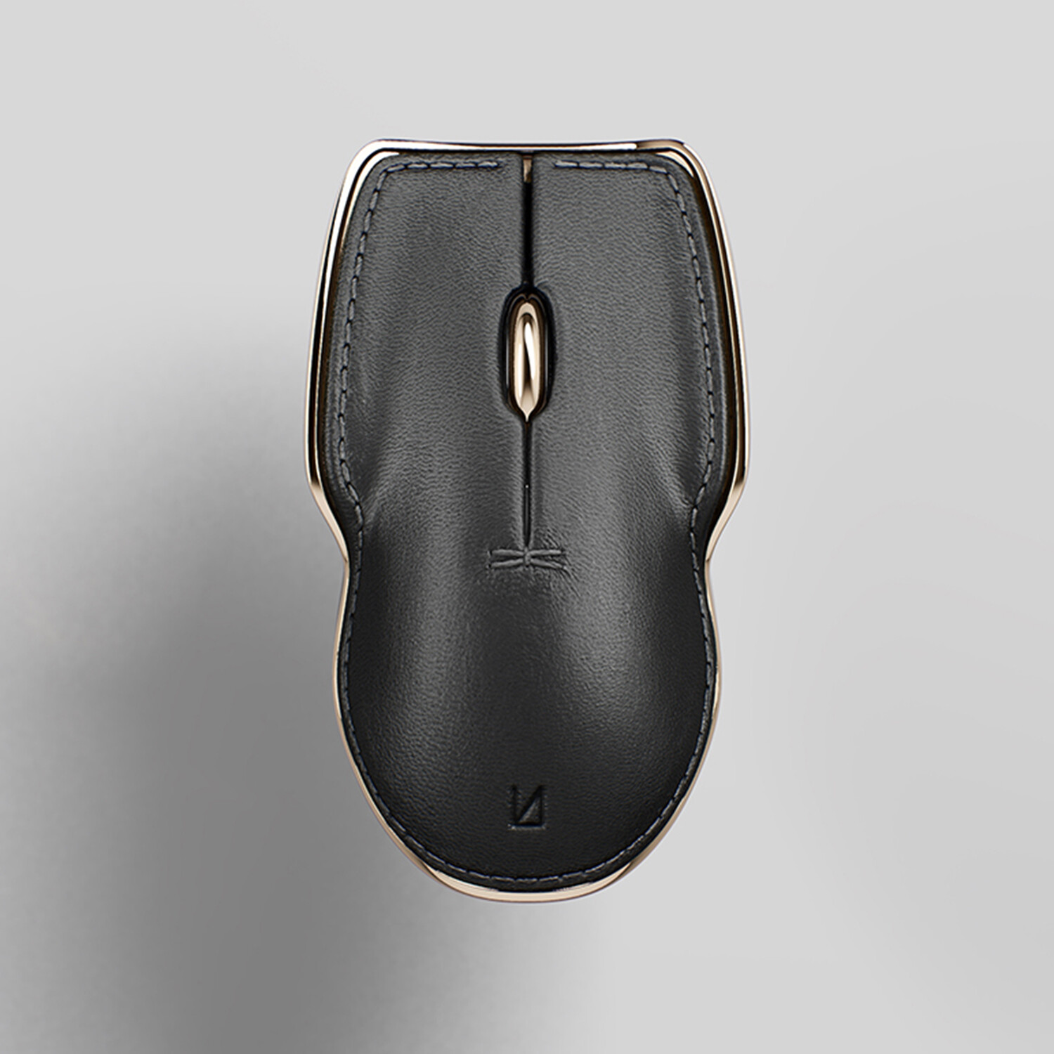 The Pointer Instrument features a full-grain calf leather top that's been finished with an equestrian-inspired stitching, and an uncoated brass shell, offering a luxury experience on one of the most common and often overlooked devices we use every day. This ambidextrous computer mouse is not only beautiful, but it's also a practical tool that supports the hand in its most relaxed position. It's designed to follow the natural arch of the hand, providing the perfect surface angle so your palm is comfortably resting on the surface. The Pointer Instrument is a fusion of art, practicality, and precision engineering.