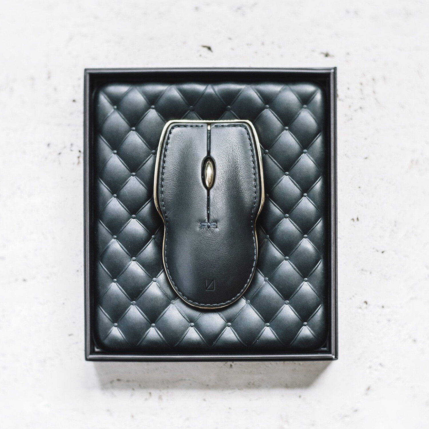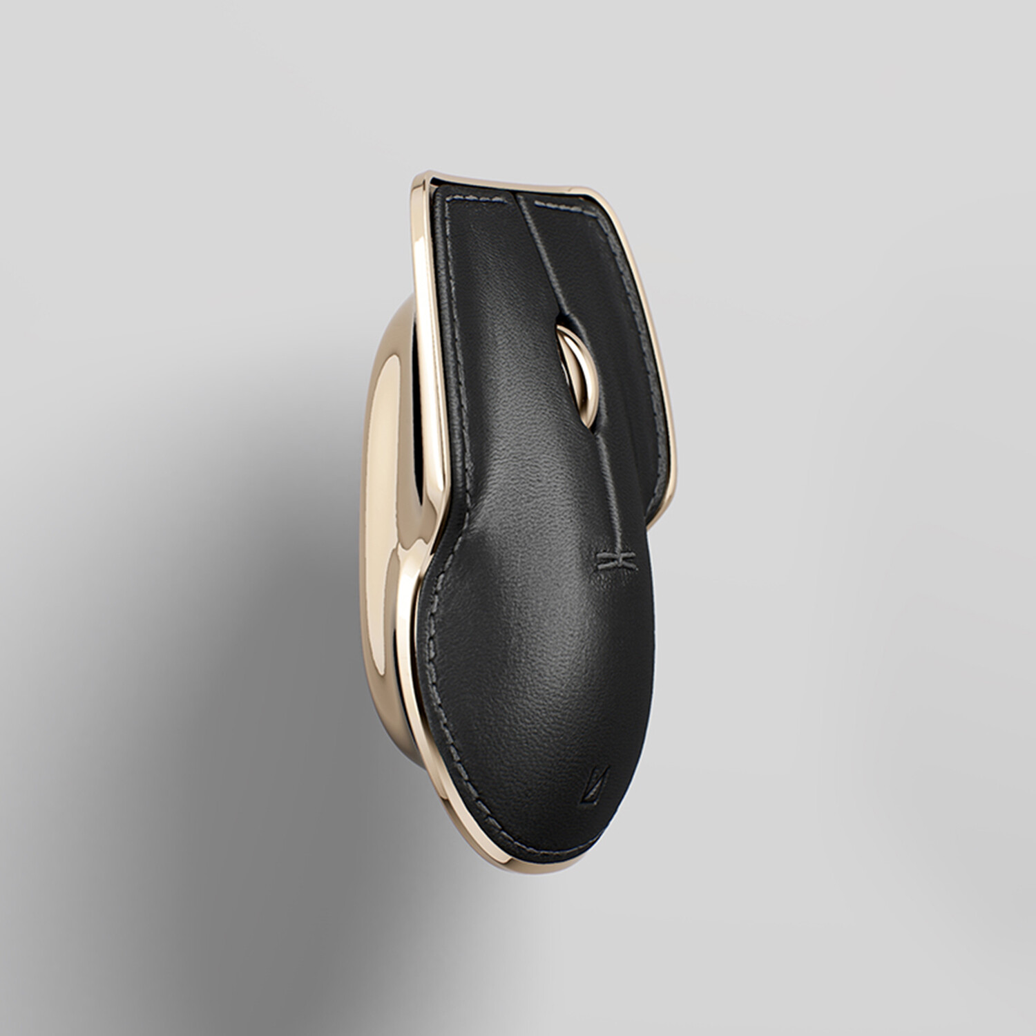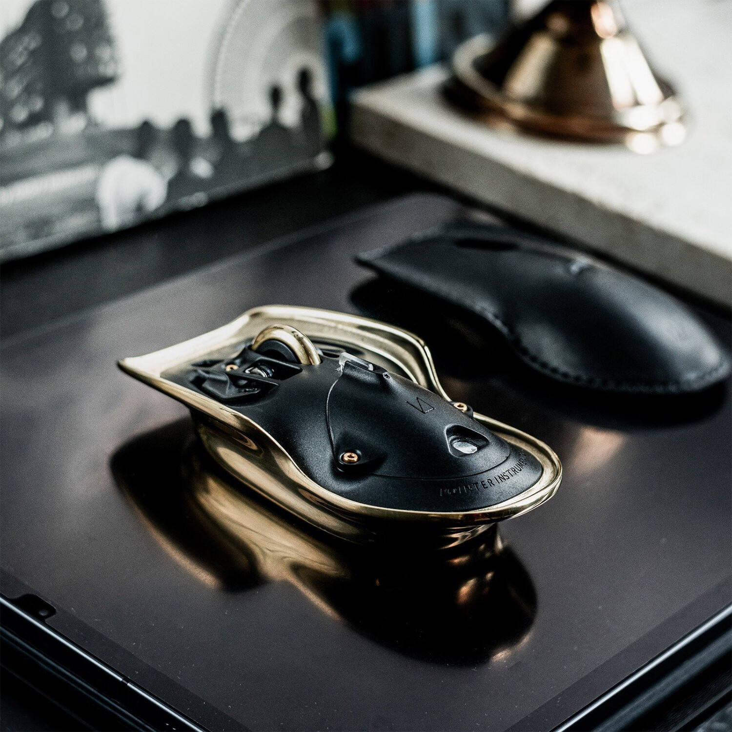 The Pointer Instrument features a full-grain calf leather top that's been finished with an equestrian-inspired stitching, and an uncoated brass shell, offering a luxury experience on one of the most common and often overlooked devices we use every day. This ambidextrous computer mouse is not only beautiful, but it's also a practical tool that supports the hand in its most relaxed position. It's designed to follow the natural arch of the hand, providing the perfect surface angle so your palm is comfortably resting on the surface. The Pointer Instrument is a fusion of art, practicality, and precision engineering.