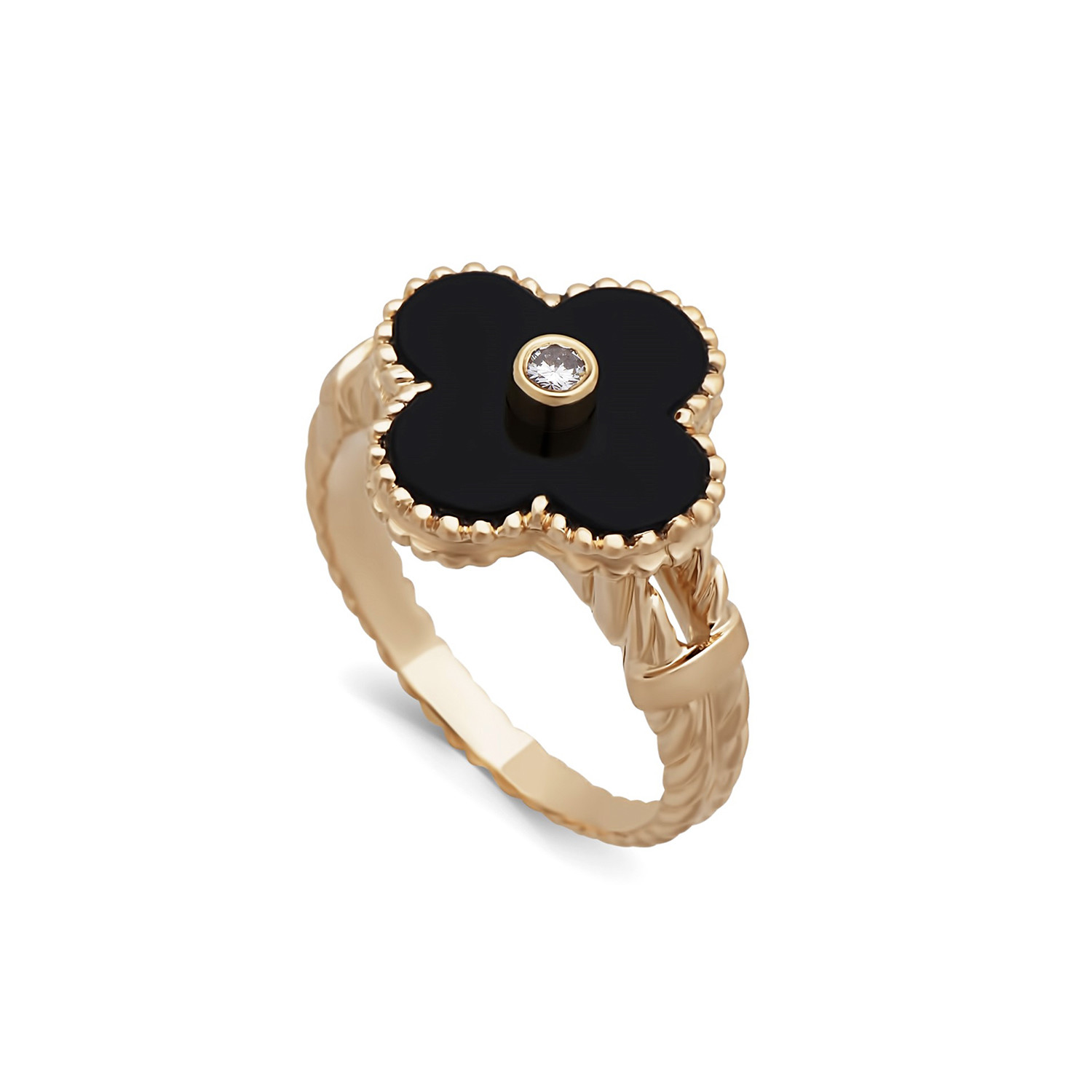 Vintage Van Cleef & Arpels 18k Yellow Gold Alhambra Diamond + Onyx Ring // Ring Size: 6