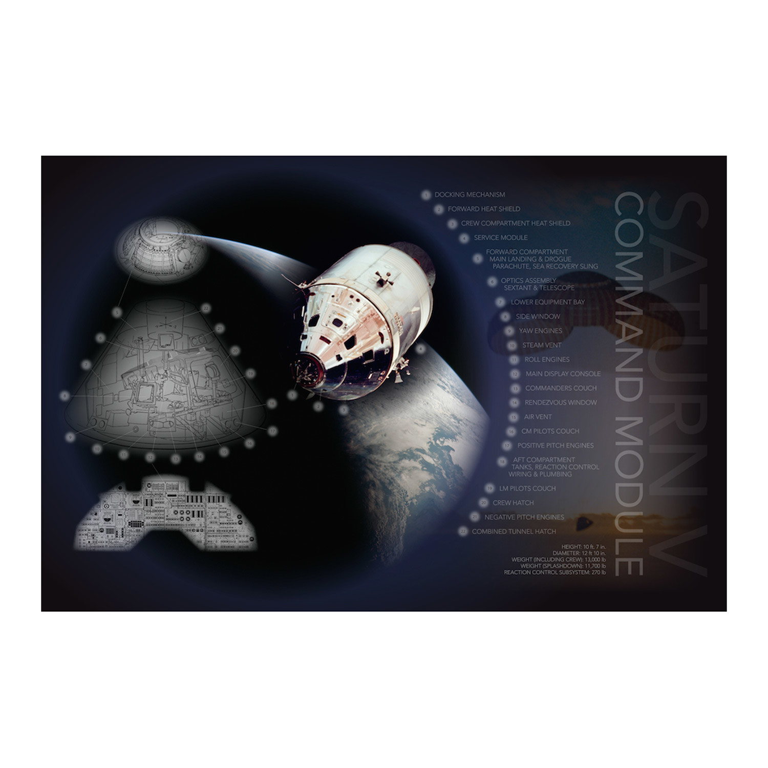 Printed on 100-Year archival gloss photo paper, this space-inspired Saturn V Command Module poster print is just the thing to jumpstart your creativity and decorate your space. With it, you'll never lose sight of the infinite possibilities out there.