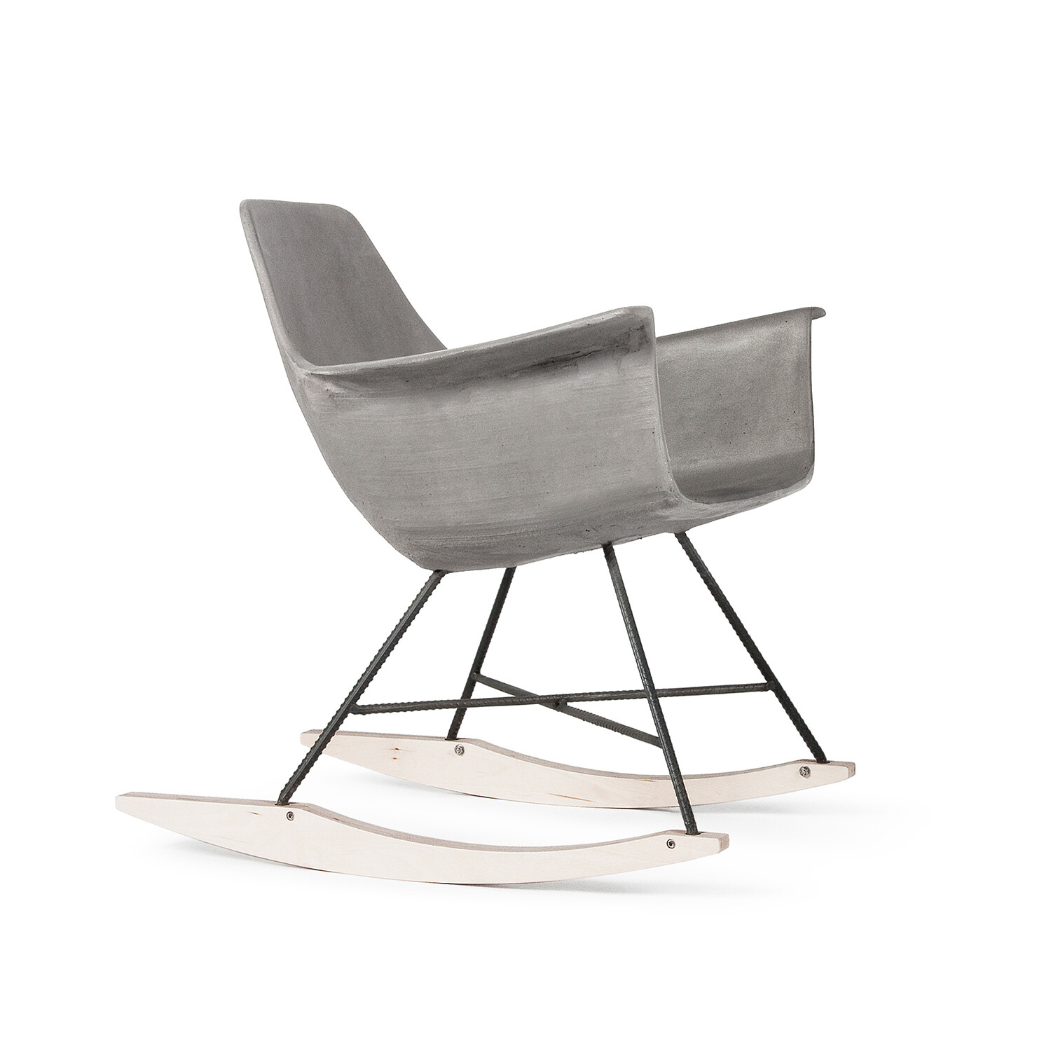 The Concrete Hauteville Rocking Chair, designed by Henri Lavallard Boget for Lyon Beton, draws inspiration from iconic mid-century design with a modern twist. Constructed with a concrete shell, rebar legs and plywood runners, the concrete chair's composition brings to light the unique qualities of industrial materials and repurposes the unpolished, raw materials to create a minimal and contemporary chair. Despite the use of unconventional materials, the concrete rocking chair has an incredibly ergonomic and comfortable seat, while ultra-fine sanding gives it a smooth finish. Versatile enough for practically any space, this minimalist design will leave an impression everywhere it goes.