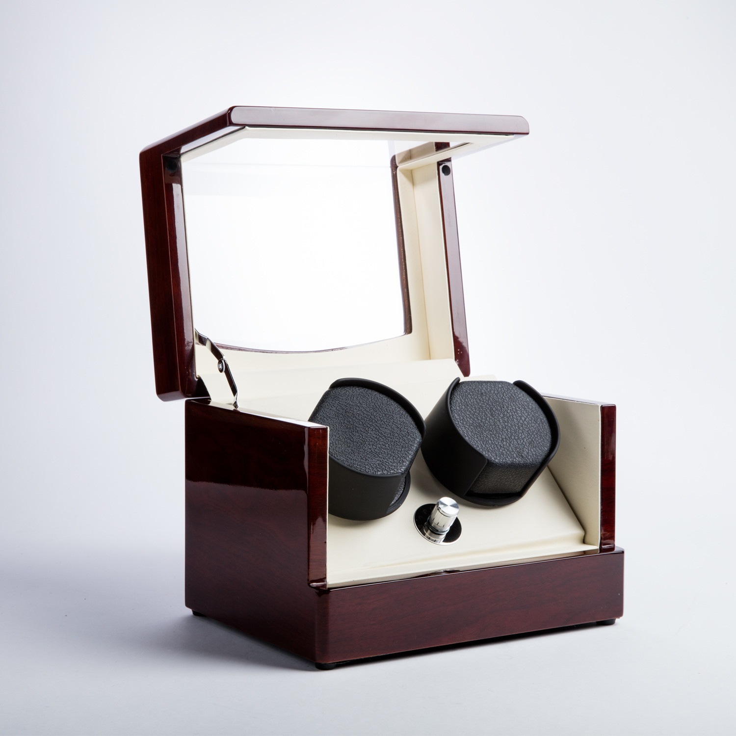 This dark walnut, high gloss watch winder features an ivory leatherette interior. Two independent Japanese motors with five setting rotation controls provide accurate, precision winding. This winder is powered by the supplied 110V AC adapter, and features battery back-up.