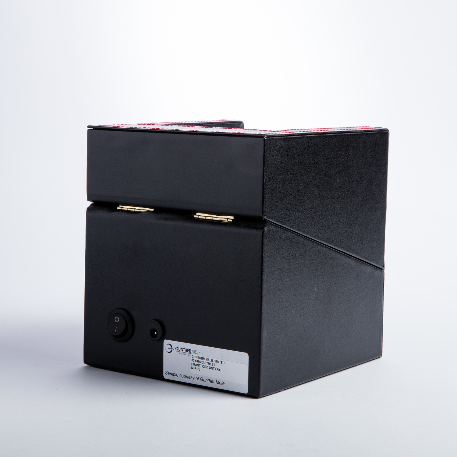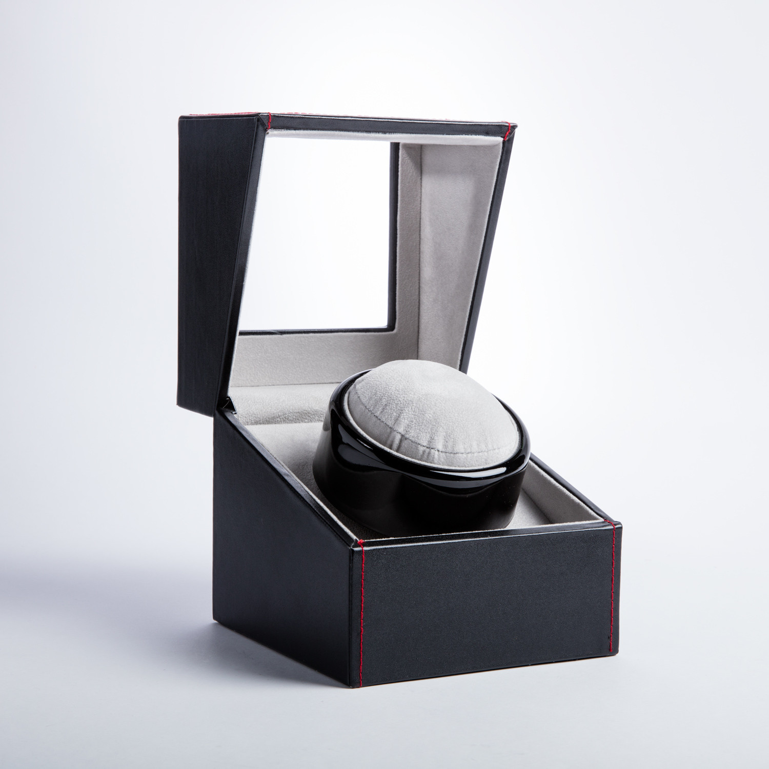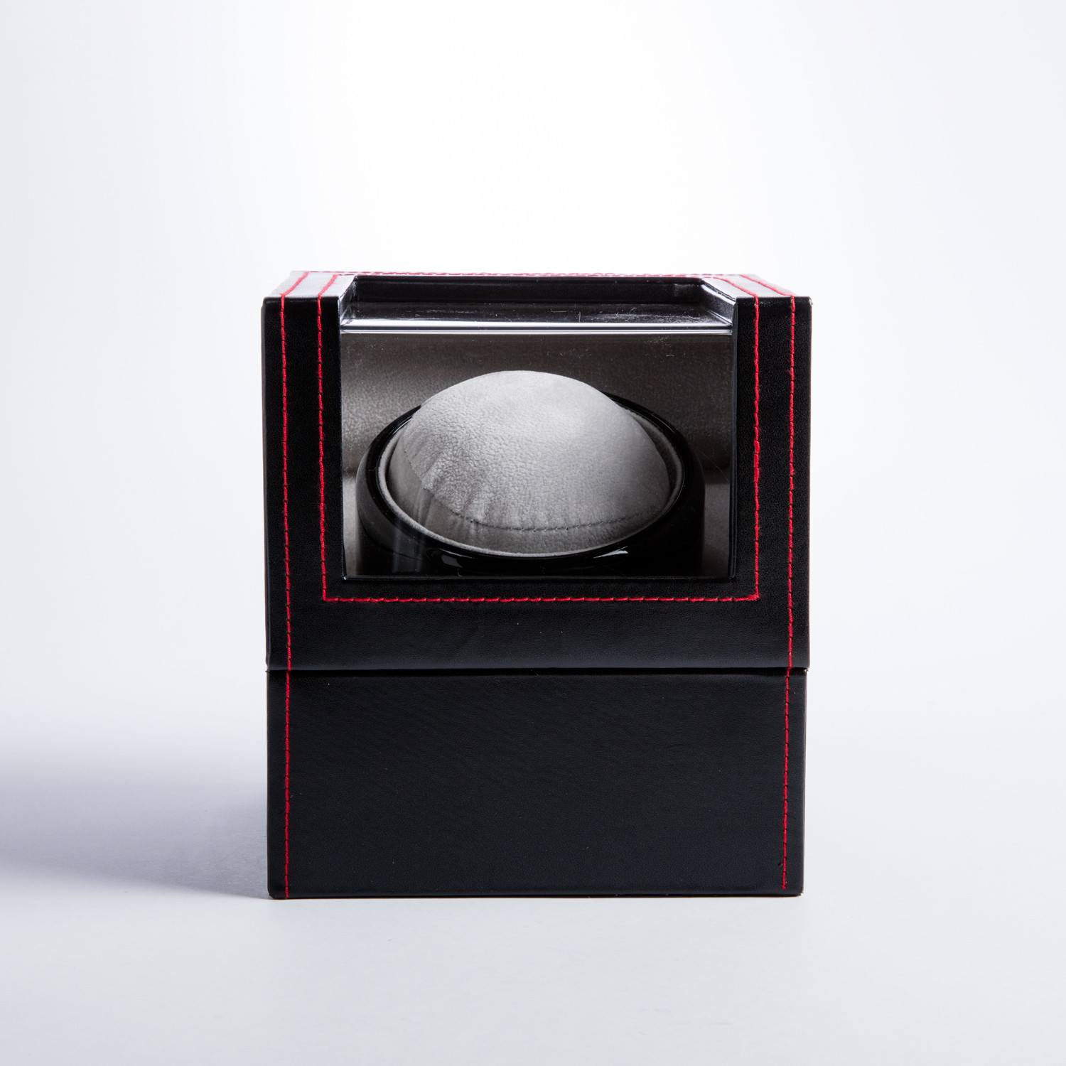 The Raymond Watch Winder features a black leatherette exterior, red accent stitching, and a soft grey interior. A large angular clear window displays your precious timepieces, and its 110V AC winder ensures they are wound when needed.