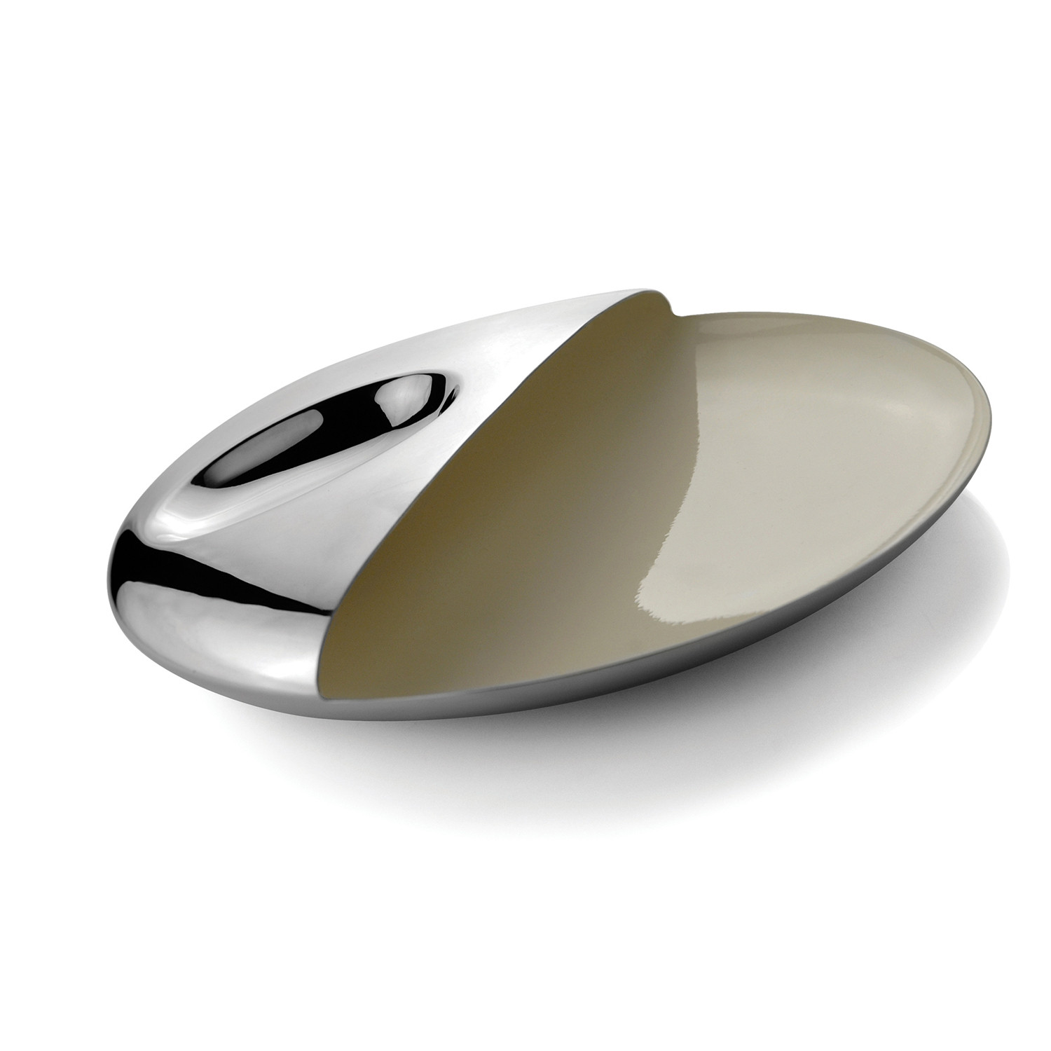 Stylish and practical, this stainless steel platter has a dip receptacle on top and a white coated base with plenty of room for chips and crackers underneath. Designed by Robert GiacoMucci, it's convenient for serving with style.