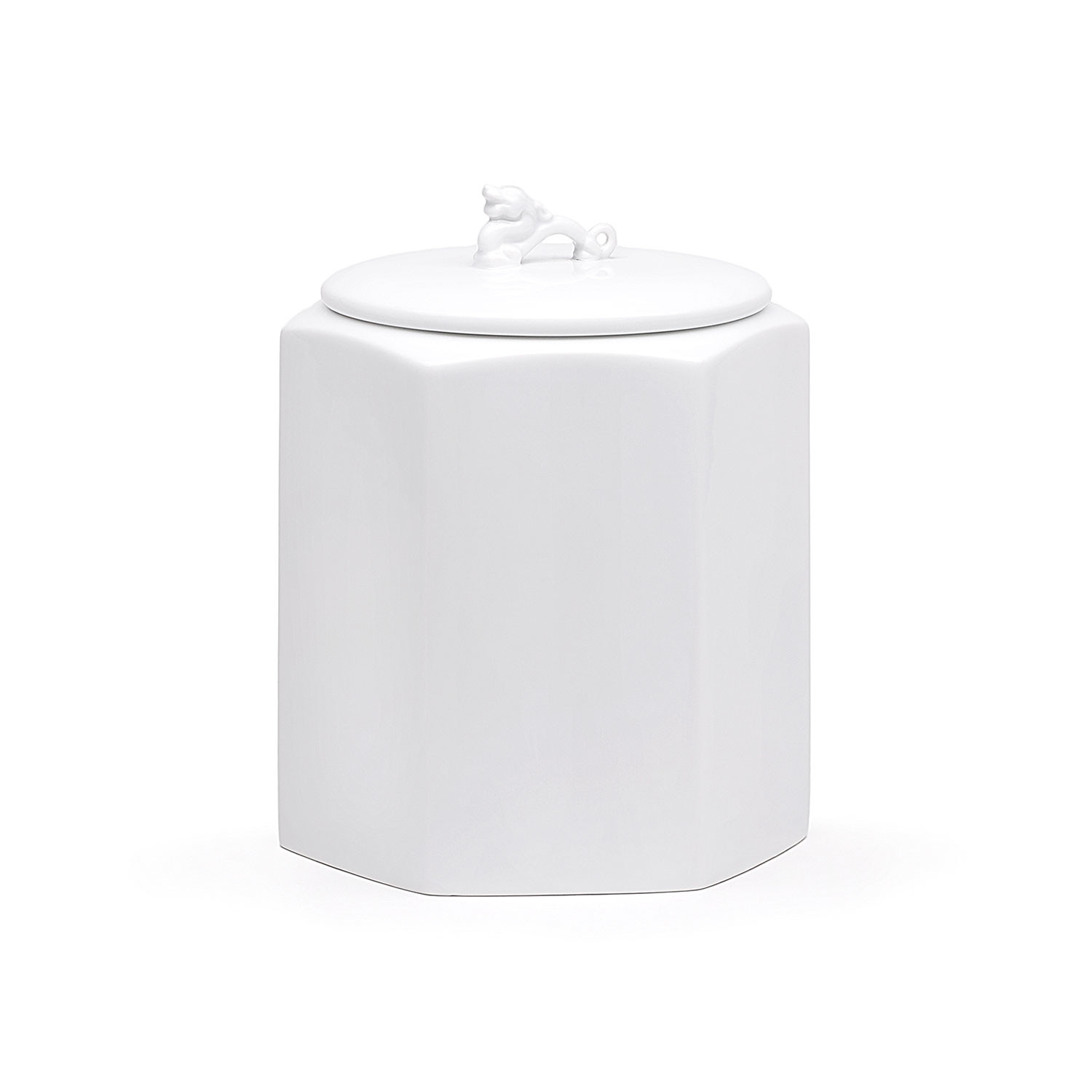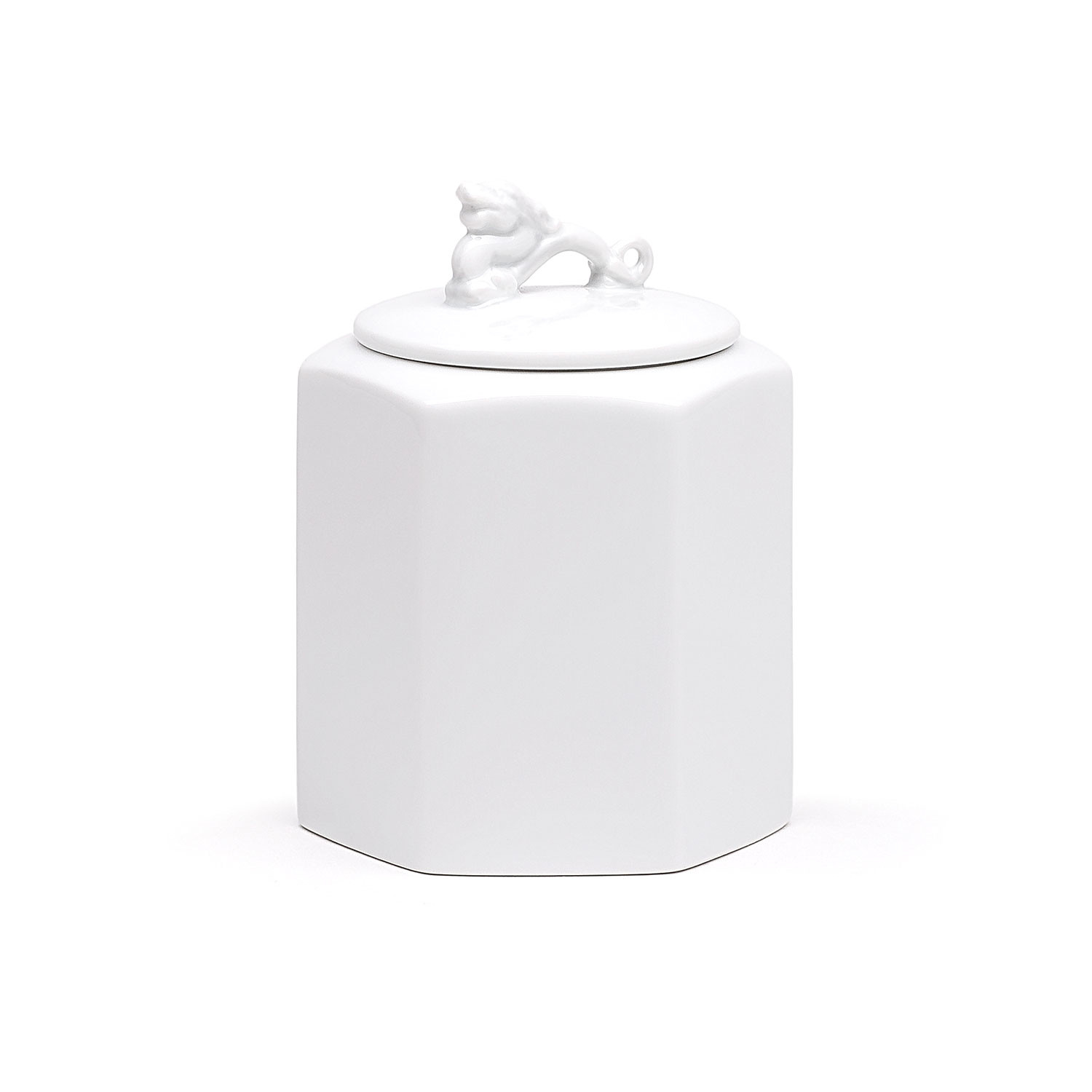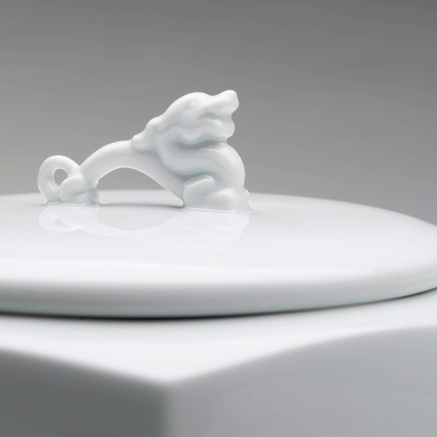 Exquisitely executed in fine porcelain, this small, hexagonal storage jar is ideal for storing tea or other goodies. Guarded on the lid by a small dragon, these unique jars add a decorative touch anywhere in your home.